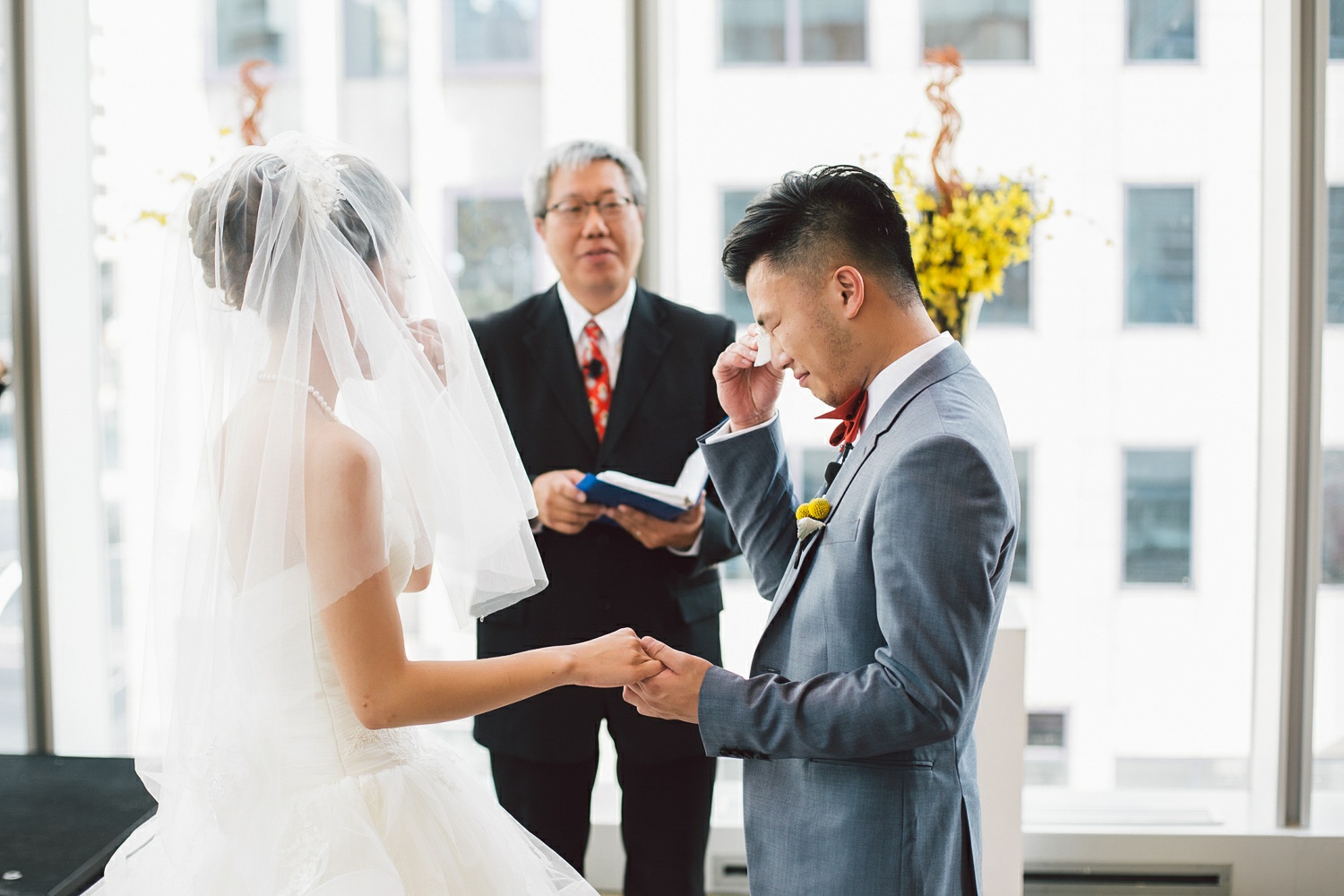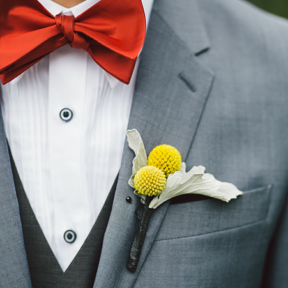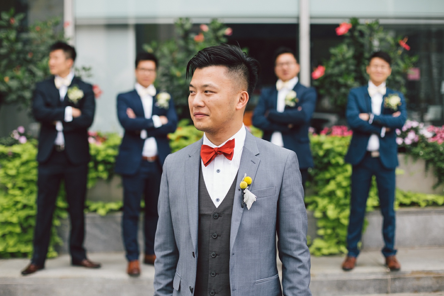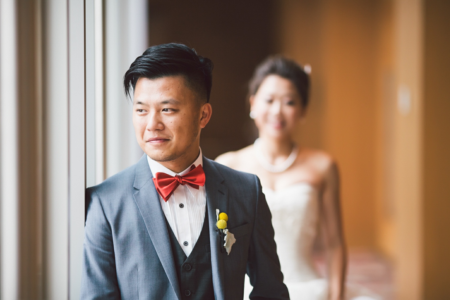 Cynthia and Michael tied the knot at the posh and luxurious Shangri-La Hotel Toronto, which also served as the venue for their wedding reception. But before the momentous event, the bride and groom got ready to be the best versions of themselves for their very special day. Cynthia’s makeup was sophistically done by Vivian Wu. Her beautiful almond eyes and naturally high cheekbones were accentuated and not overly done so she looked positively glowing and gorgeously blooming. Her hair, which was also prepared by the same makeup artist was donned in an elegant bun with a French braid at each side of her head and red ornate flowers to complete her elegant hairdo. Michael sported a classic, Paul Smith tuxedo in the shade of gray and a red bowtie. His hair was in a handsome quiff which made him look awesome and dashing. He finished his overall look with Yellow Craspedia Billy Button flowers accenting his formal wear, an adorable pair of striped, multi-colored socks and vintage-styled pair of brown shoes.