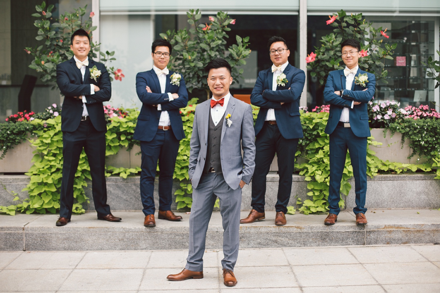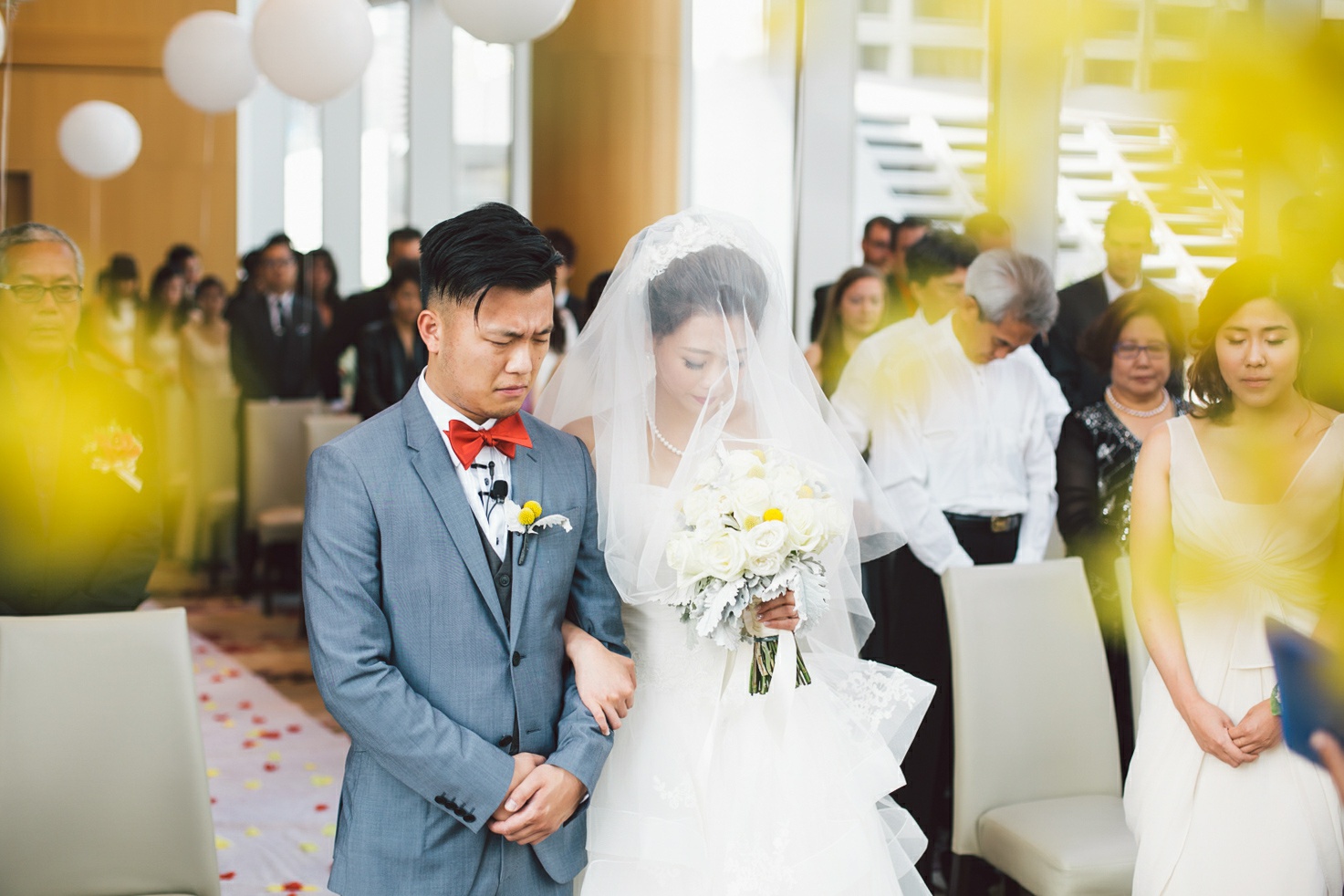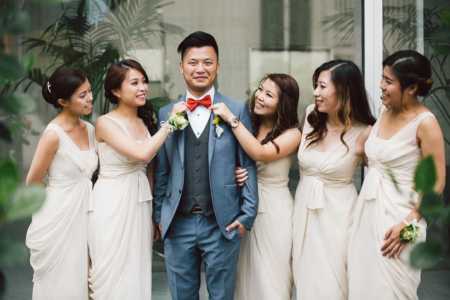 Cynthia and Michael tied the knot at the posh and luxurious Shangri-La Hotel Toronto, which also served as the venue for their wedding reception. But before the momentous event, the bride and groom got ready to be the best versions of themselves for their very special day. Cynthia’s makeup was sophistically done by Vivian Wu. Her beautiful almond eyes and naturally high cheekbones were accentuated and not overly done so she looked positively glowing and gorgeously blooming. Her hair, which was also prepared by the same makeup artist was donned in an elegant bun with a French braid at each side of her head and red ornate flowers to complete her elegant hairdo. Michael sported a classic, Paul Smith tuxedo in the shade of gray and a red bowtie. His hair was in a handsome quiff which made him look awesome and dashing. He finished his overall look with Yellow Craspedia Billy Button flowers accenting his formal wear, an adorable pair of striped, multi-colored socks and vintage-styled pair of brown shoes.