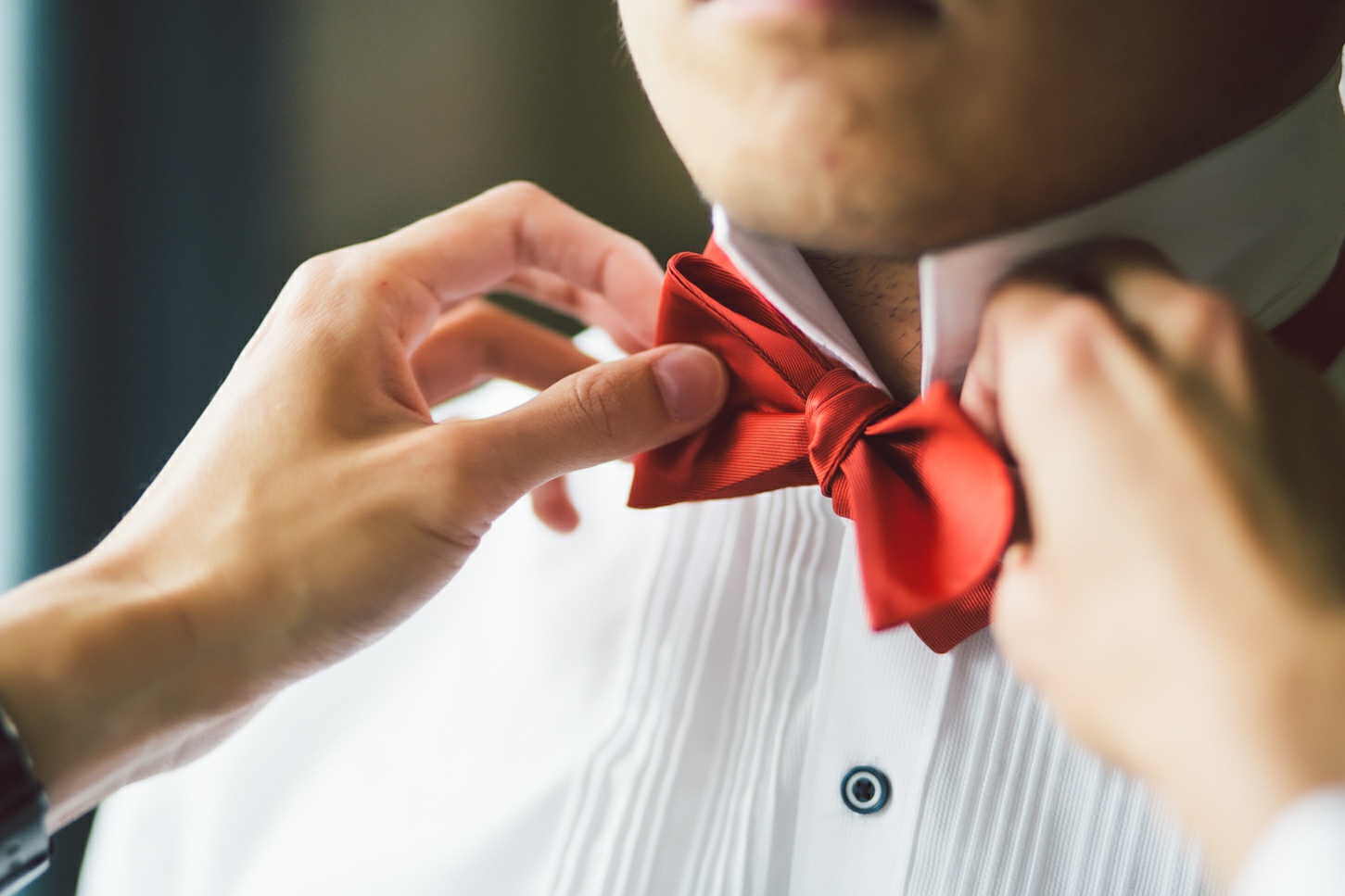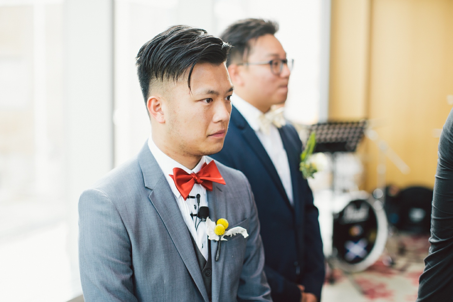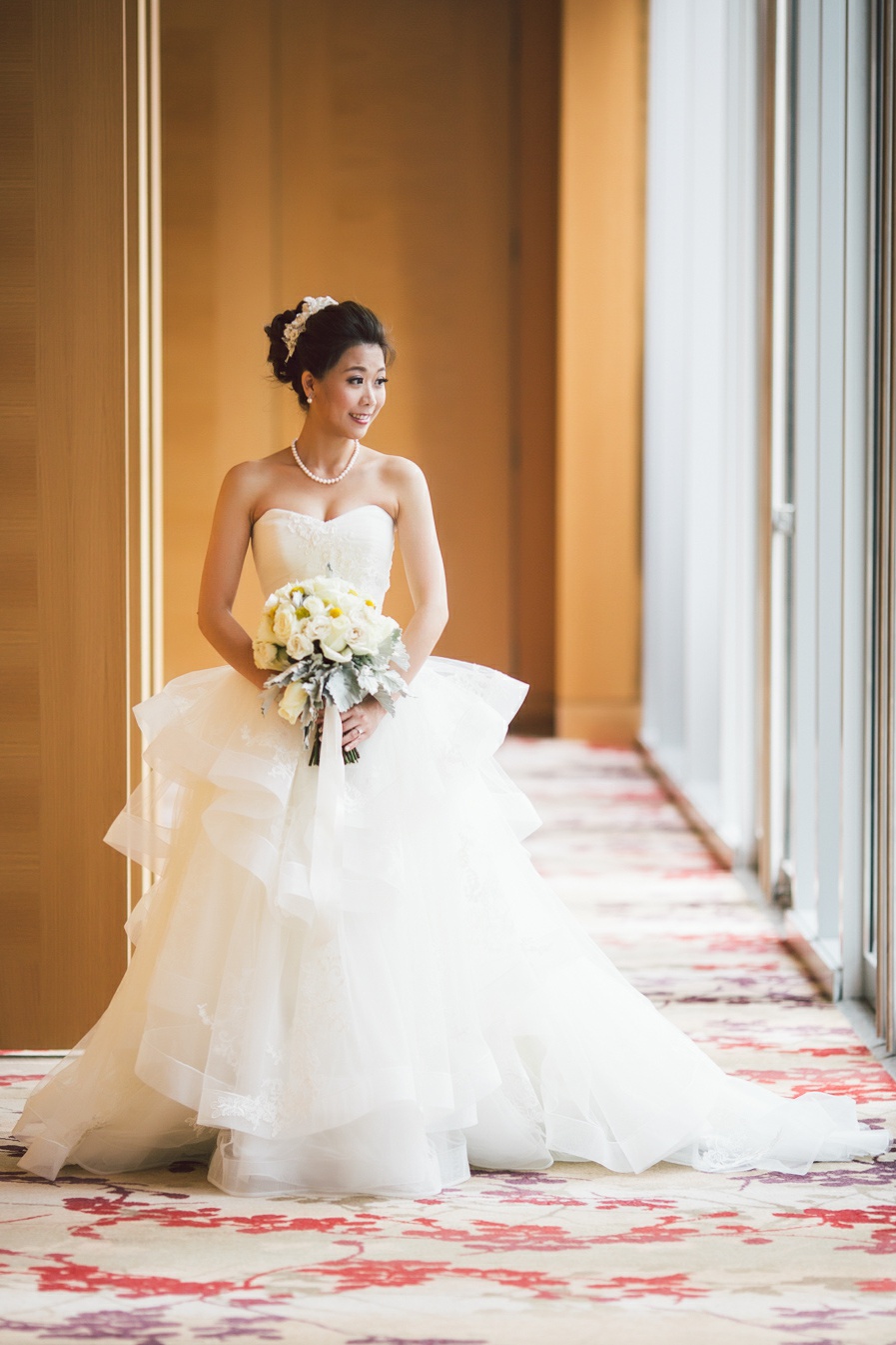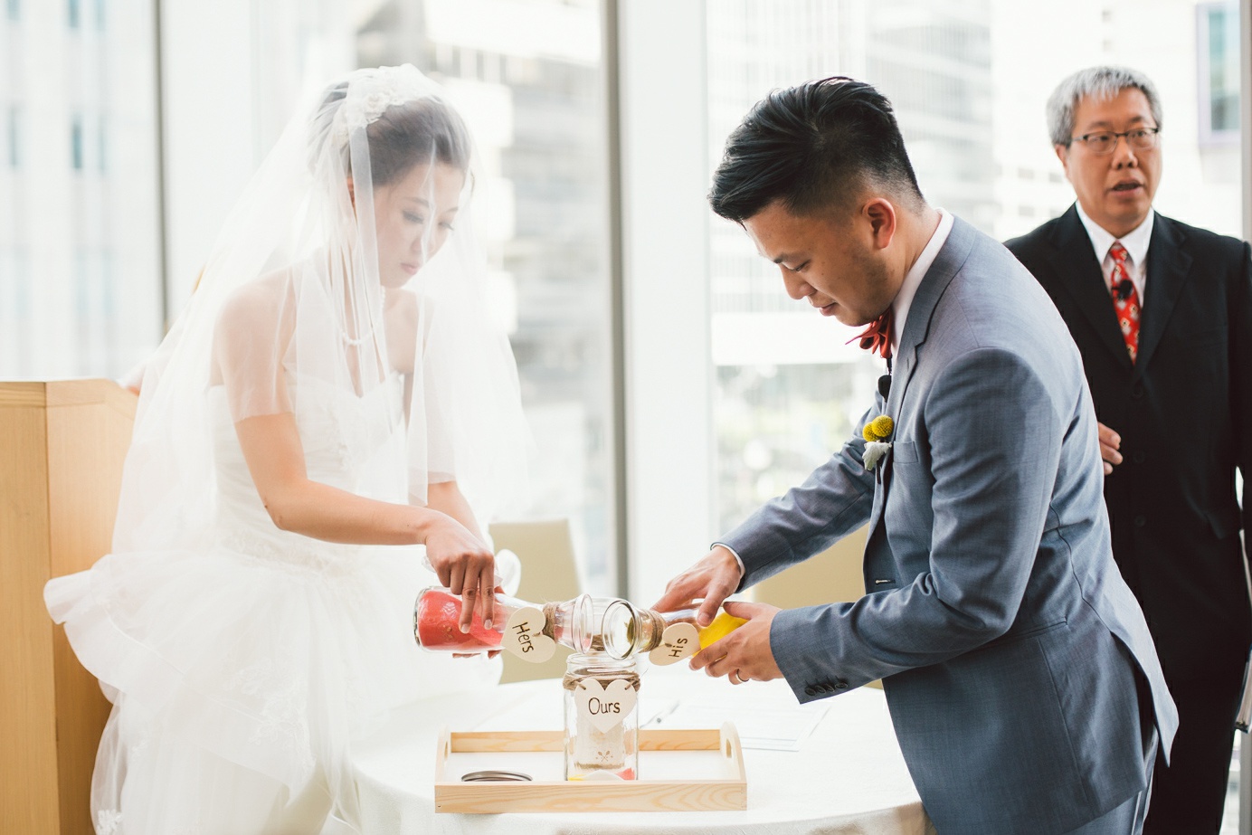 Cynthia and Michael tied the knot at the posh and luxurious Shangri-La Hotel Toronto, which also served as the venue for their wedding reception. But before the momentous event, the bride and groom got ready to be the best versions of themselves for their very special day. Cynthia’s makeup was sophistically done by Vivian Wu. Her beautiful almond eyes and naturally high cheekbones were accentuated and not overly done so she looked positively glowing and gorgeously blooming. Her hair, which was also prepared by the same makeup artist was donned in an elegant bun with a French braid at each side of her head and red ornate flowers to complete her elegant hairdo. Michael sported a classic, Paul Smith tuxedo in the shade of gray and a red bowtie. His hair was in a handsome quiff which made him look awesome and dashing. He finished his overall look with Yellow Craspedia Billy Button flowers accenting his formal wear, an adorable pair of striped, multi-colored socks and vintage-styled pair of brown shoes.