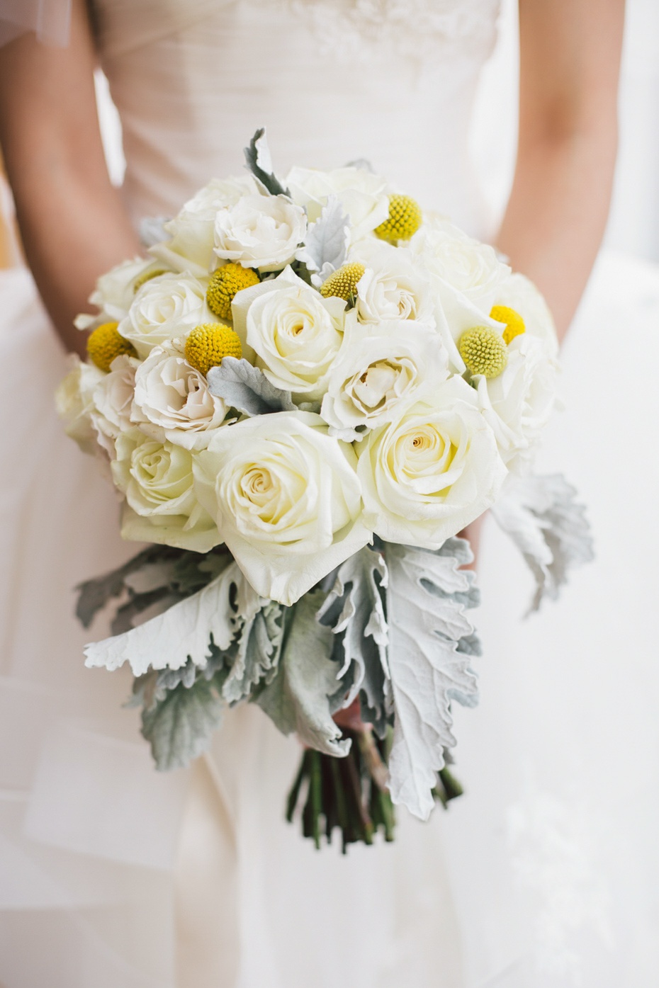 Cynthia changed into her Vera Wang Bridal Gown for the main celebration. The dress looked absolutely stunning with its heart-shaped tube couture, with layers flawlessly cascading from the hips down to the floor. Her hairdo was changed into a classy bun with white, flowery headdress perched on top of the chignon. Her gorgeous set of pearl jewelry made her look effortlessly exquisite together with her white, attractive shoes from Prada which had bejeweled high heels. Cynthia’s bouquet of fresh, white roses highlighted by the same Yellow Craspedia Billy Button flowers on Michael’s were the perfect contrast to the bride’s elegant wedding dress.
