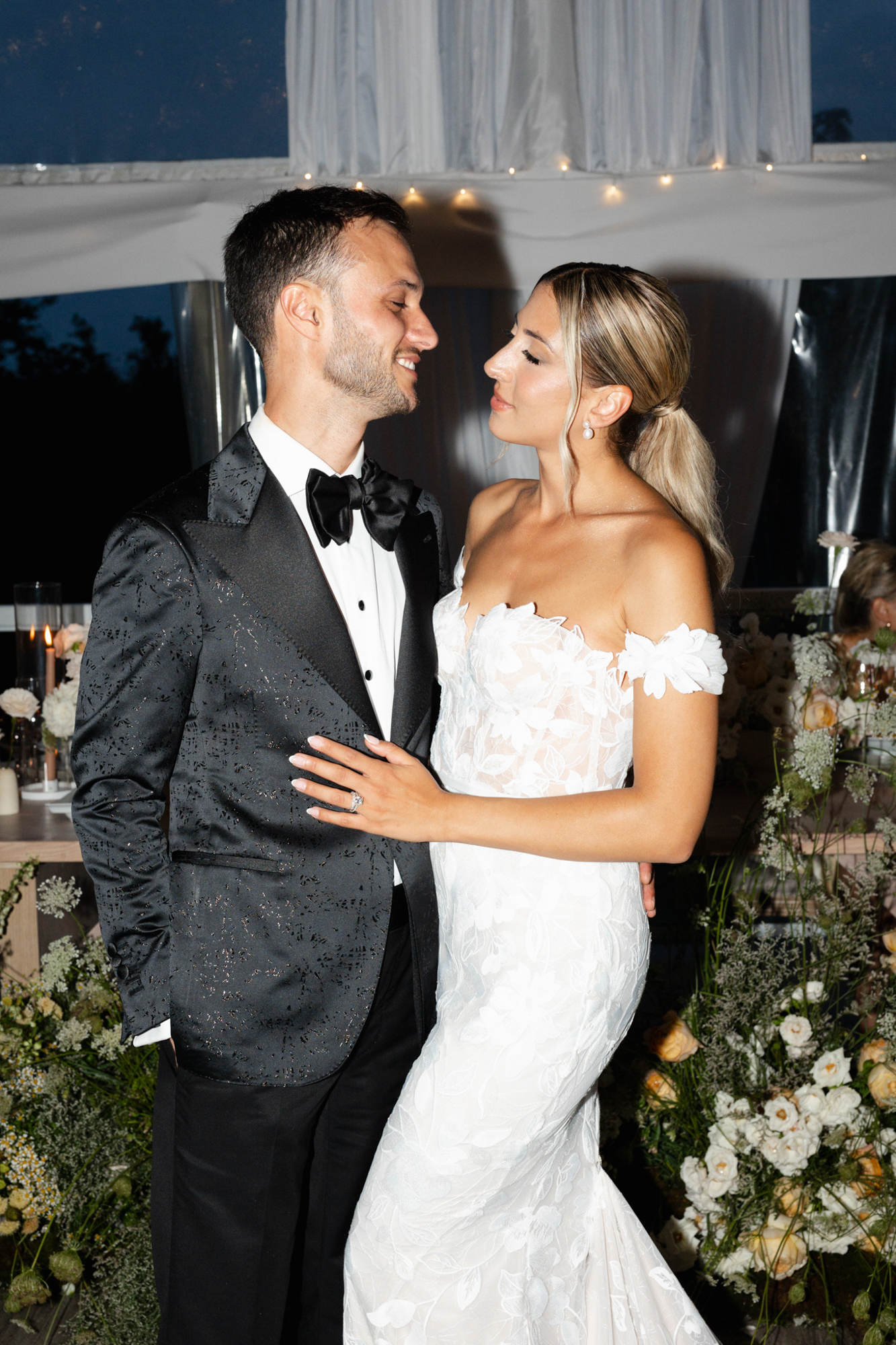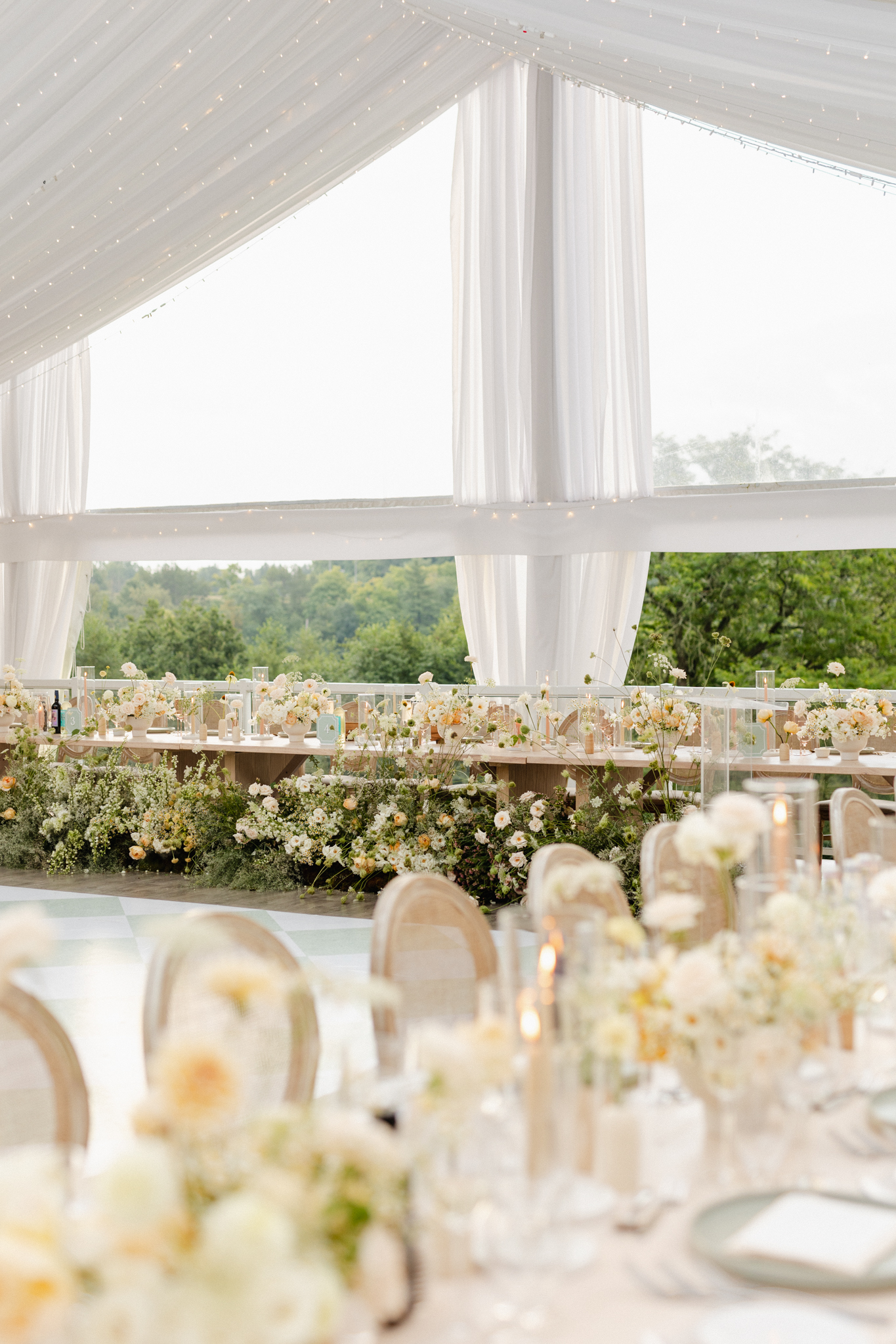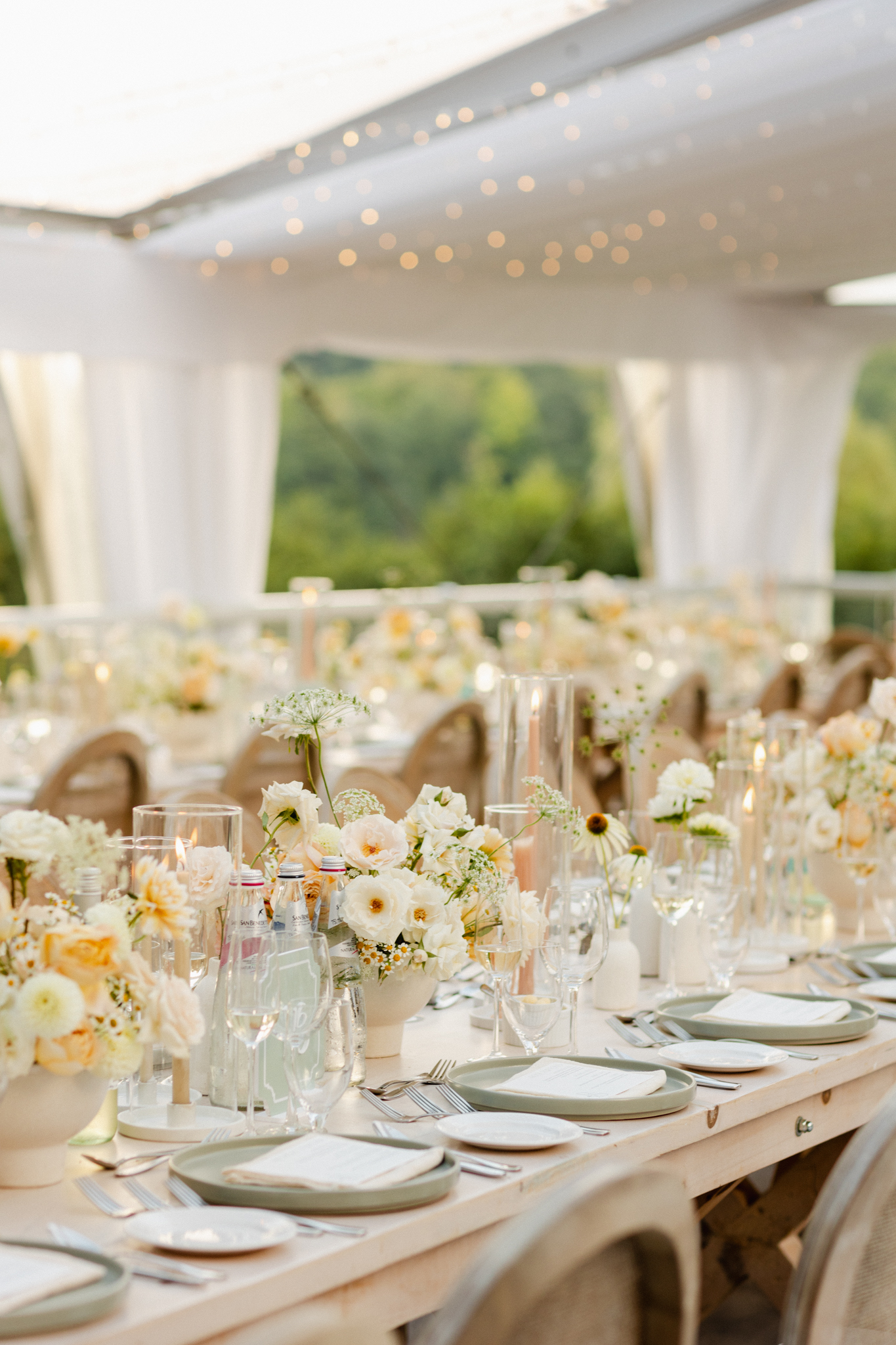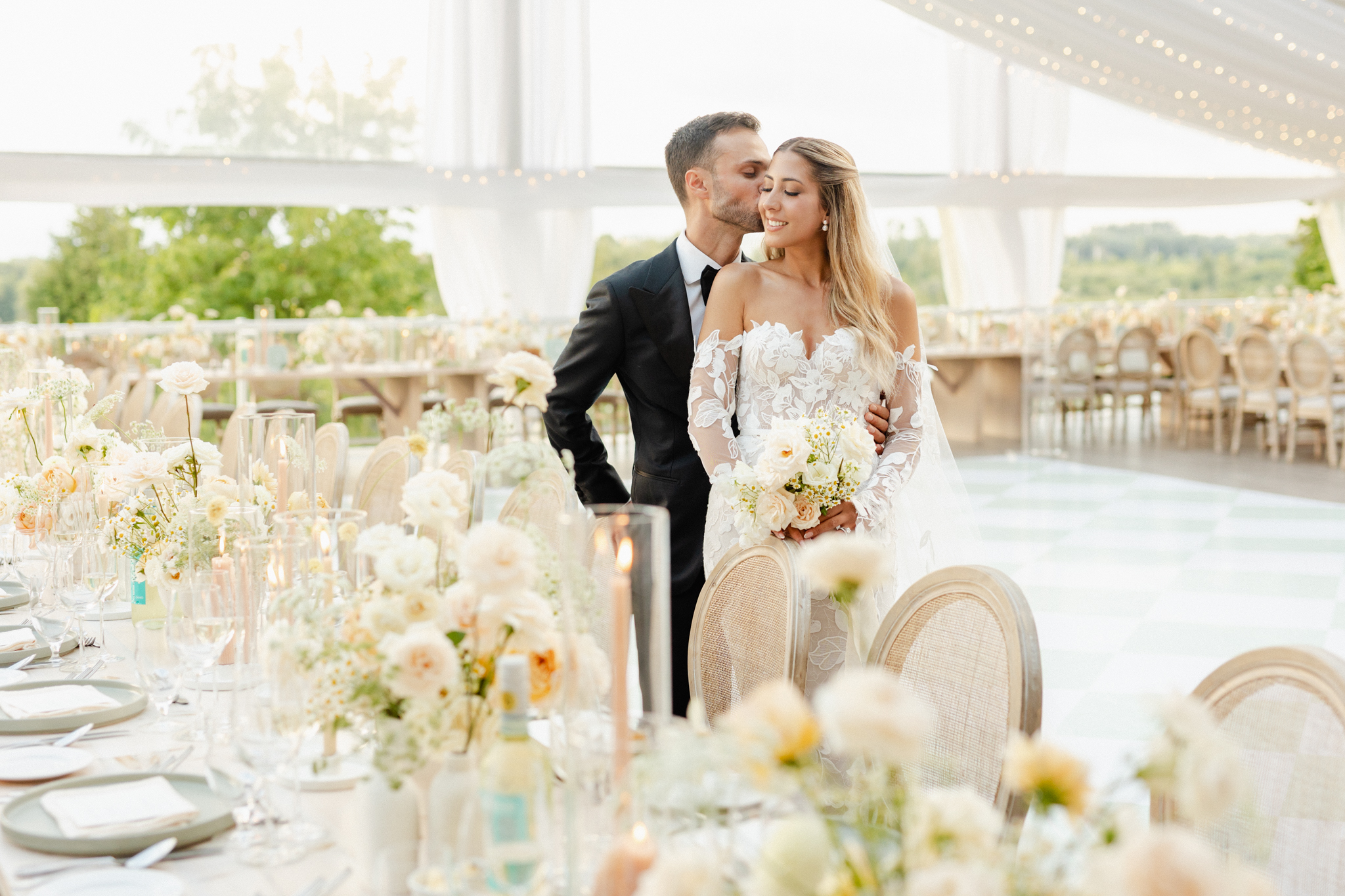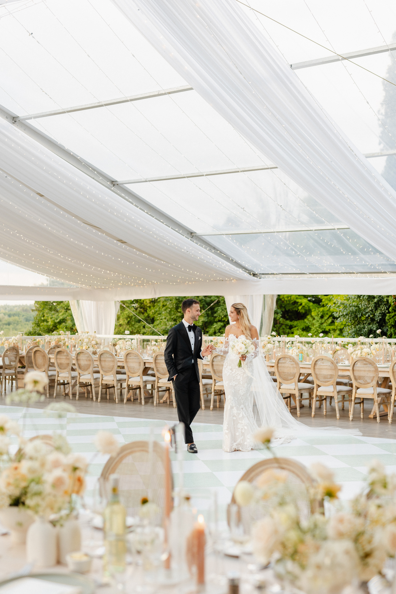 From champagne cheers in the morning to the heartfelt ceremony and lively reception, every detail of Patrizia and Stephen’s wedding was carefully curated and full of love. The serene beauty of the ceremony florals, which seemed to grow naturally from the earth, left us in awe. One particularly sweet moment was seeing Patrizia and Stephen’s dog quietly observing the ceremony, adding a touch of warmth to the day.