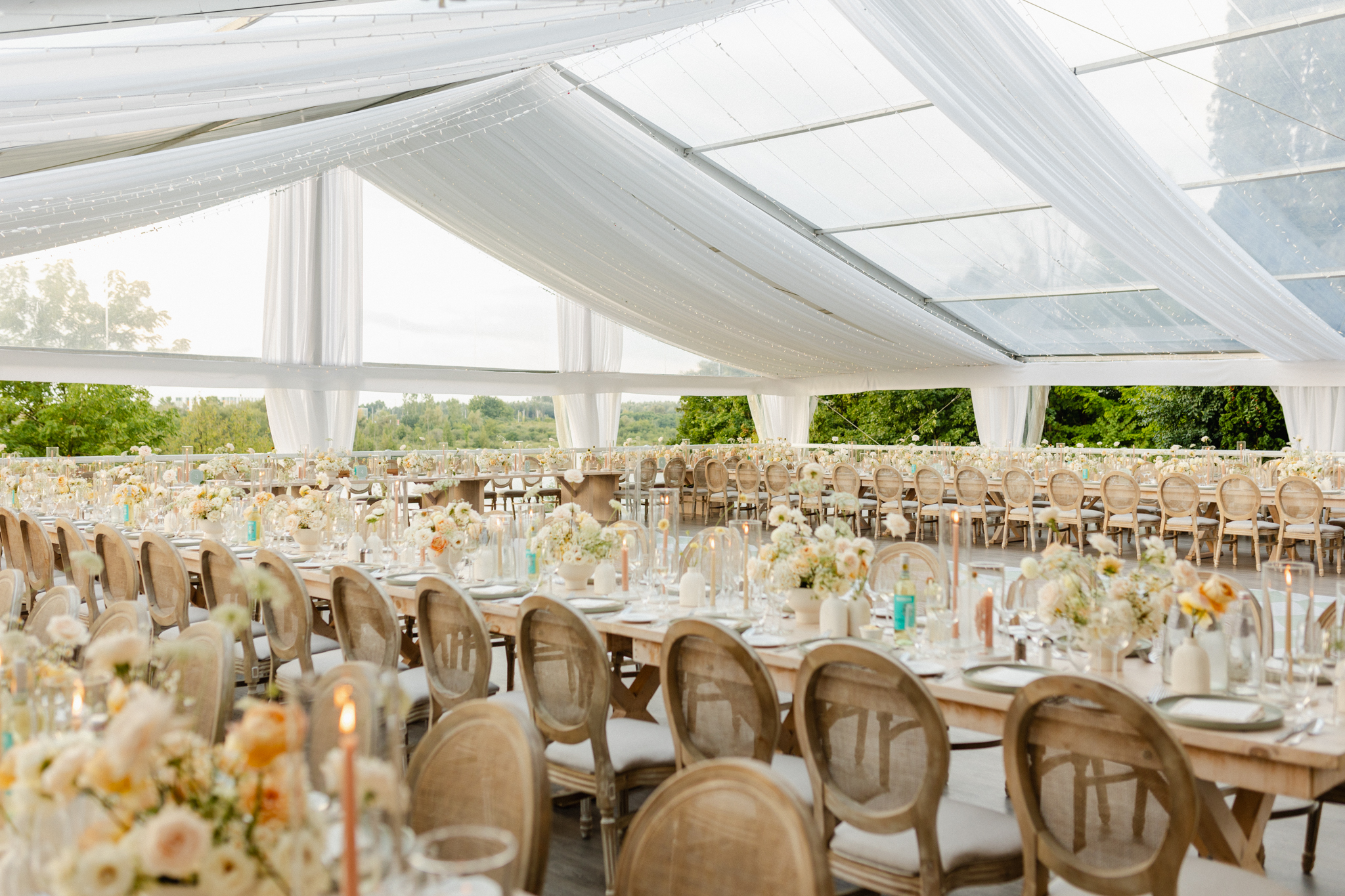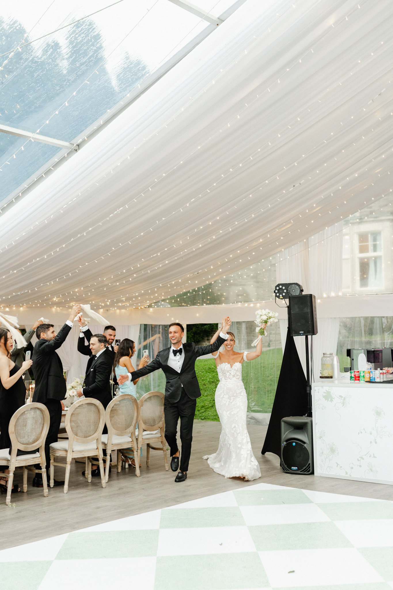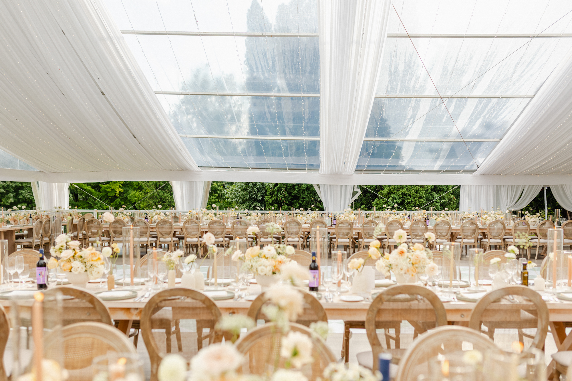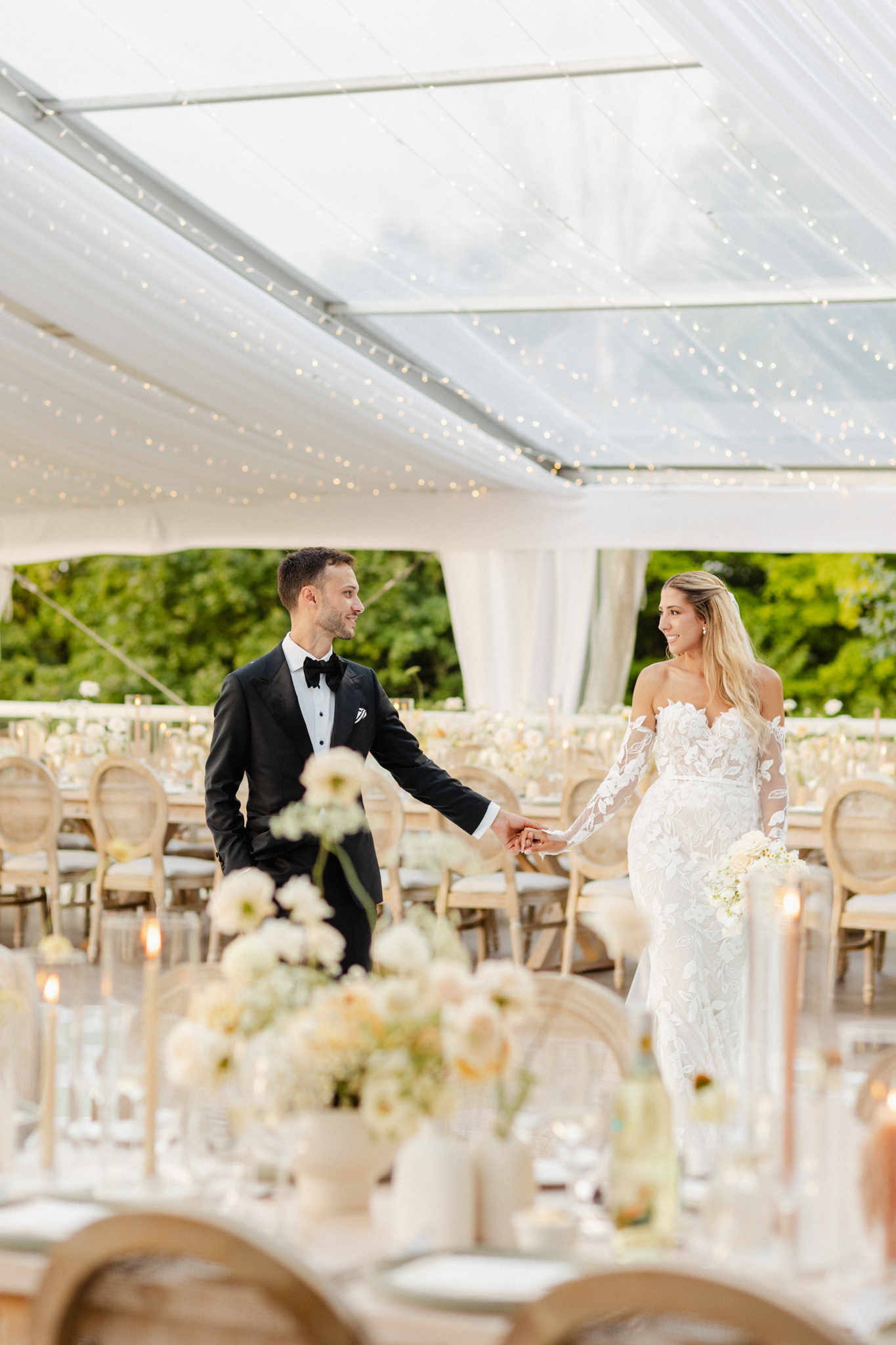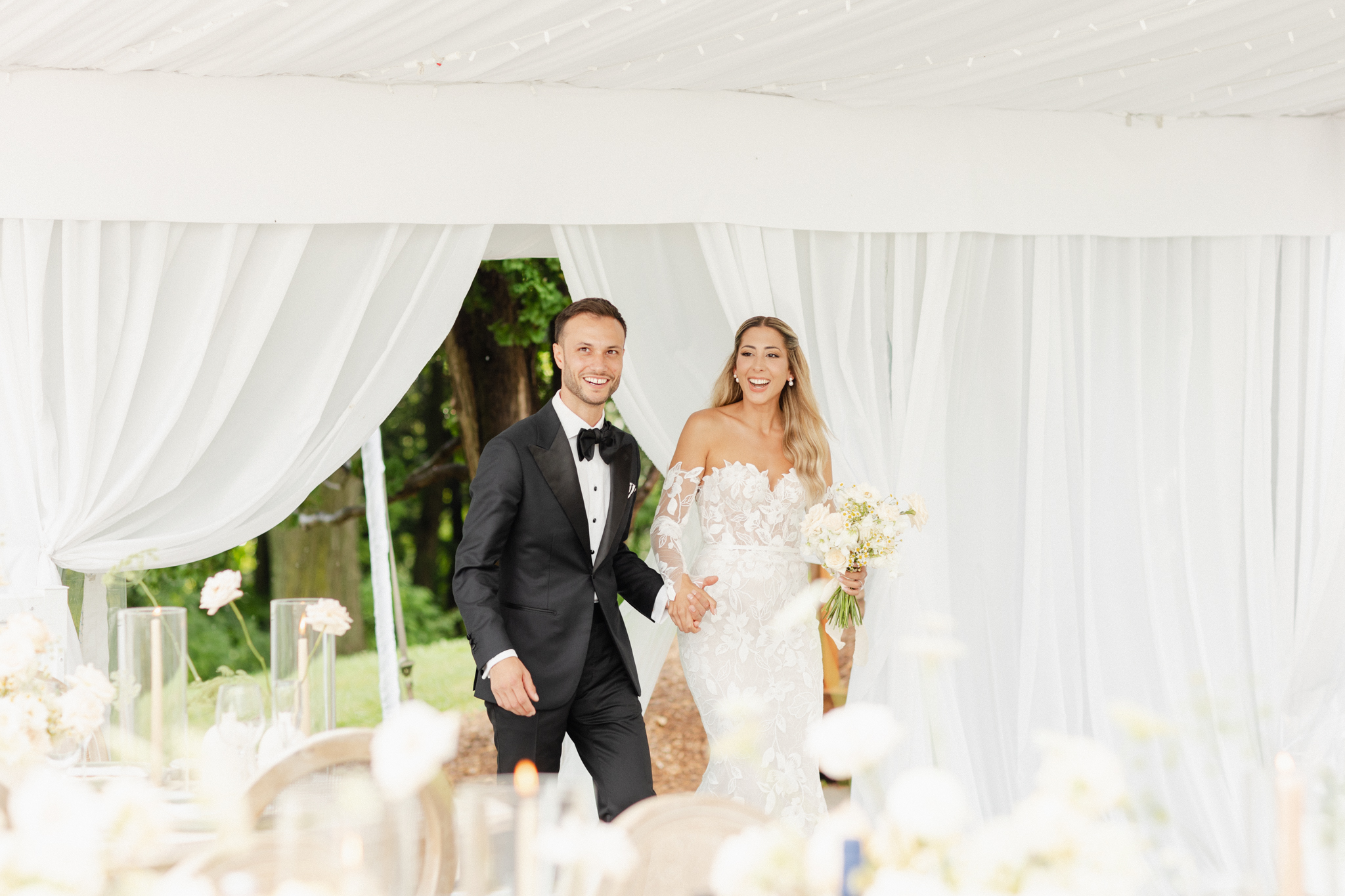 The reception was held in a gorgeous tent behind Eaton Hall, with cocktails served inside the venue. Patrizia looked radiant in her custom Mira Zwillinger gown, the Sonil design, which featured intricate detailing and elegant gown sleeves that felt like a modern fairy tale.