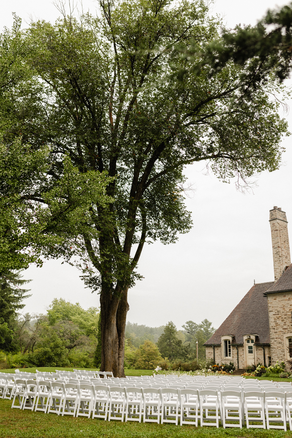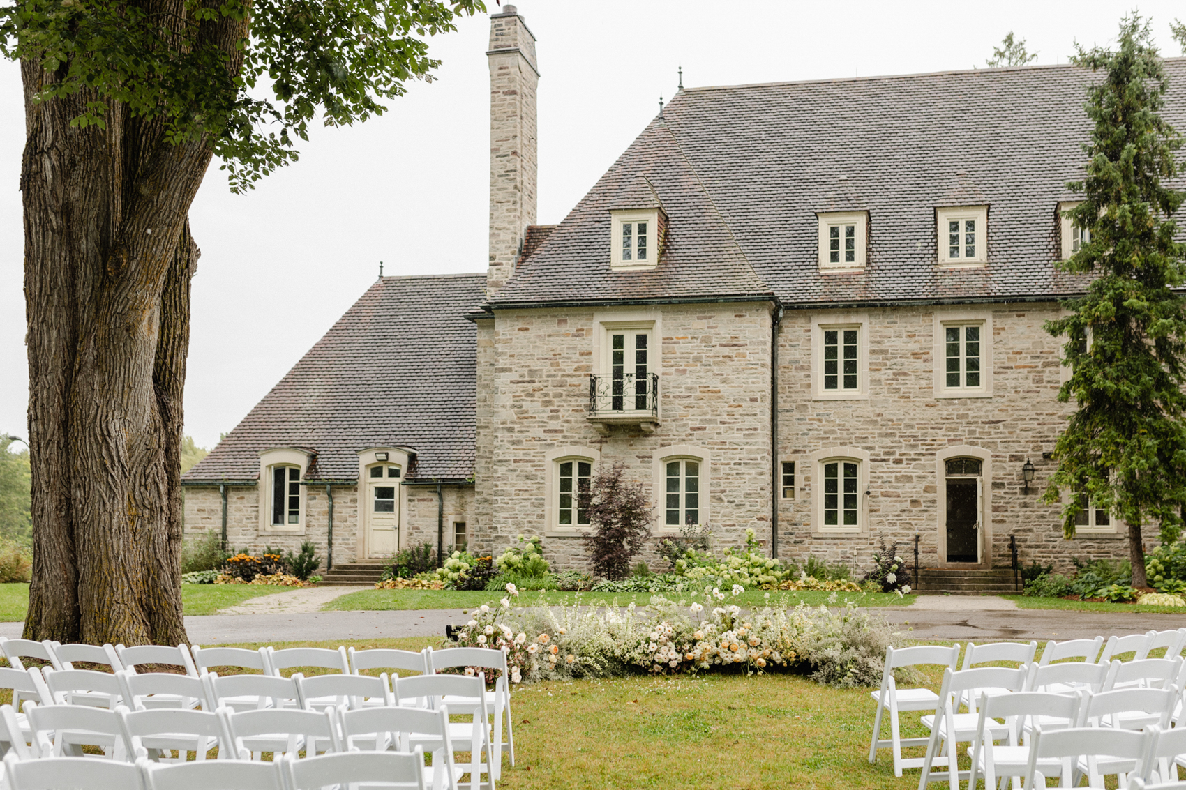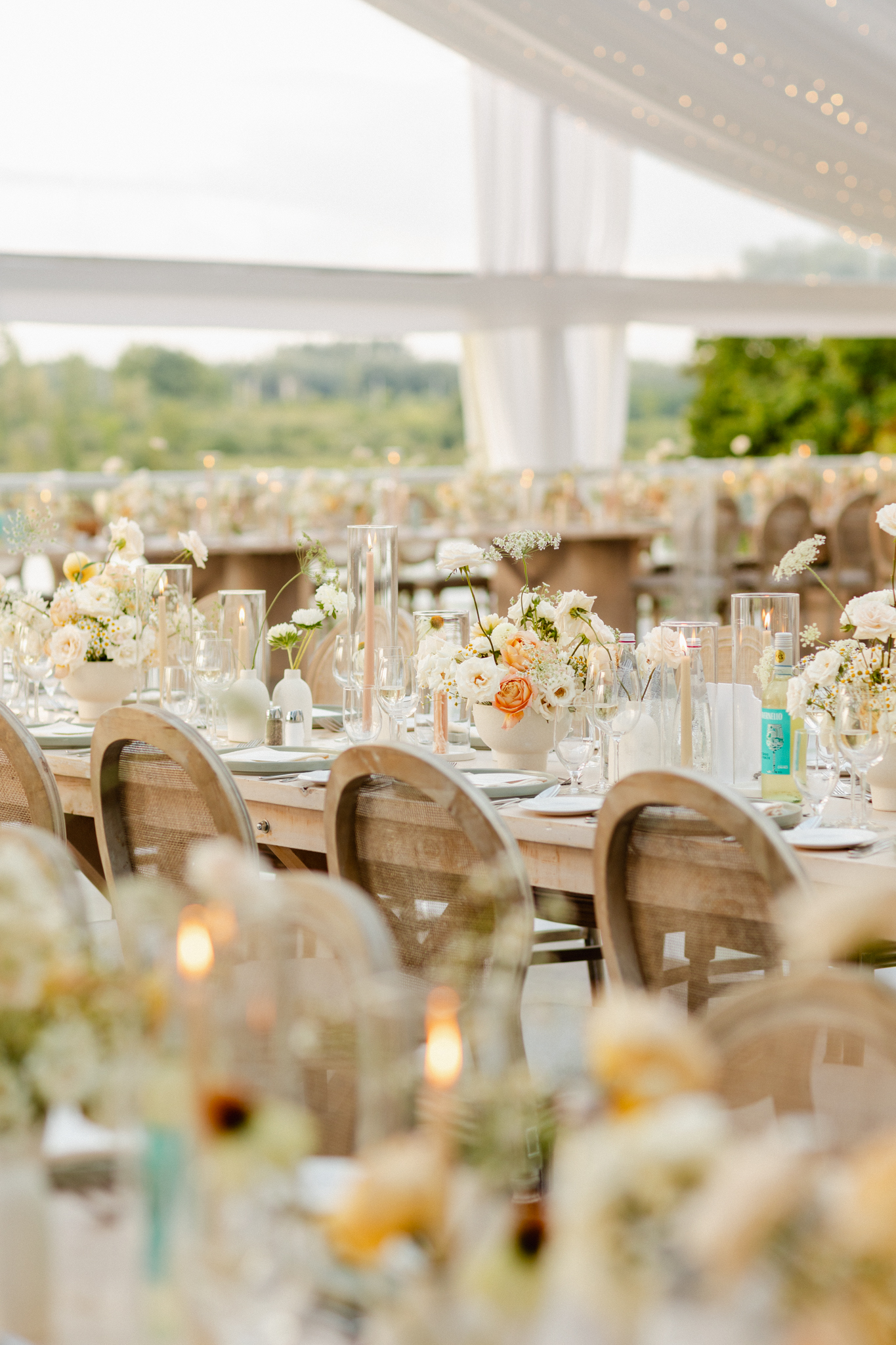 Despite a rainy start, the skies cleared just in time for a breathtaking outdoor ceremony at the front of Eaton Hall. Patrizia’s vision of a delicate garden-inspired celebration came to life with soft peach and white florals, light greenery, and earthy wood tones.