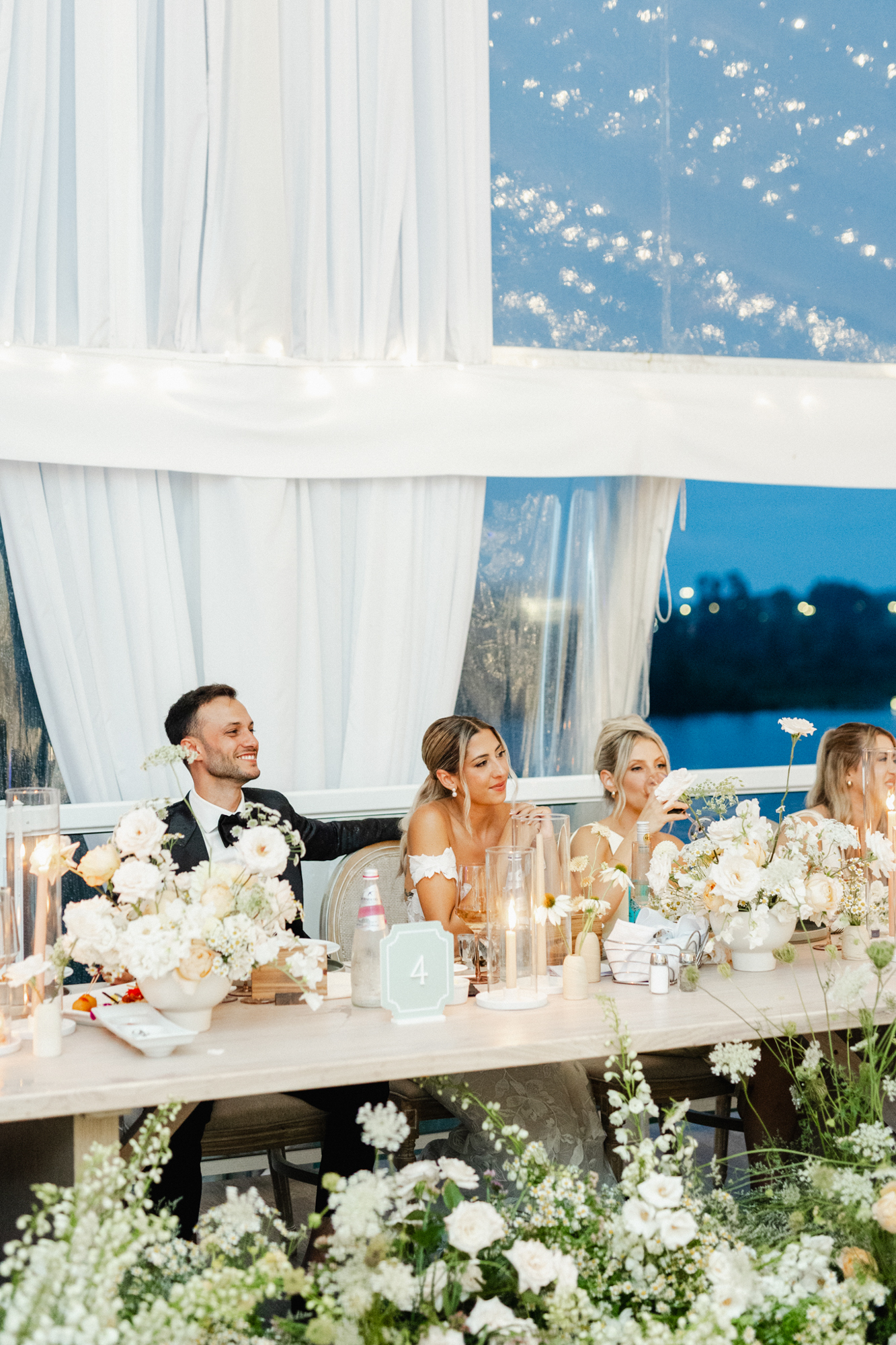 The ceremony florals were especially stunning, arranged in an organic ground structure that perfectly framed the couple. Adding to the sweetness? Their adorable dog watching the ceremony—proof that love truly knows no bounds.