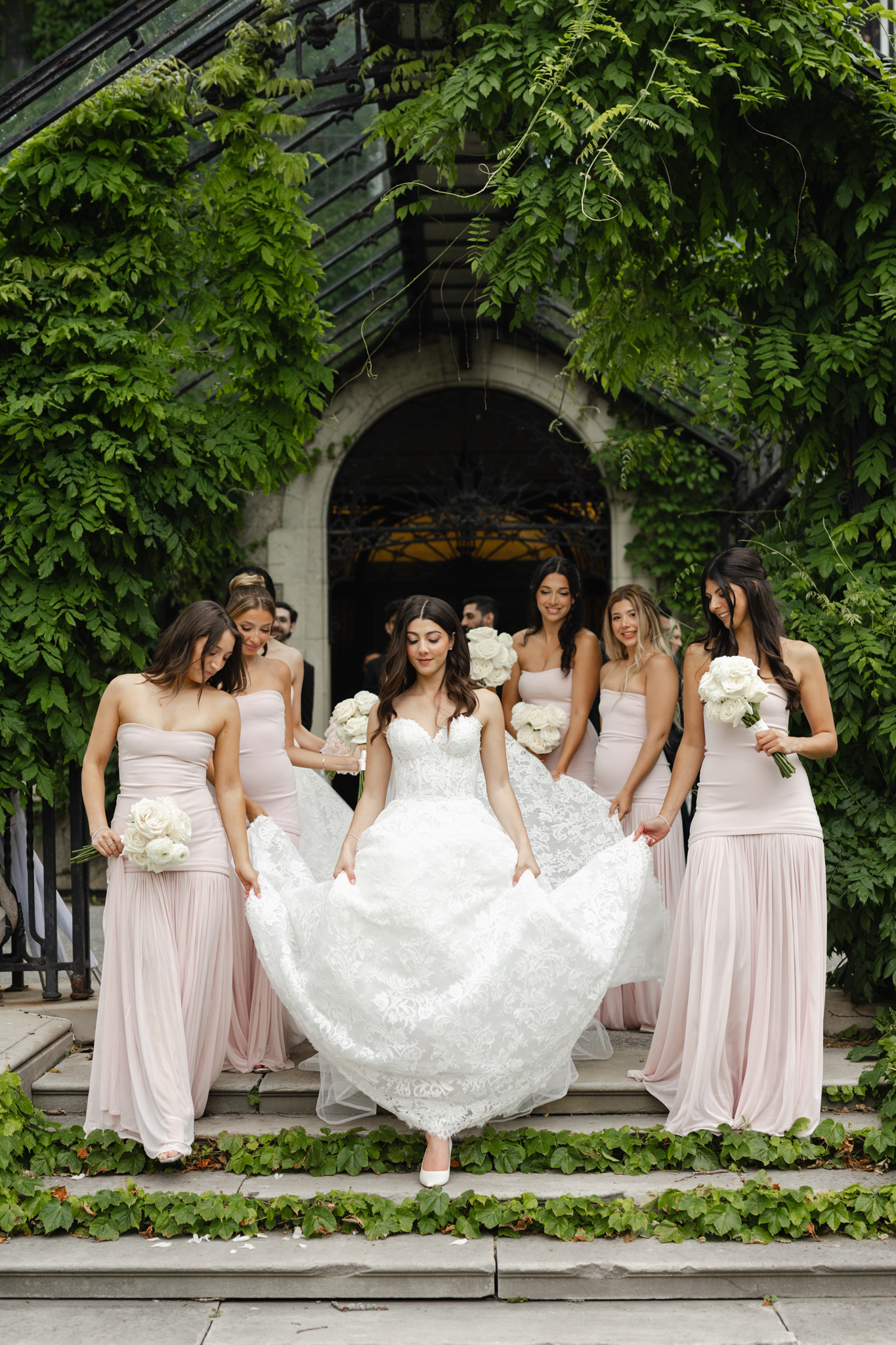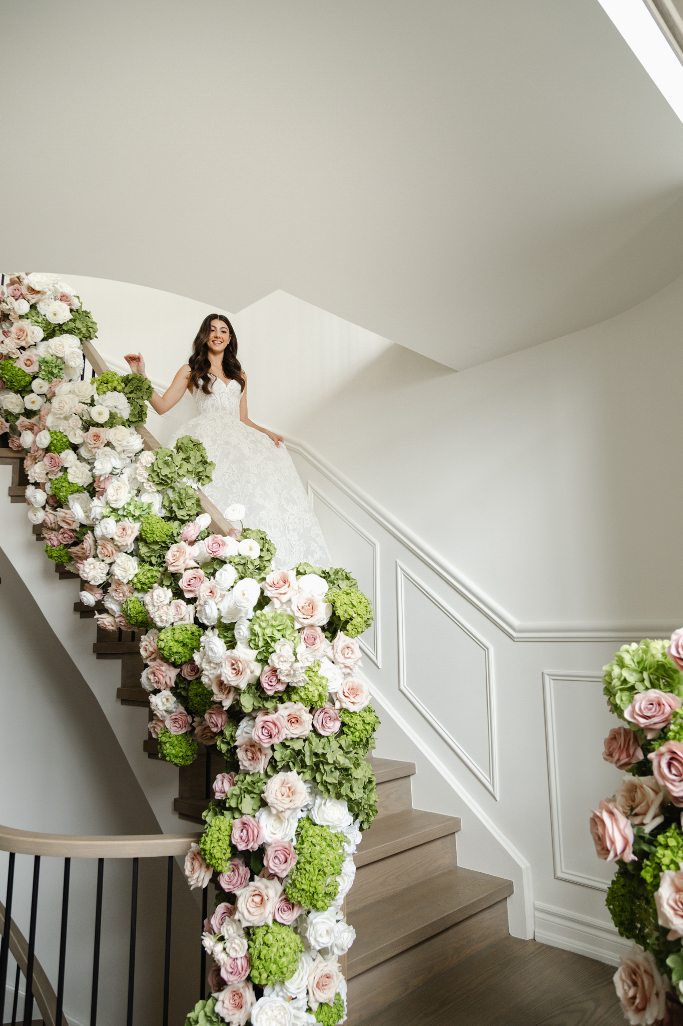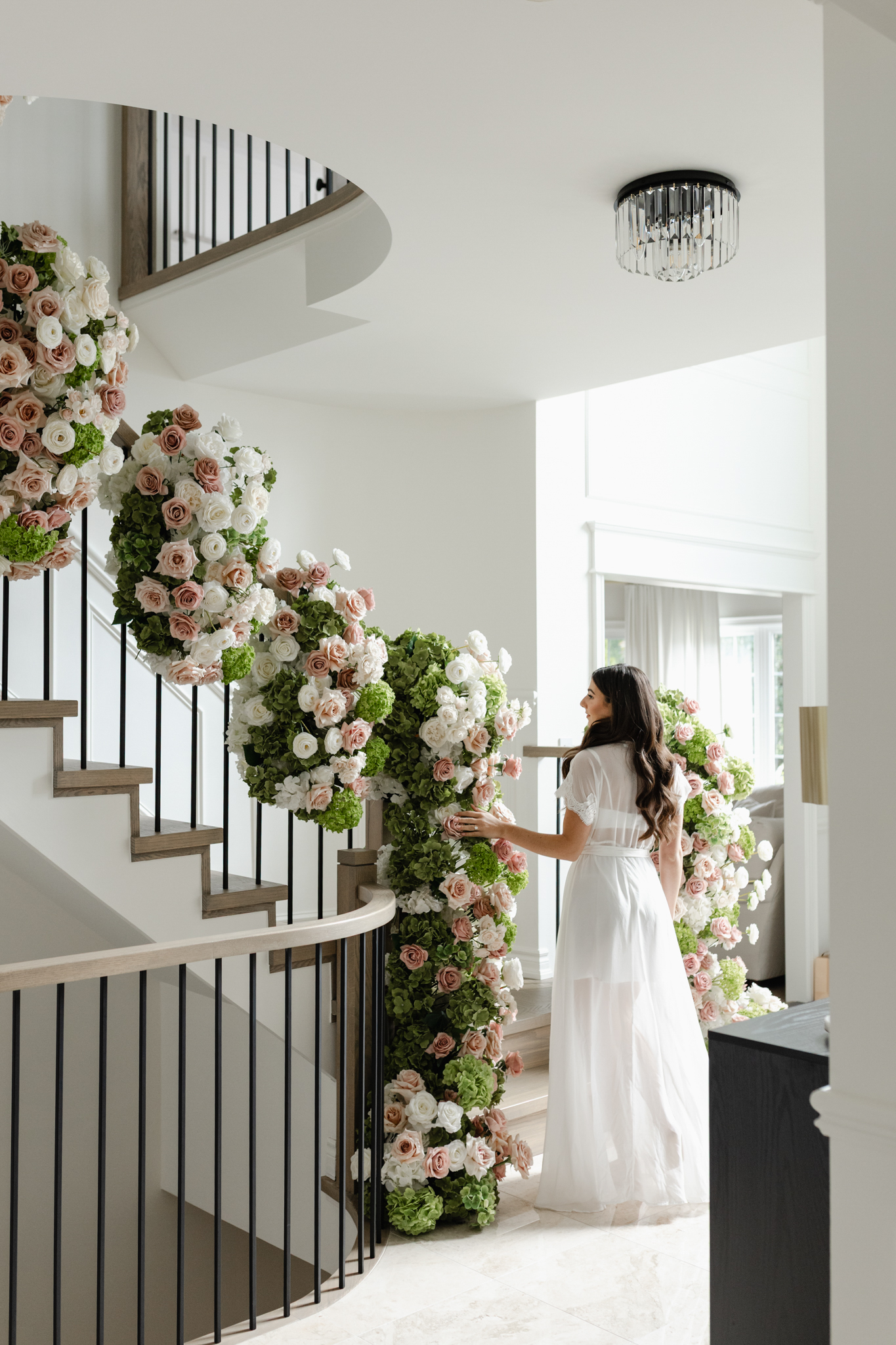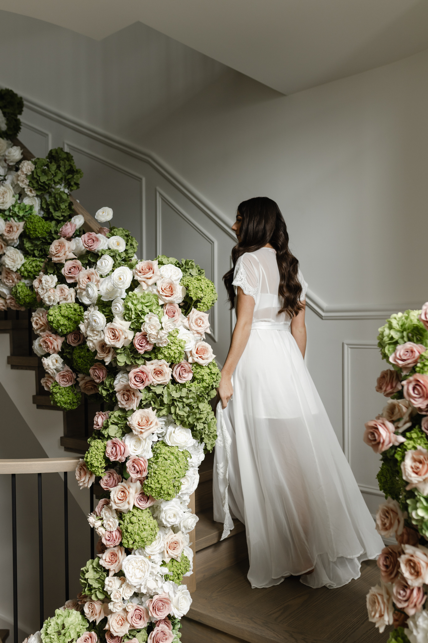 Emily’s bridal morning was the perfect introduction to the glamour that would unfold throughout the day. The moment we walked into her suite, we were greeted by a breathtaking floral-wrapped staircase, a full installation of soft pinks, cream blooms and delicate greenery. It instantly transformed her morning into a Vogue-worthy scene, giving us endless opportunities for editorial bridal portraits.