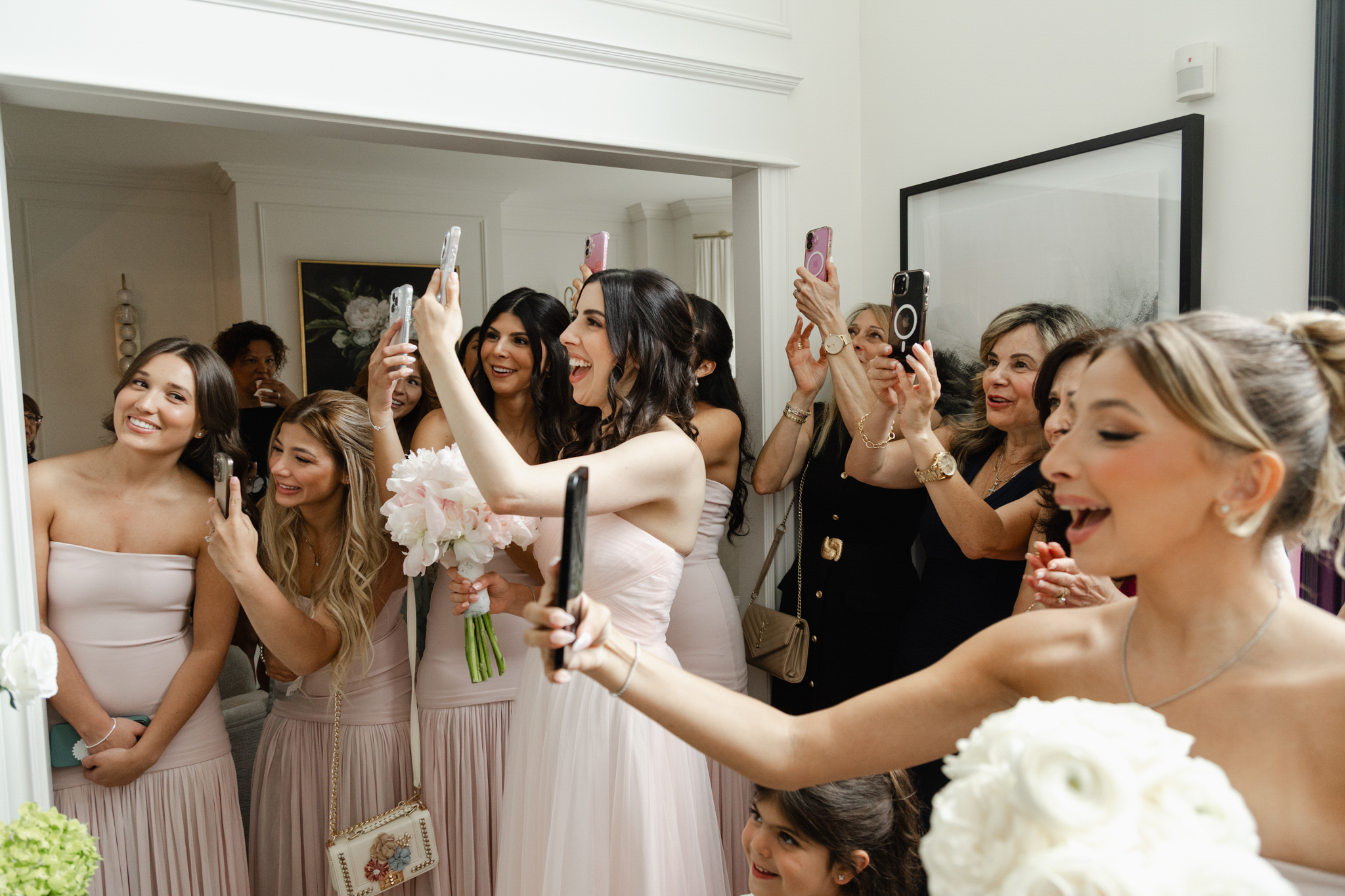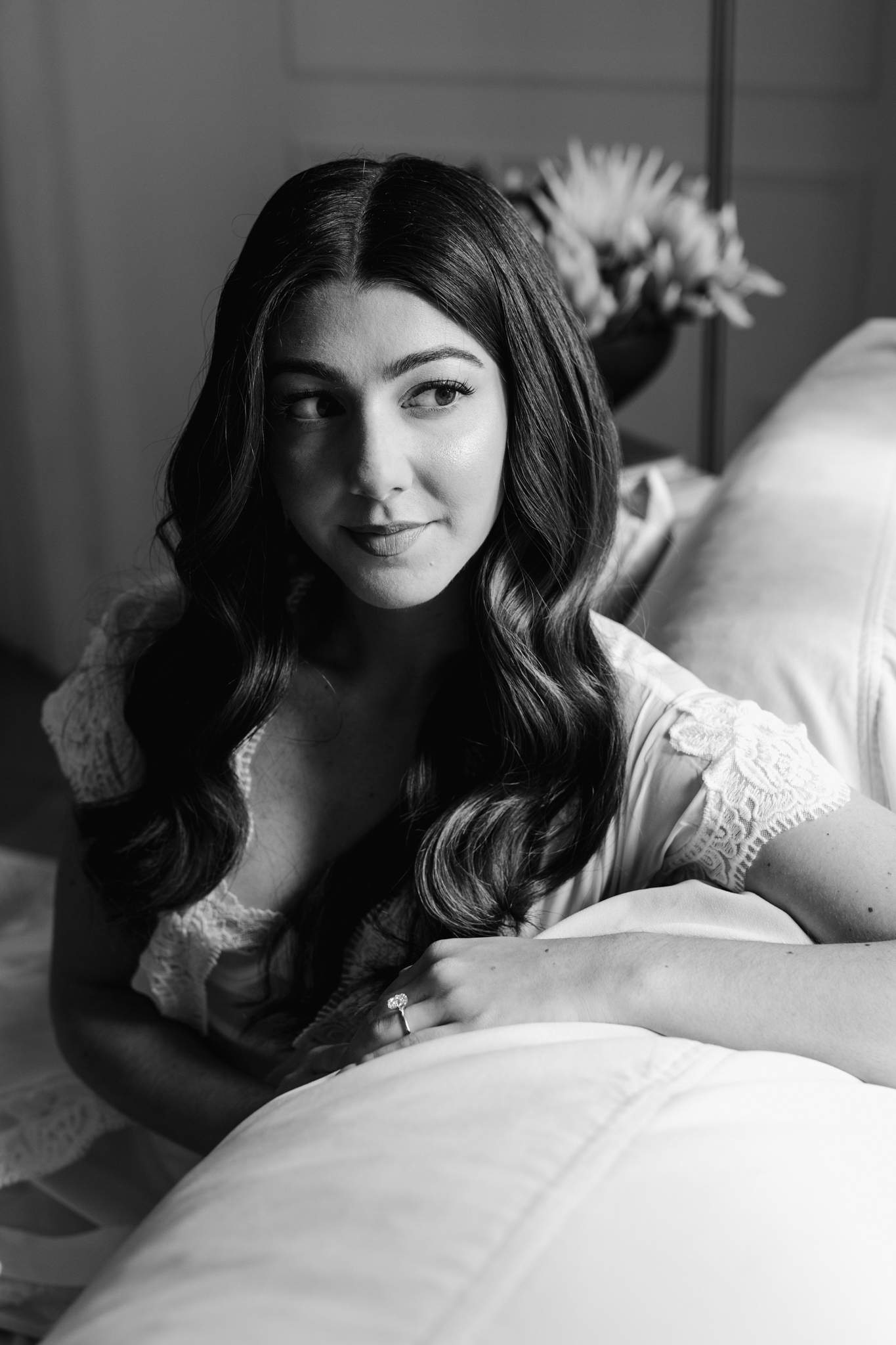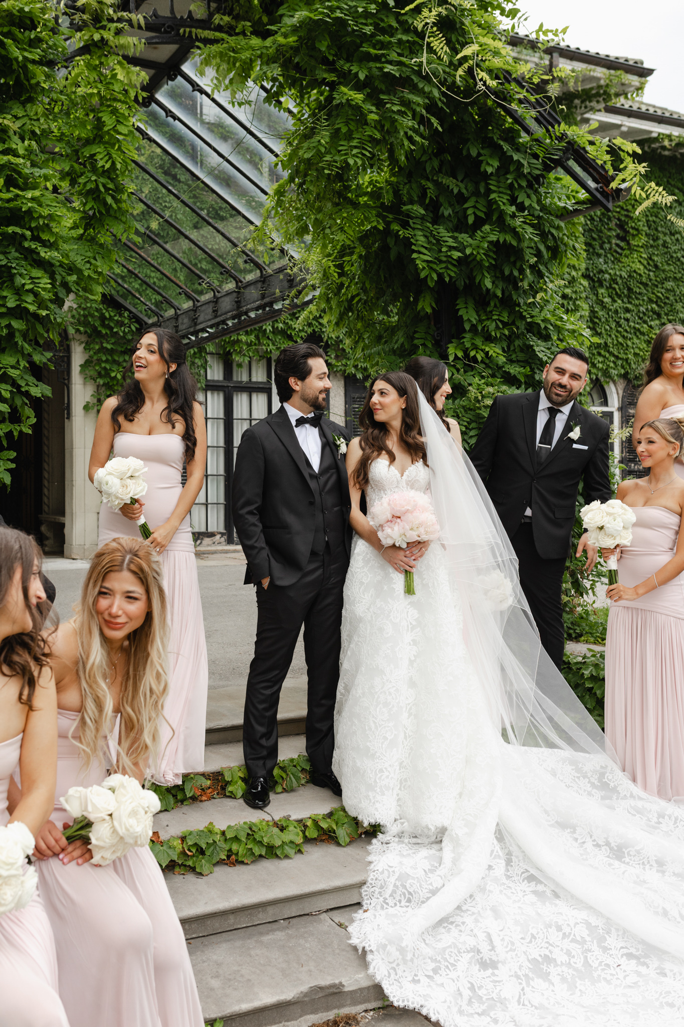 Emily’s bridal morning was the perfect introduction to the glamour that would unfold throughout the day. The moment we walked into her suite, we were greeted by a breathtaking floral-wrapped staircase, a full installation of soft pinks, cream blooms and delicate greenery. It instantly transformed her morning into a Vogue-worthy scene, giving us endless opportunities for editorial bridal portraits.