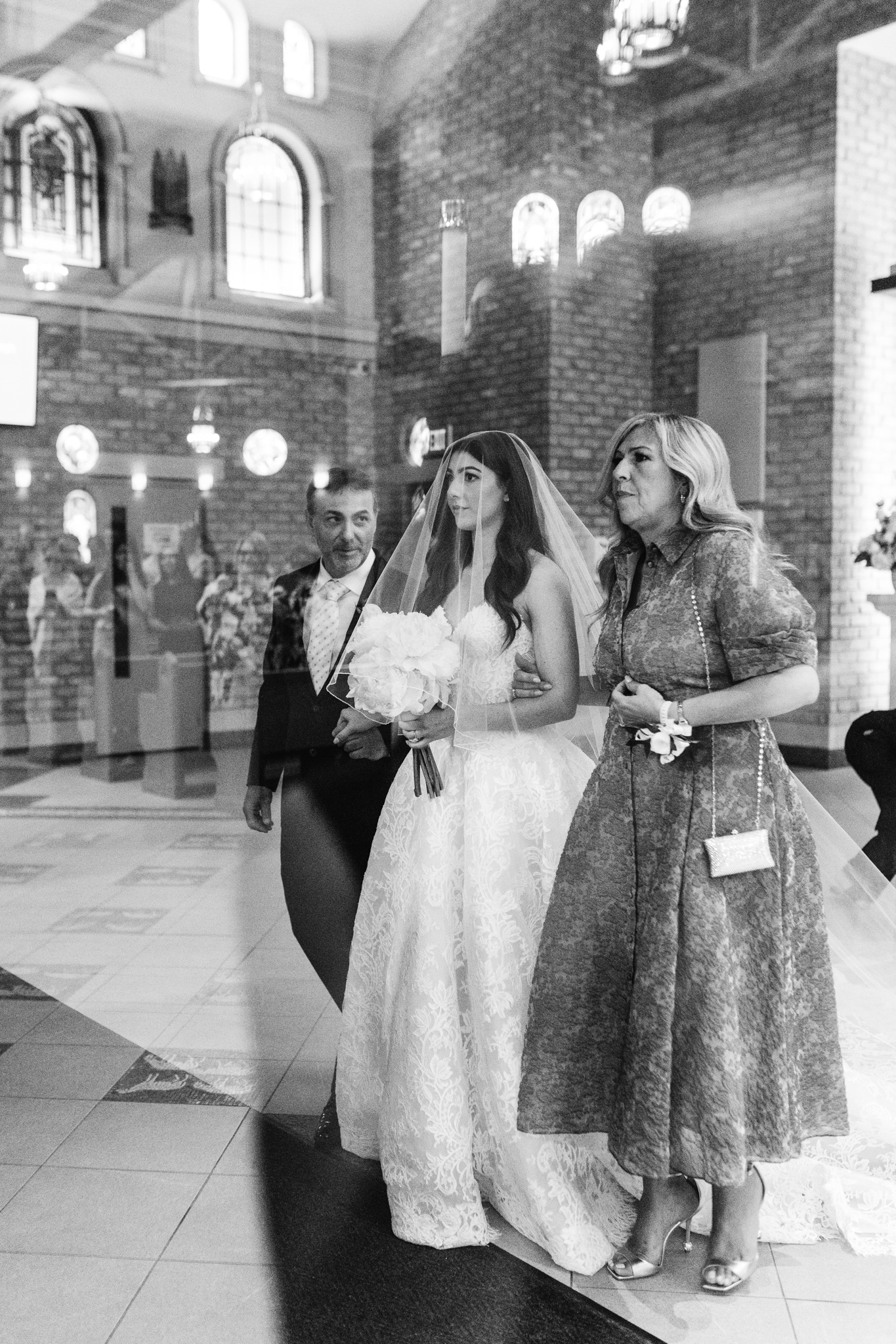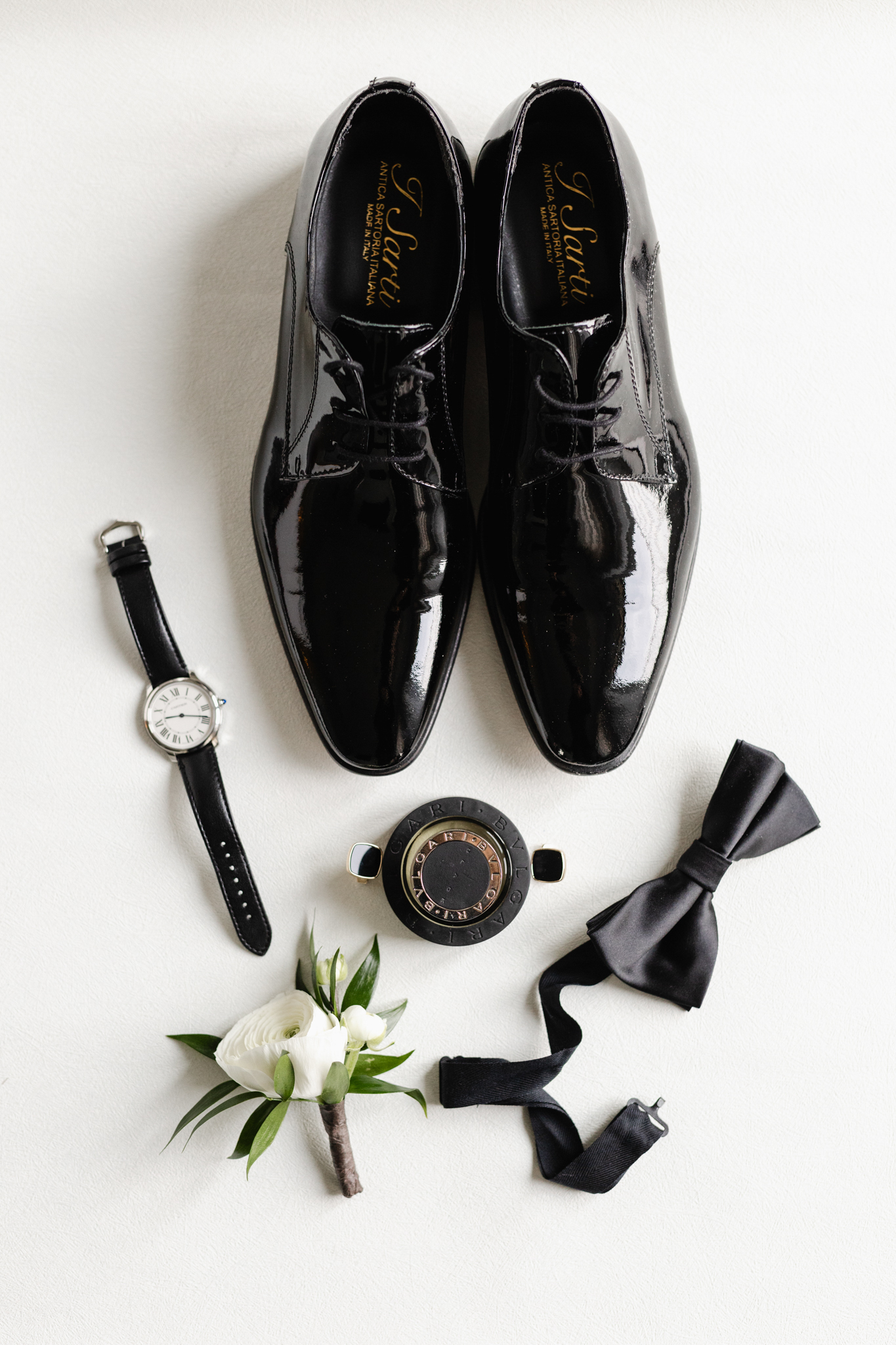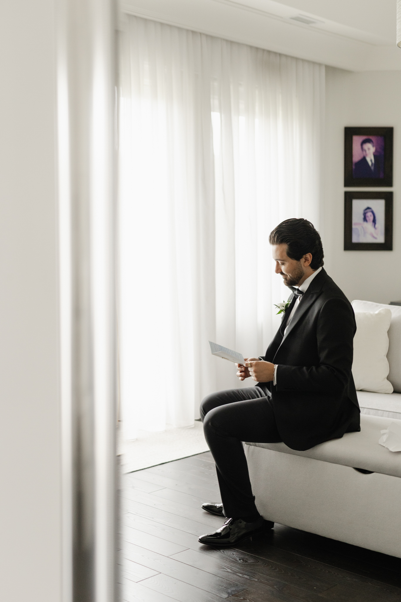 Meanwhile, Ottavio’s groom prep brought an entirely different kind of energy, full of friends, laughter, and the easy confidence that comes from being surrounded by your closest crew. His style mirrored Emily’s impeccably. Think polished tailoring, sharp details and the grand entrance of a Rolls Royce waiting outside to take him to the ceremony. Their aesthetics aligned so seamlessly that it genuinely felt like they were made for each other.