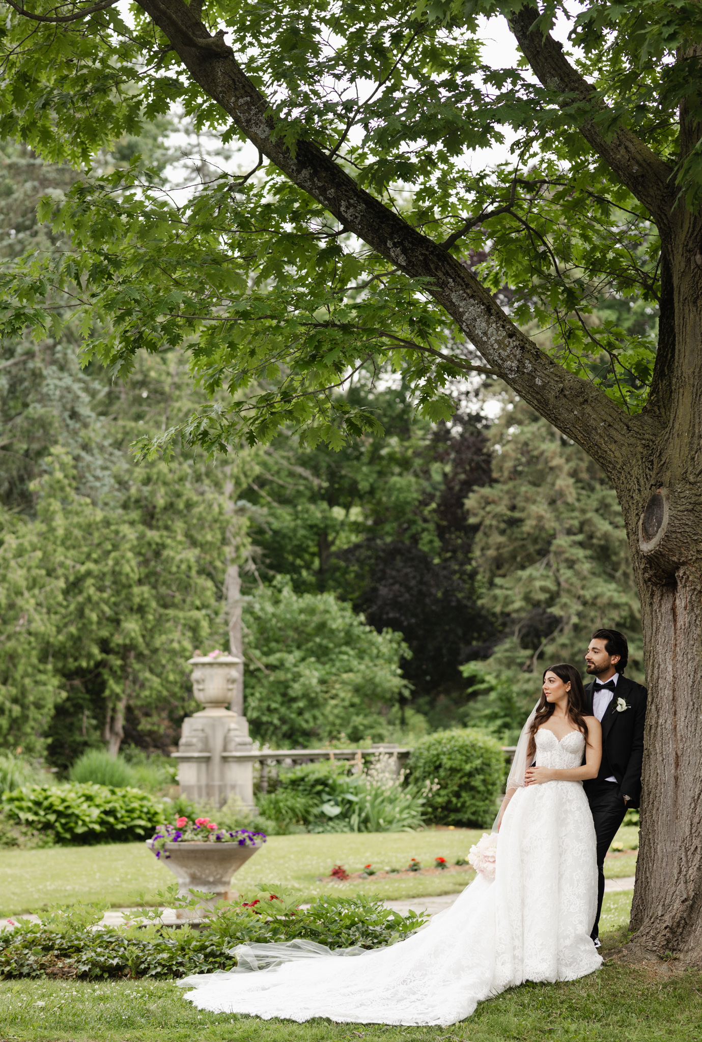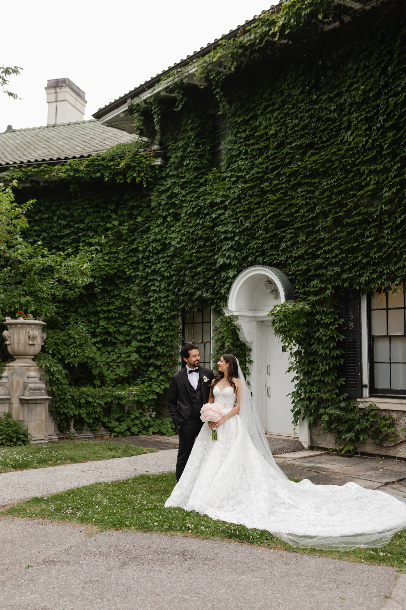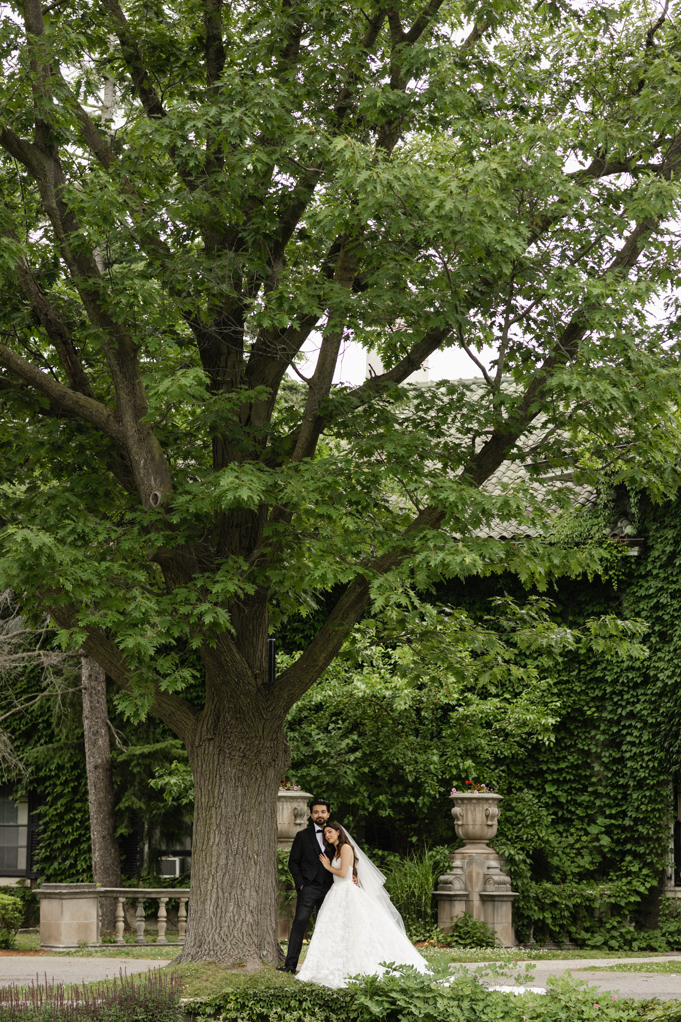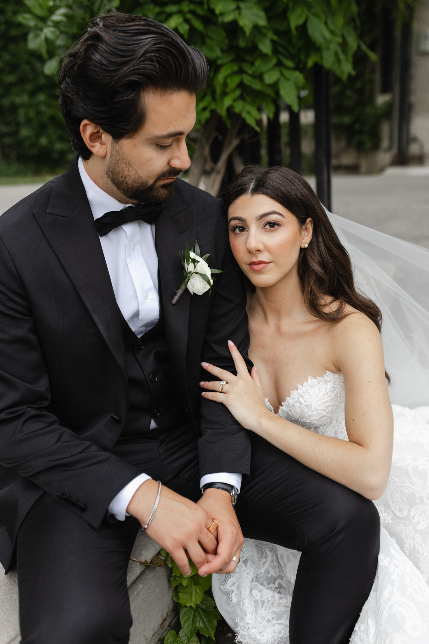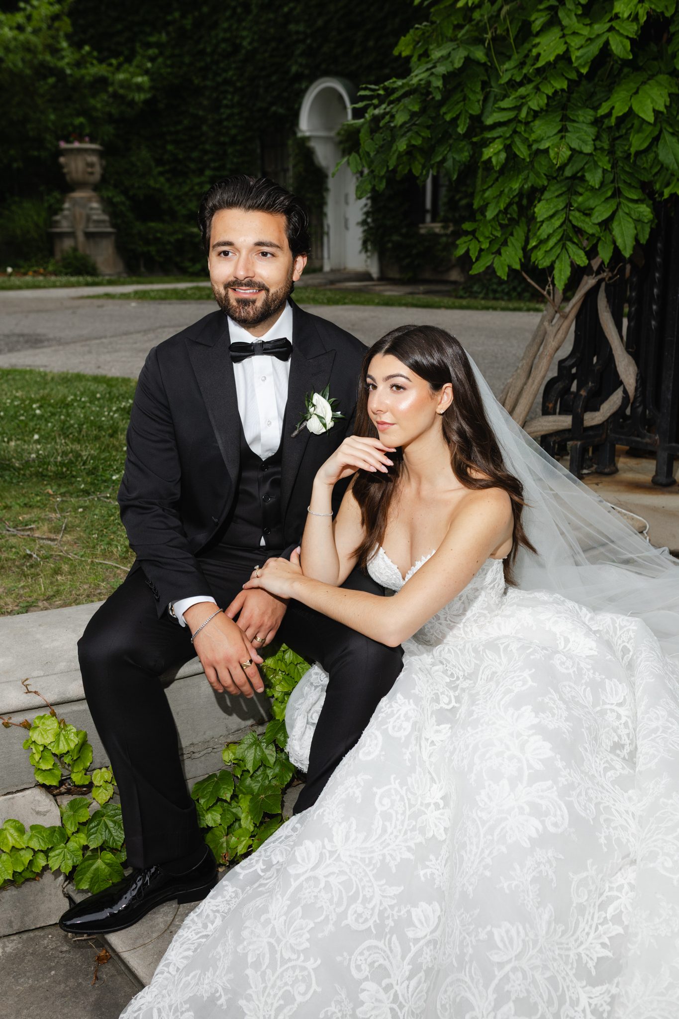 To balance out the backdrop of the car portraits, we headed to Glendon Campus for the the most romantic garden backdrop. The greenery, soft light and quiet atmosphere created a contrast to the modern glamour of the Rolls Royce. It was the perfect pairing for a couple whose style blended luxury with heartfelt romance.