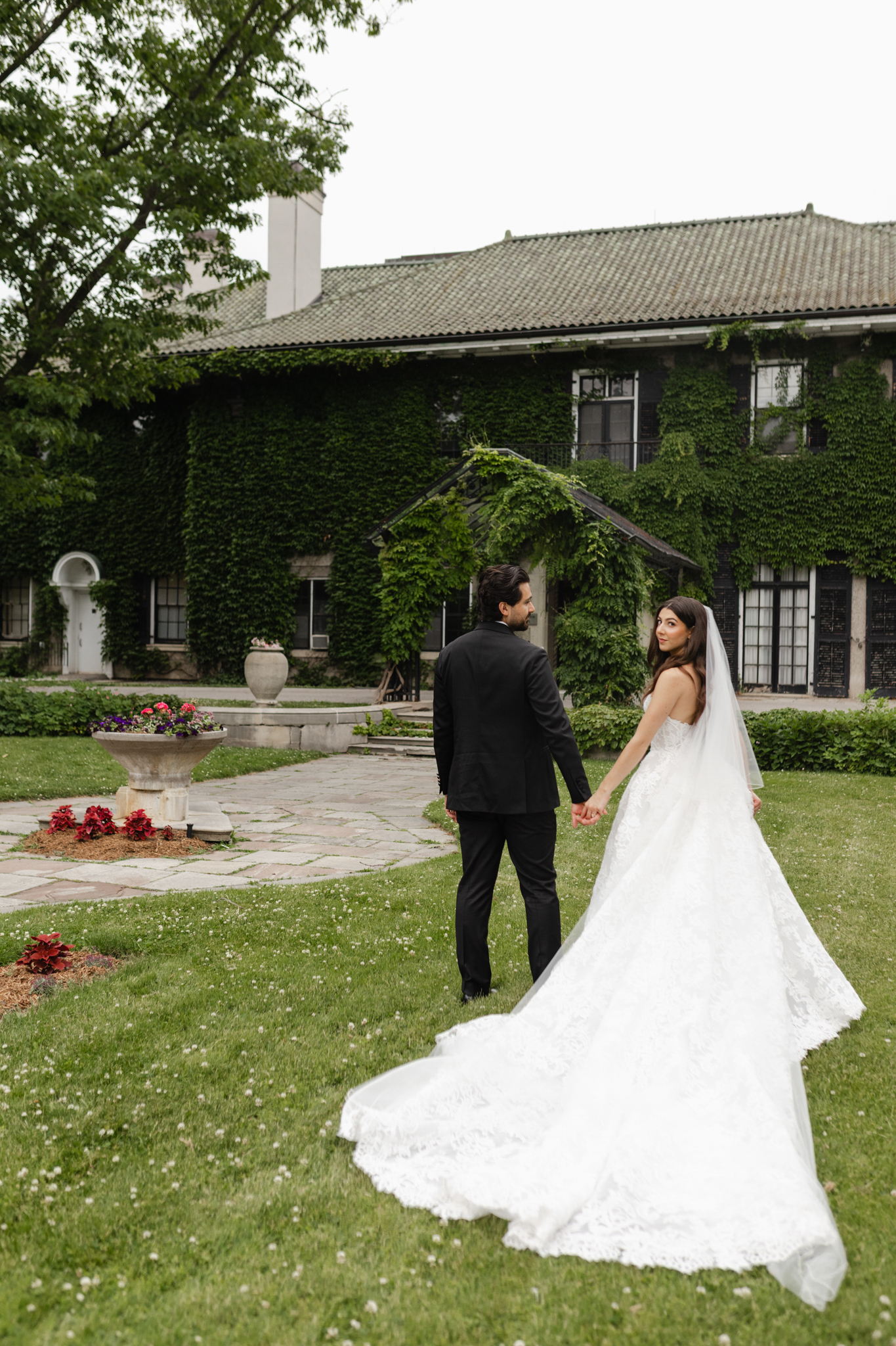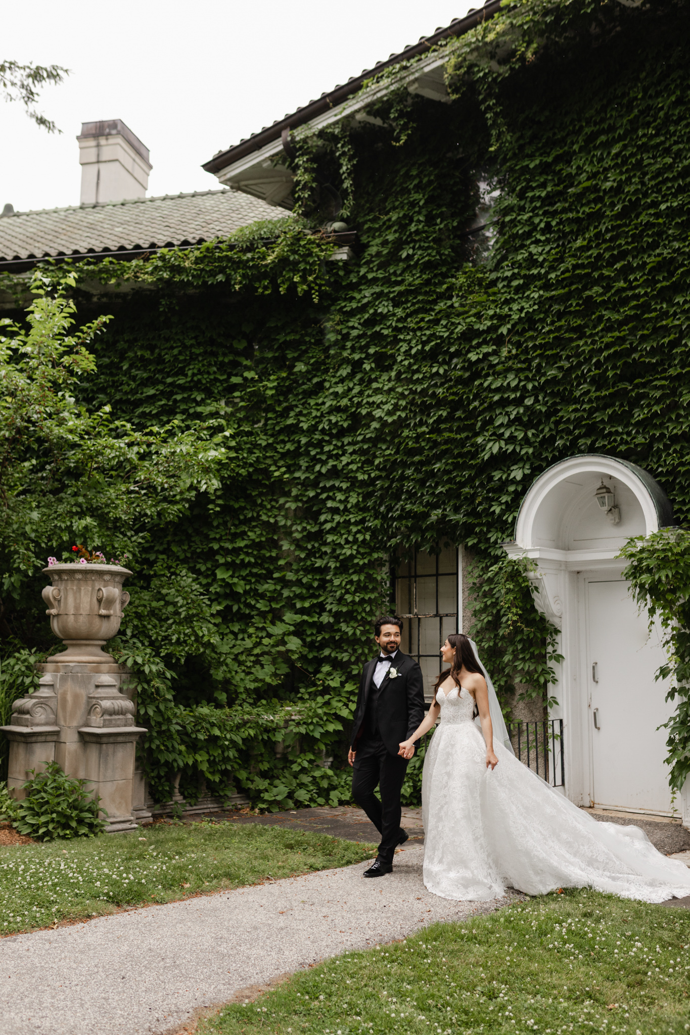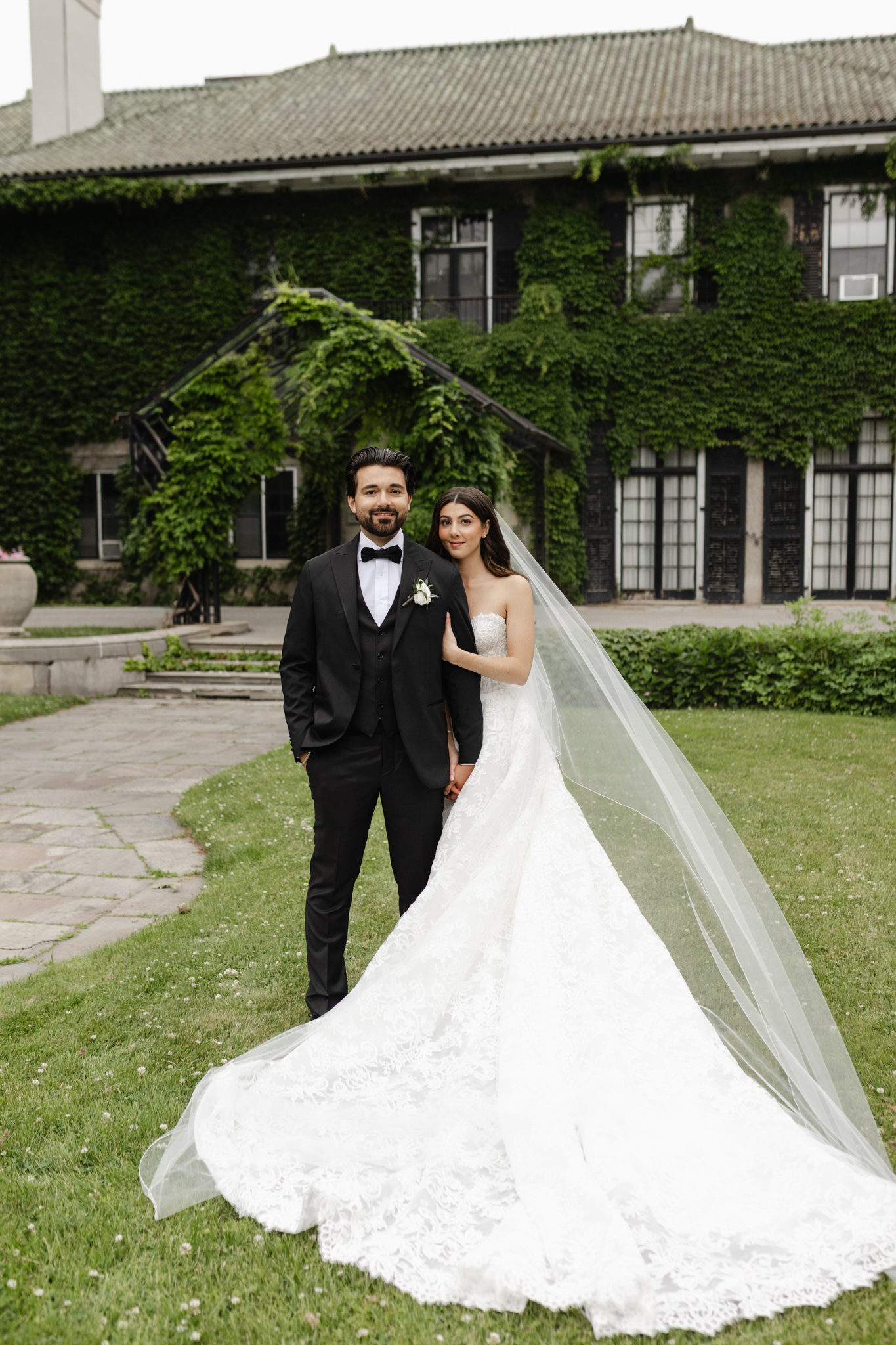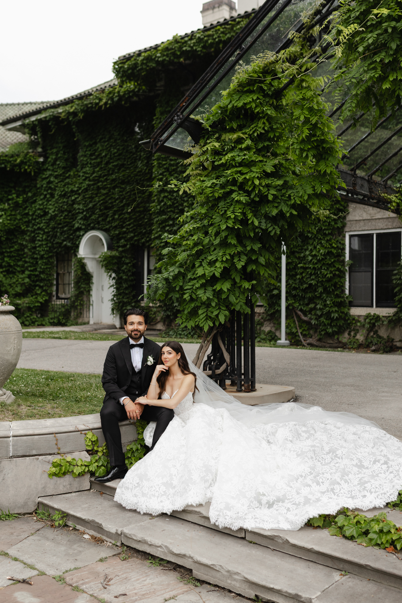 To balance out the backdrop of the car portraits, we headed to Glendon Campus for the the most romantic garden backdrop. The greenery, soft light and quiet atmosphere created a contrast to the modern glamour of the Rolls Royce. It was the perfect pairing for a couple whose style blended luxury with heartfelt romance.