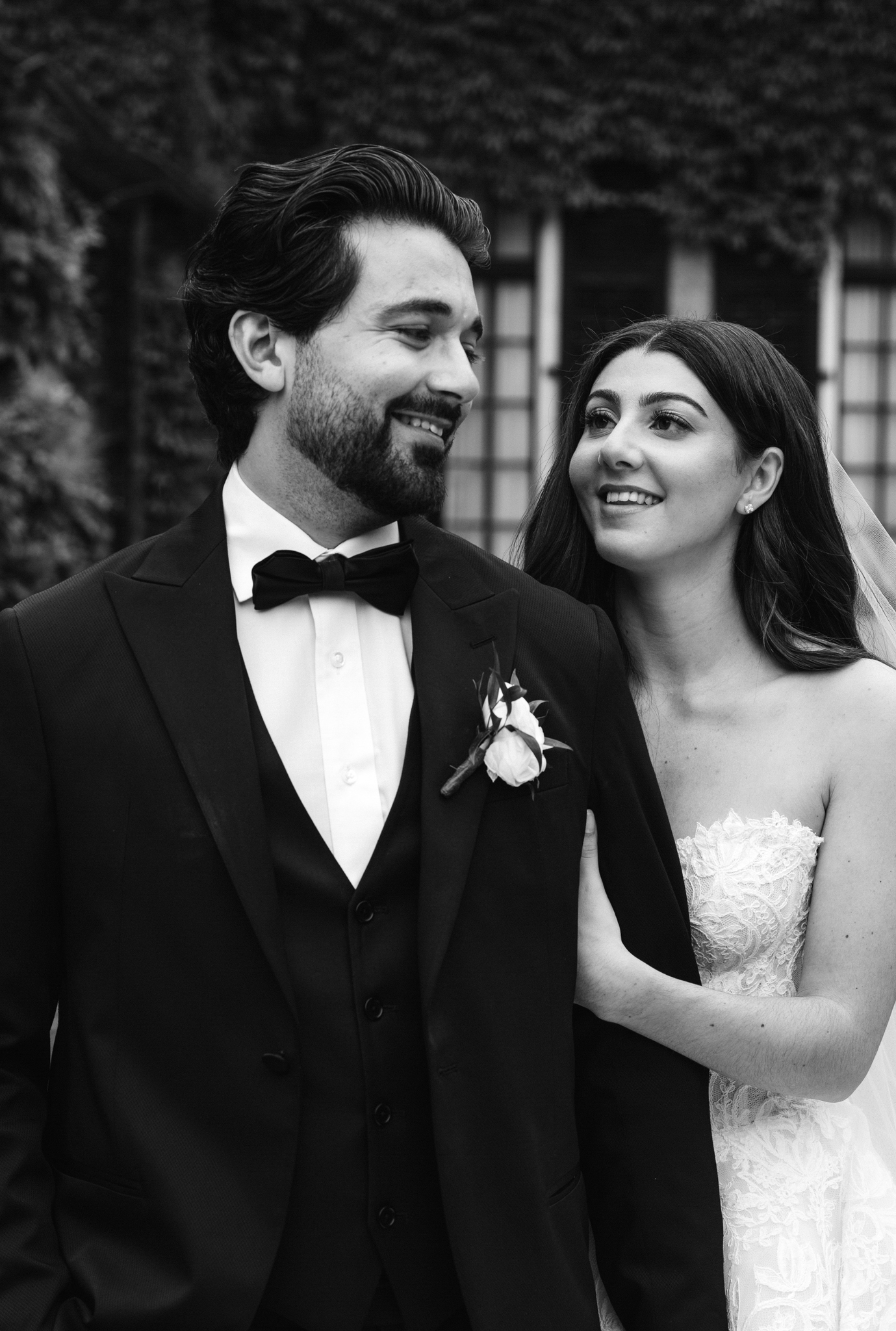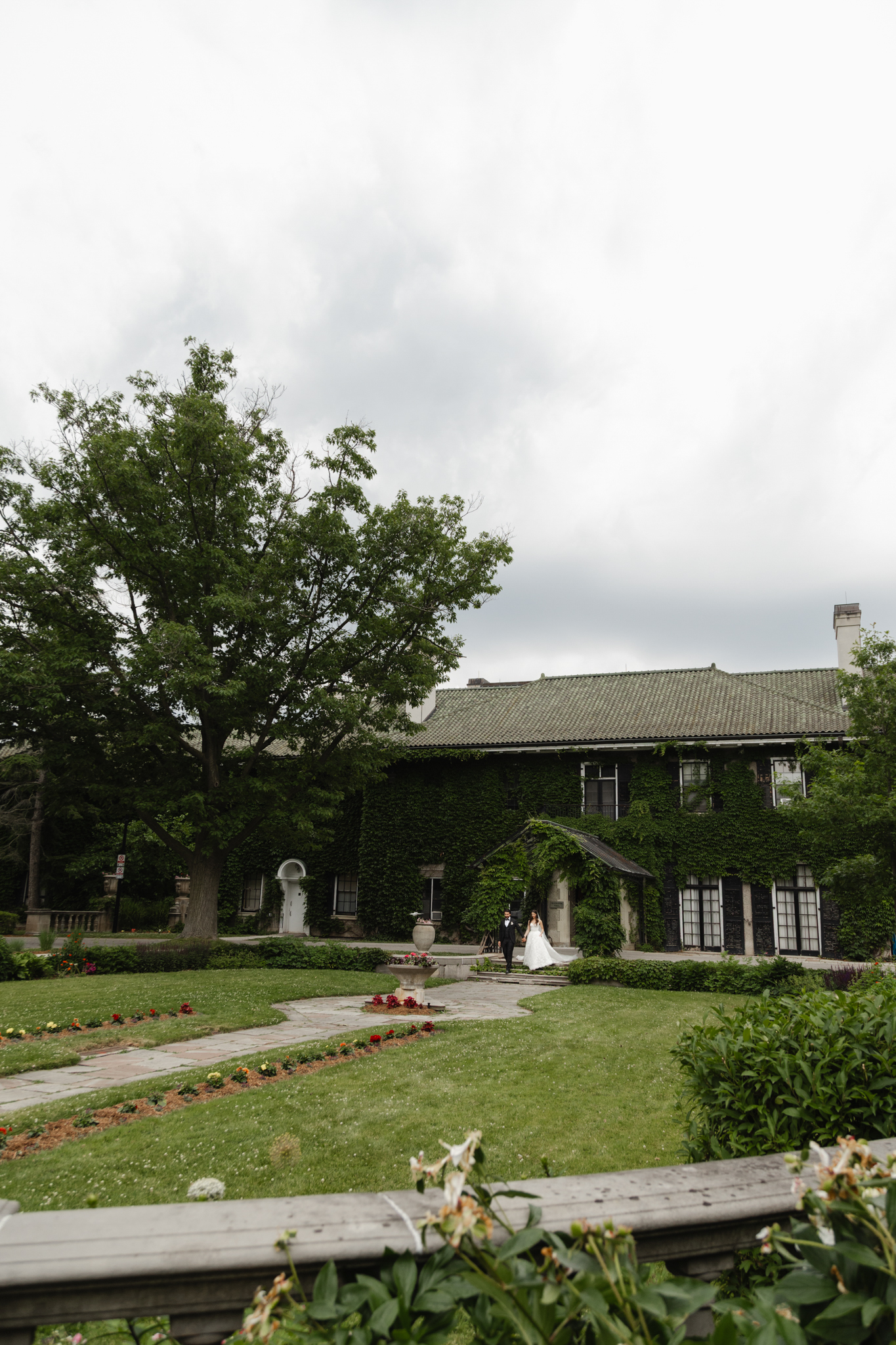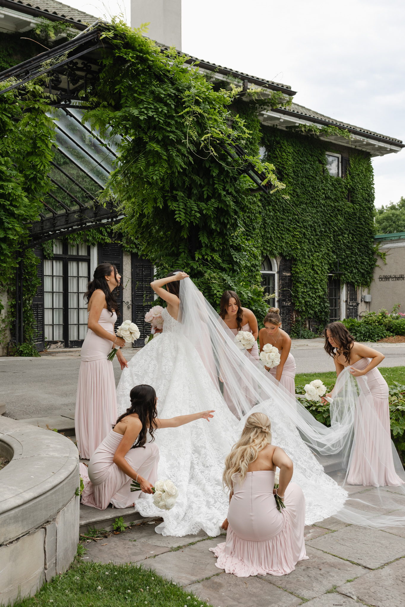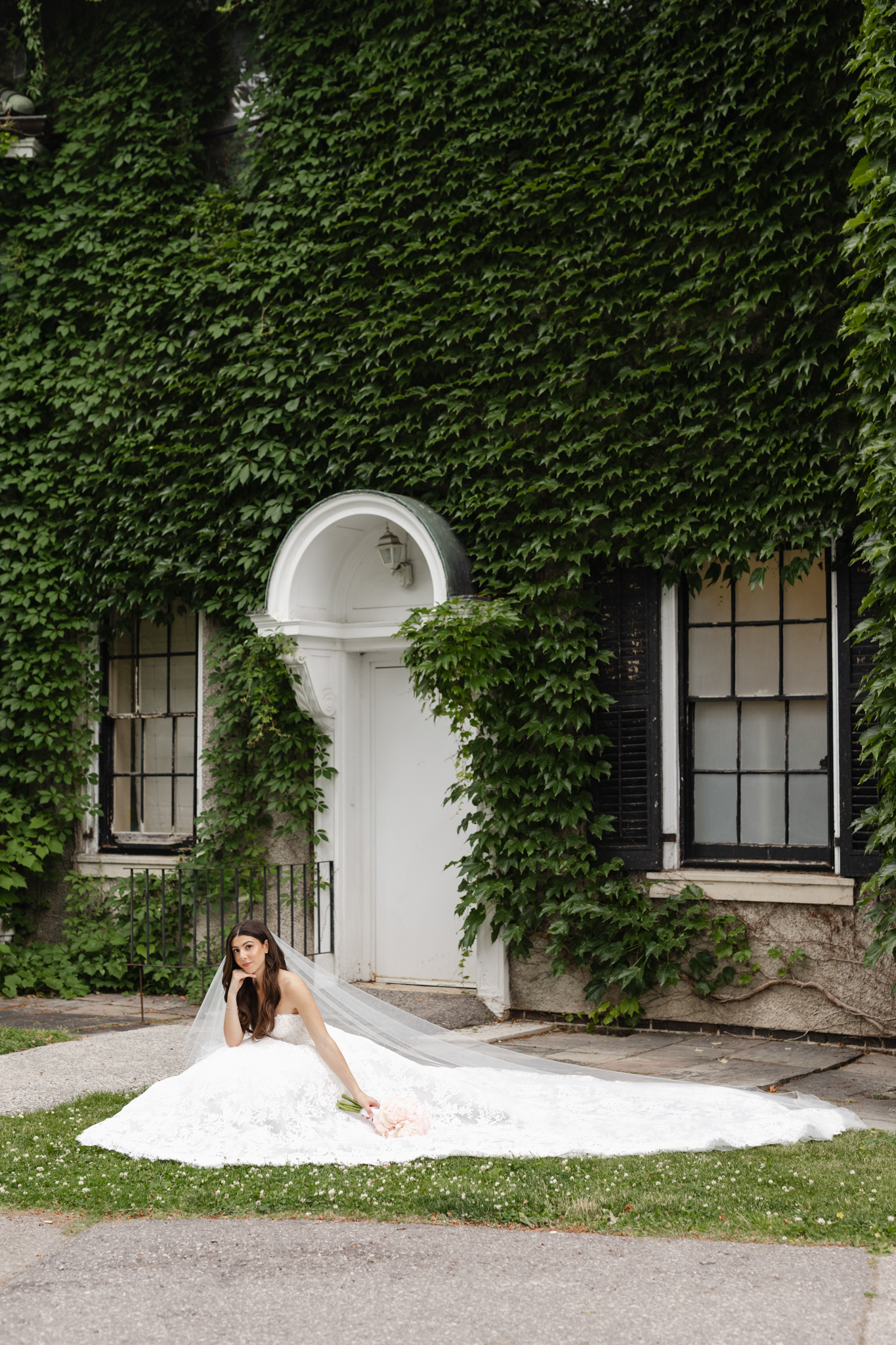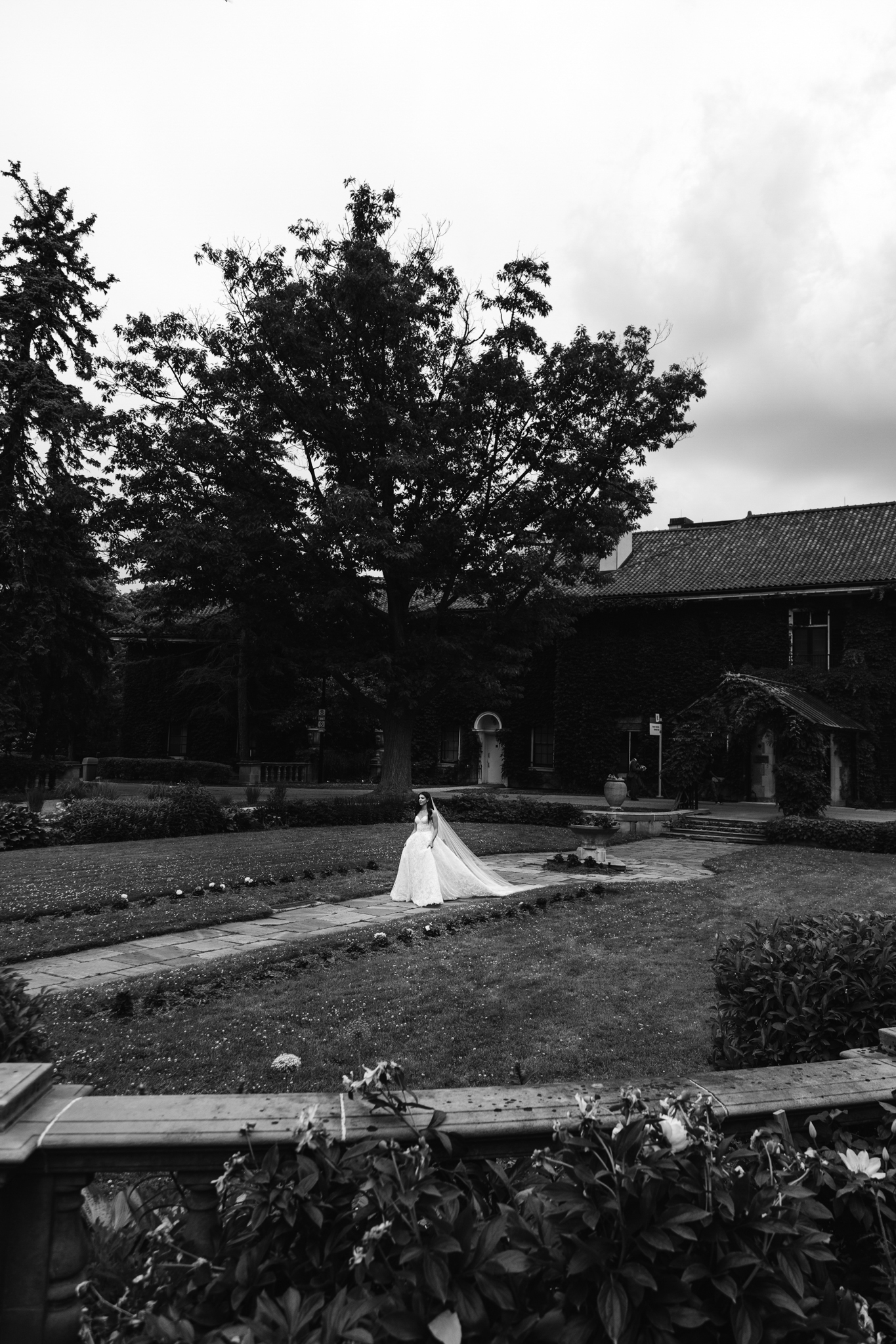 To balance out the backdrop of the car portraits, we headed to Glendon Campus for the the most romantic garden backdrop. The greenery, soft light and quiet atmosphere created a contrast to the modern glamour of the Rolls Royce. It was the perfect pairing for a couple whose style blended luxury with heartfelt romance.