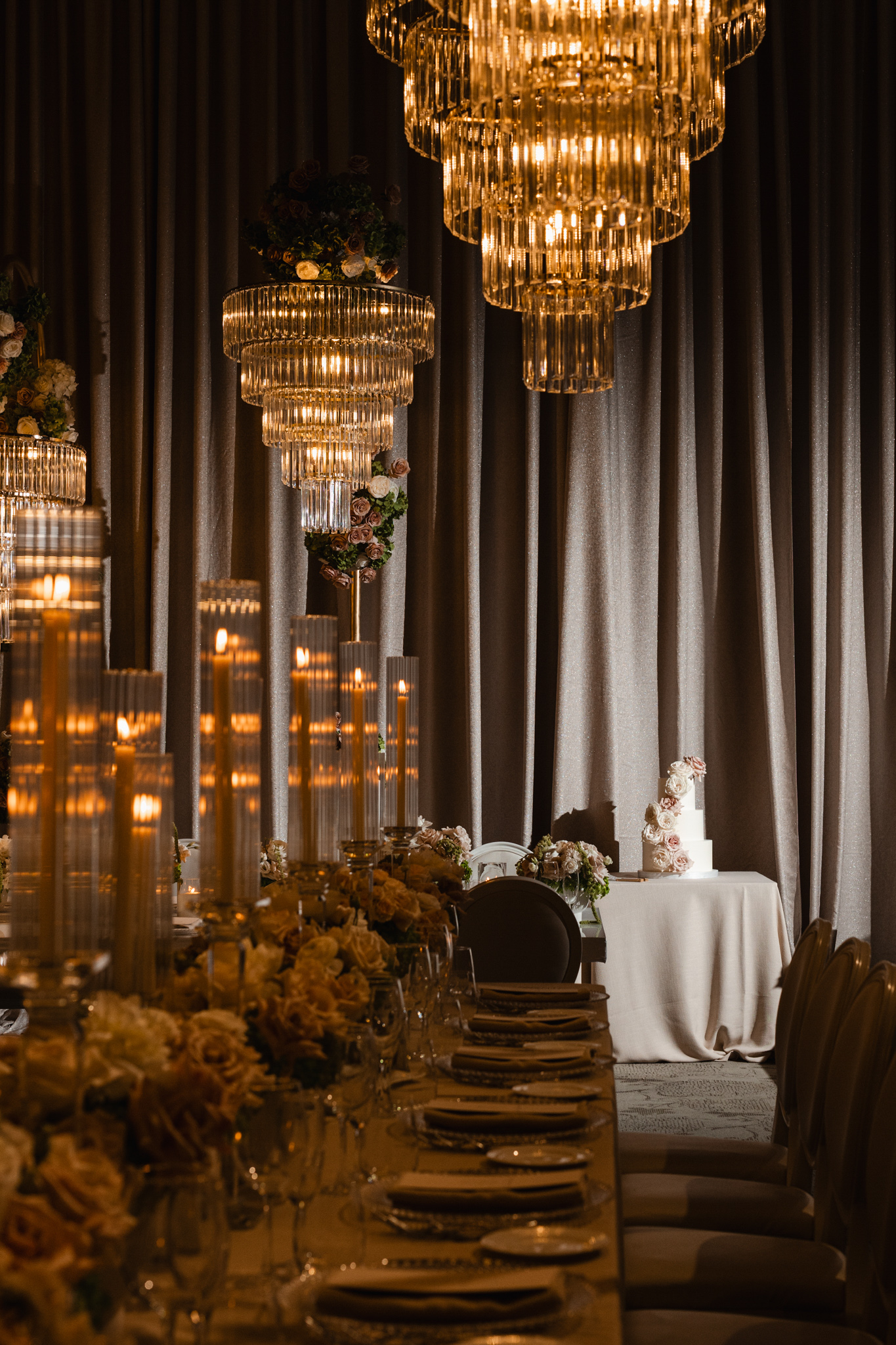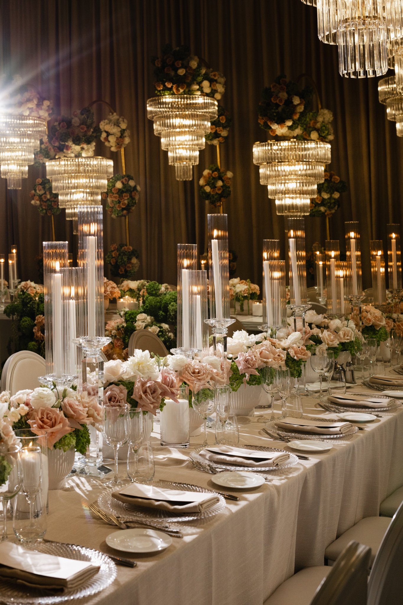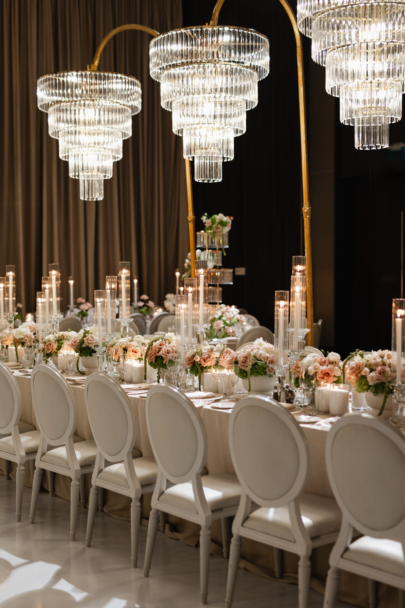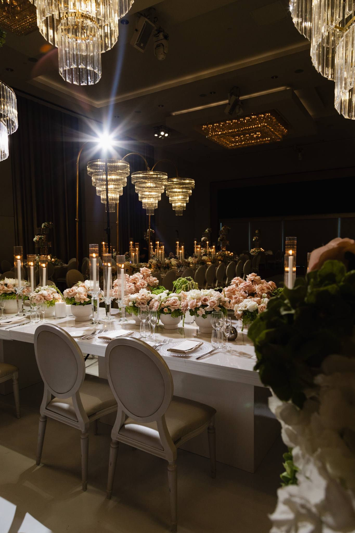 Hanging chandeliers cast a soft glow over the tables, where delicate florals, polished tableware and creamy neutrals created an elevated colour palette. Watching their faces take in every detail. The months of planning, the design choices, the vision finally coming to life, this is one of the moments we love most to capture.