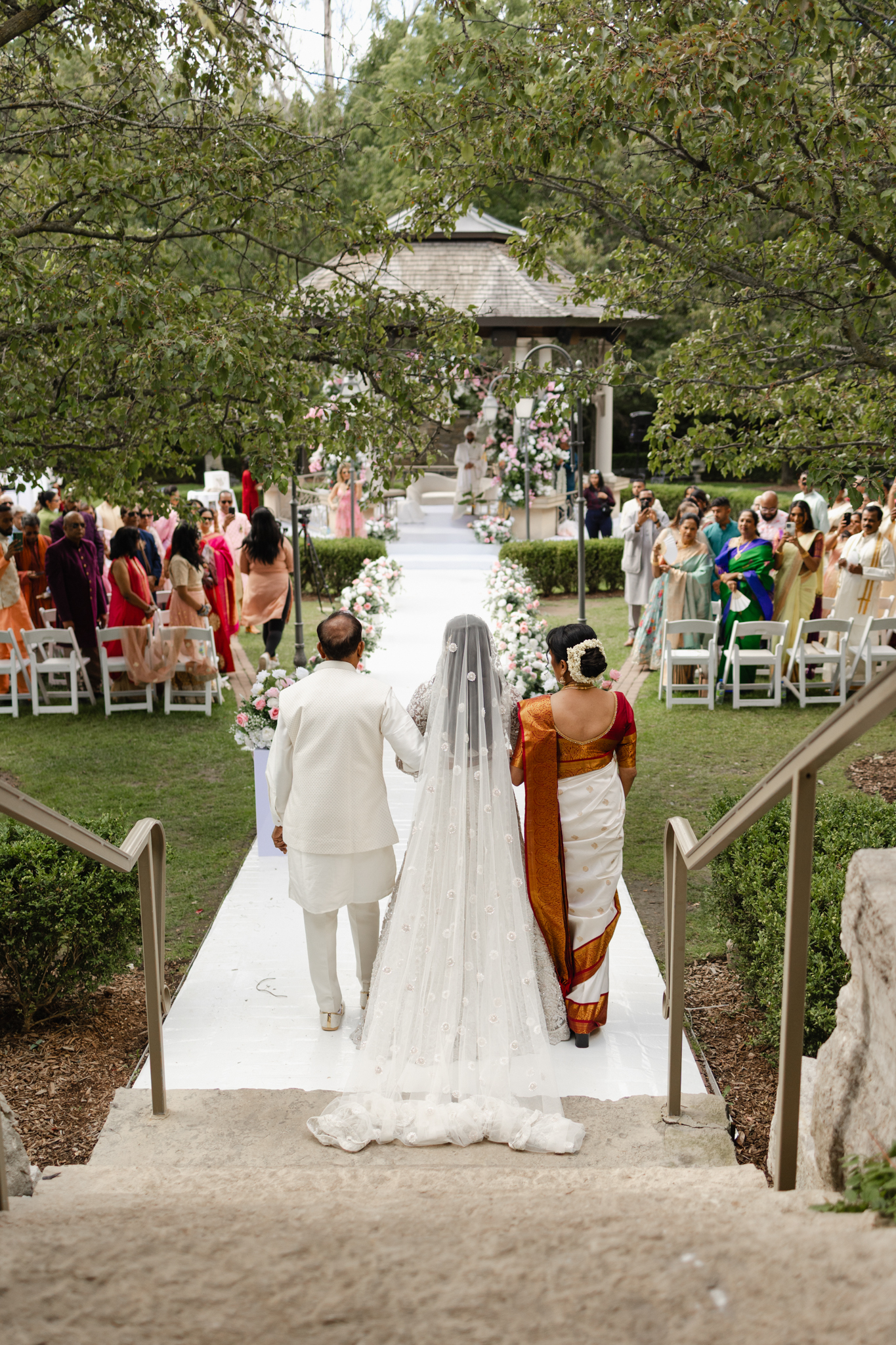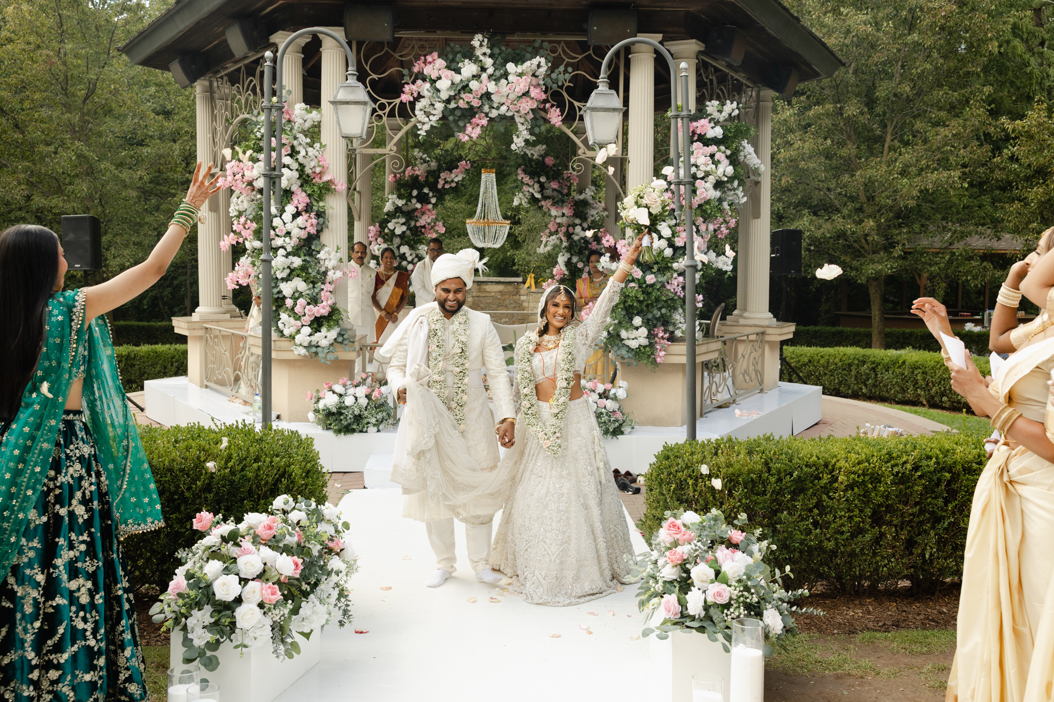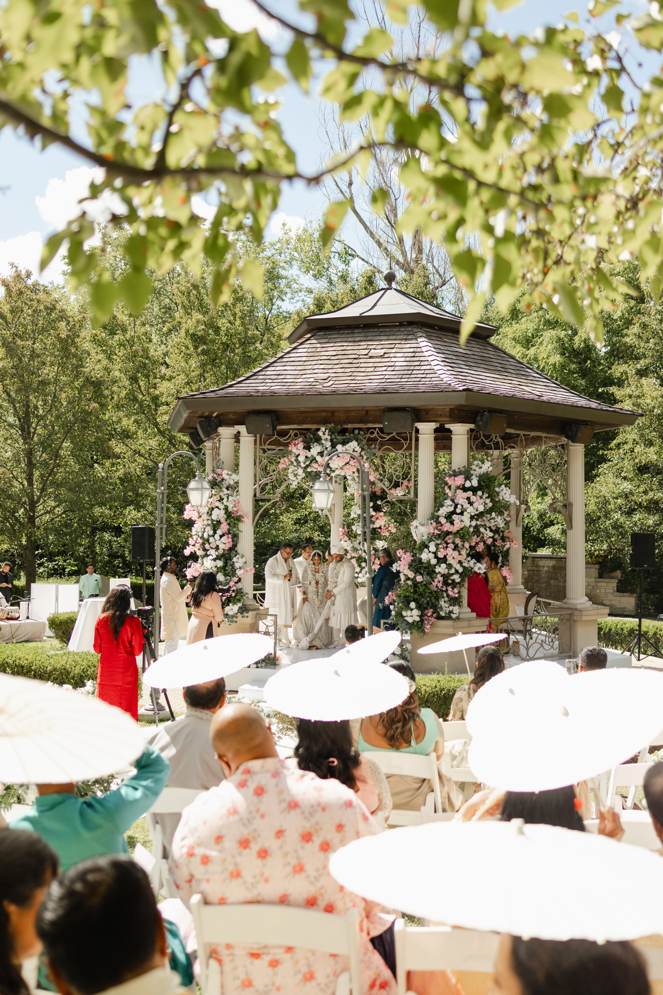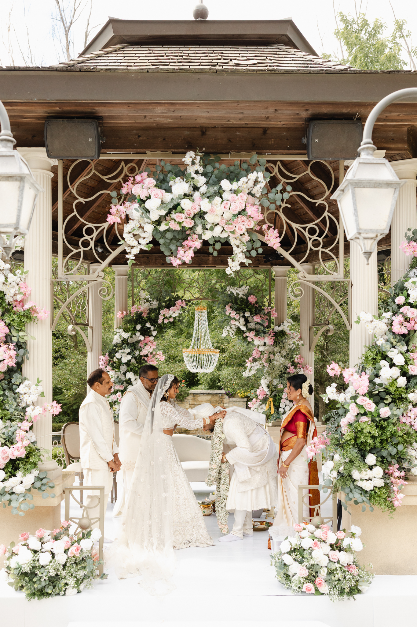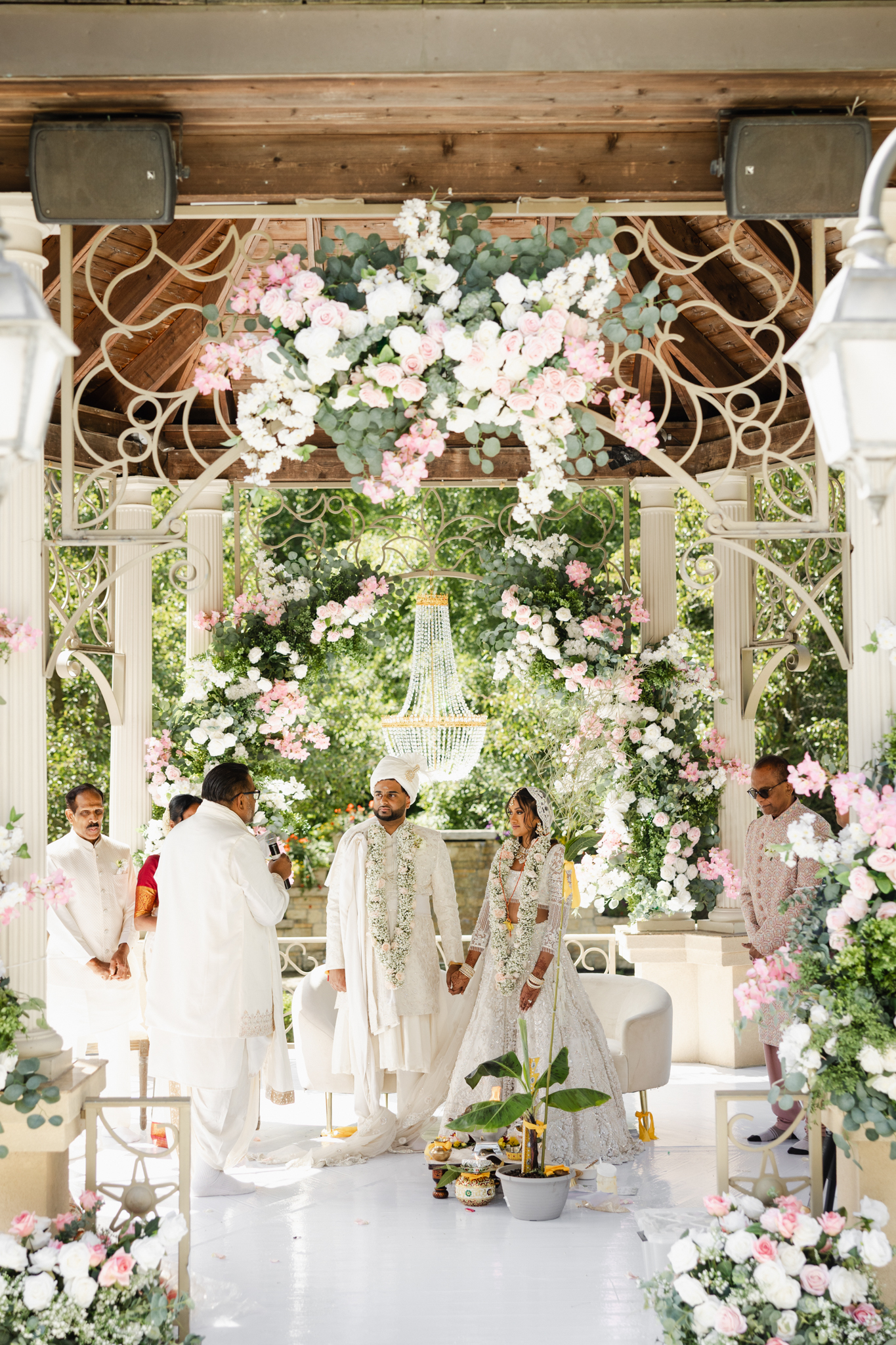 Their ceremony felt like a true experience for everyone attending. Arun and Withu thoughtfully curated every part of it, creating an atmosphere that felt both elegant and welcoming. Guests were greeted by live musicians and thoughtful touches throughout the space. An espresso truck kept everyone energized while gelato added a playful and unexpected detail that guests loved. It was the kind of celebration where every corner held something special. At the center of it all stood the most beautiful floral arch, framing the moment Arun and Withu exchanged their vows. Surrounded by loved ones and soft summer light, it was a ceremony filled with emotion.