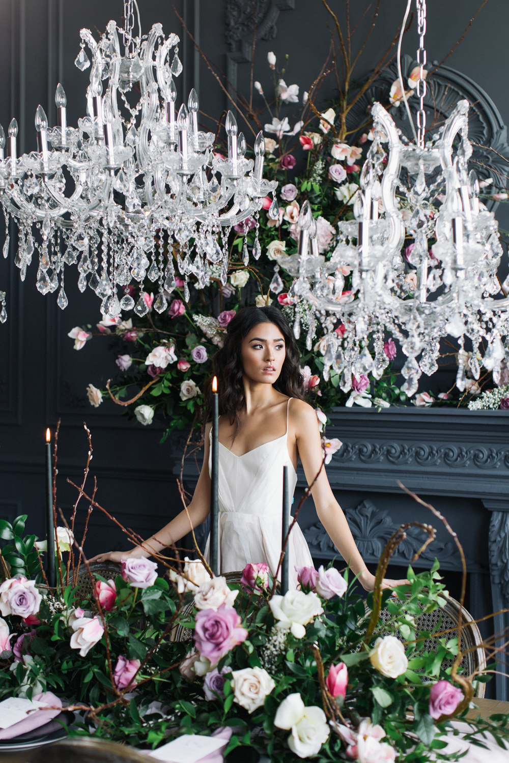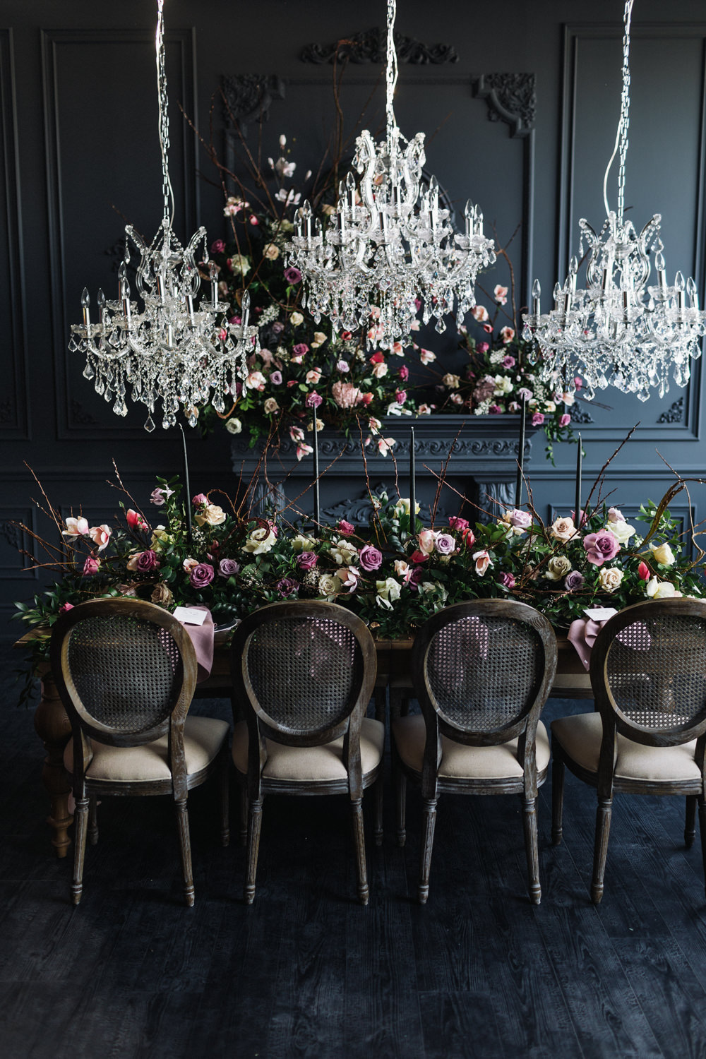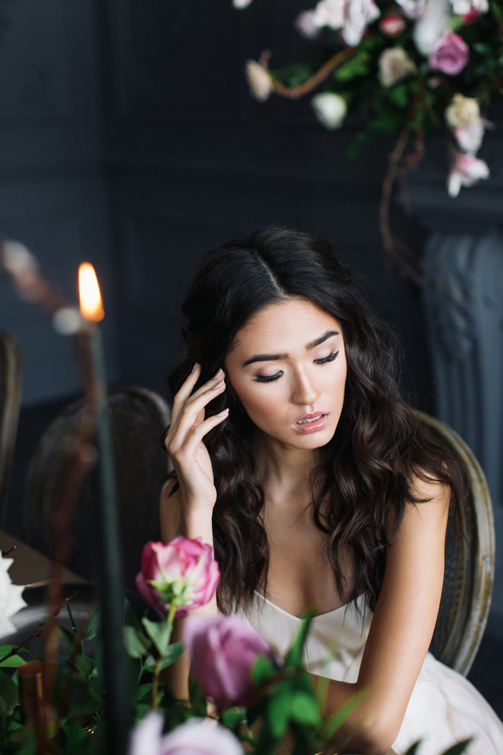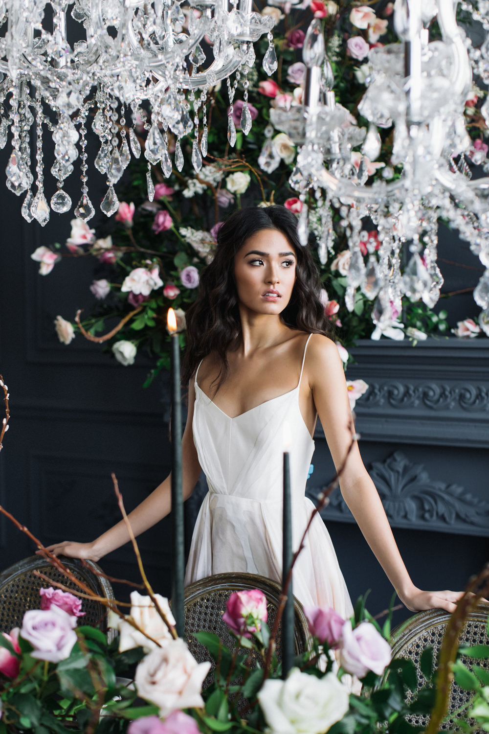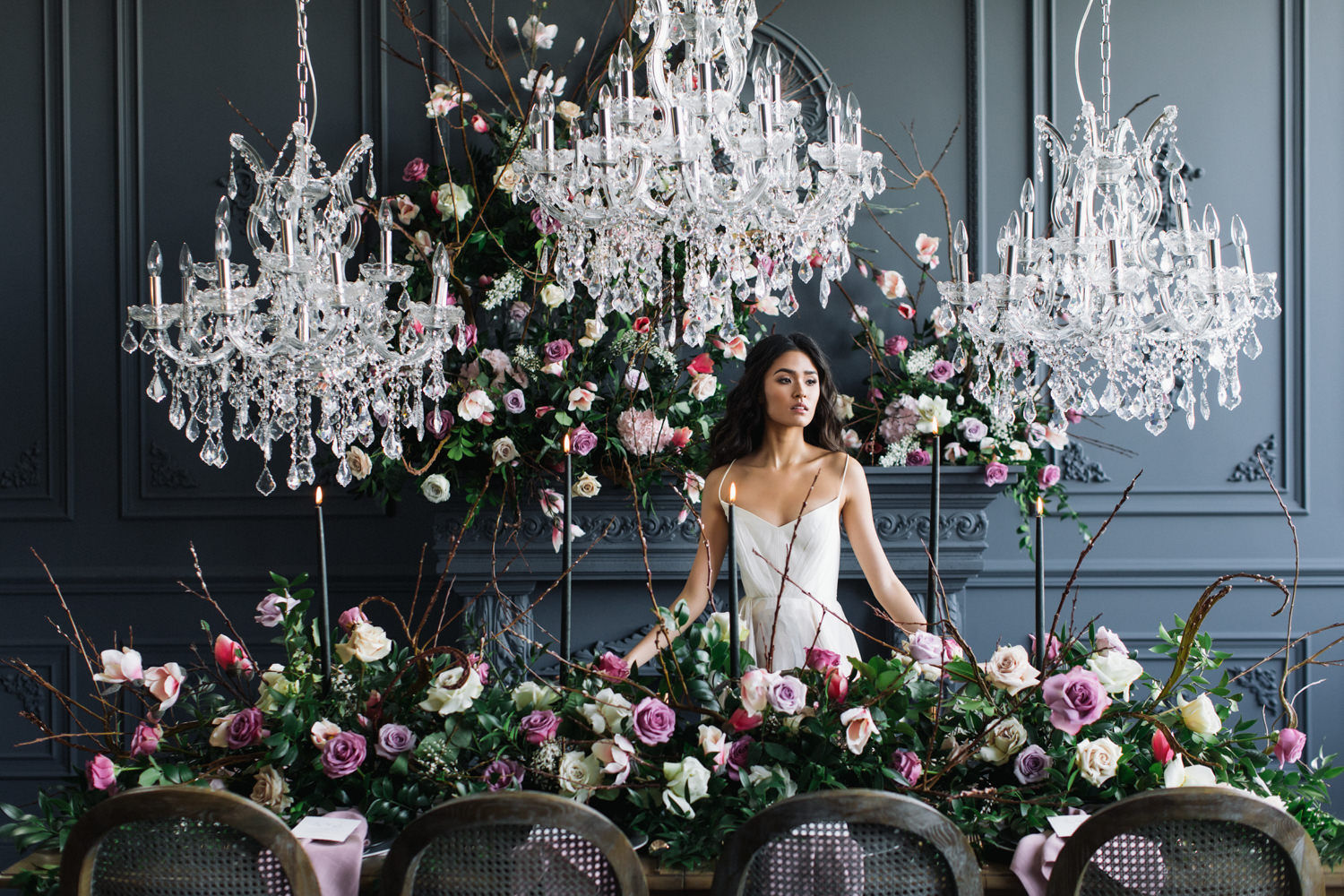 The dark grey Library Room of Mint Room Studios was an easy space to work with. Since a lot of the details and character come from the room itself, we brought it the twist to make it our own. In the set-up, cotton branches were intertwined with an abundance of blossoming flowers. Wicker chairs were put around the wooden harvest table, which was adorned by a low-lavish centerpiece of roses and magnolias, as well as majestic tall black candles. There were low-hung chandeliers too, that added a much-welcomed eye luxury on the set. Combined all together, these elements were enough to transport us to another dimension.