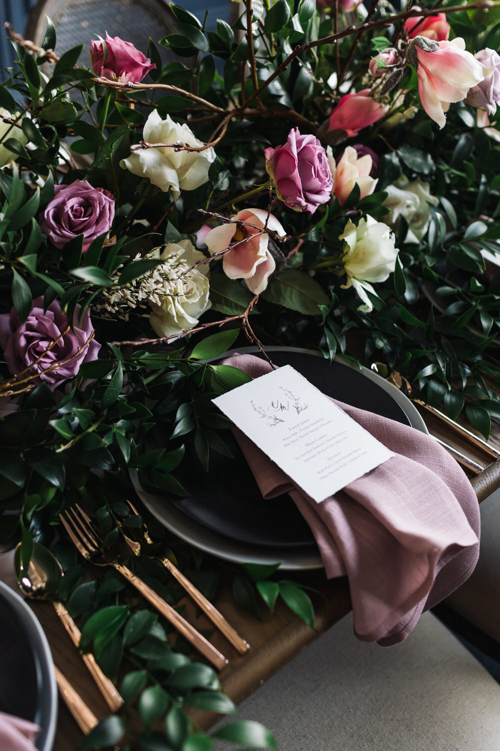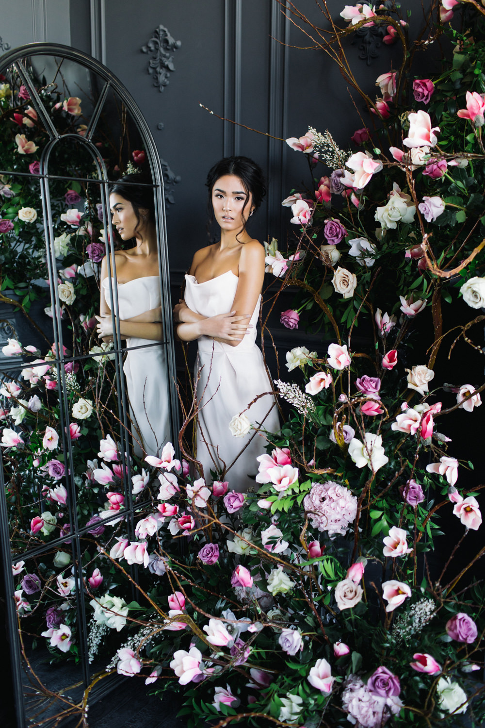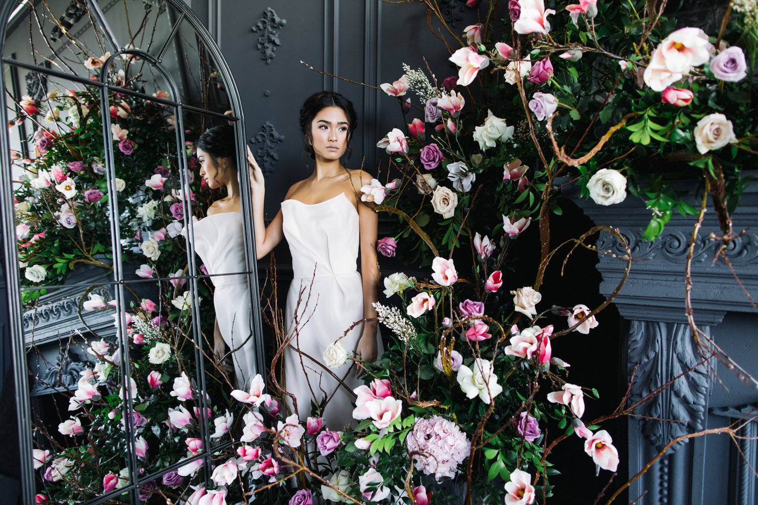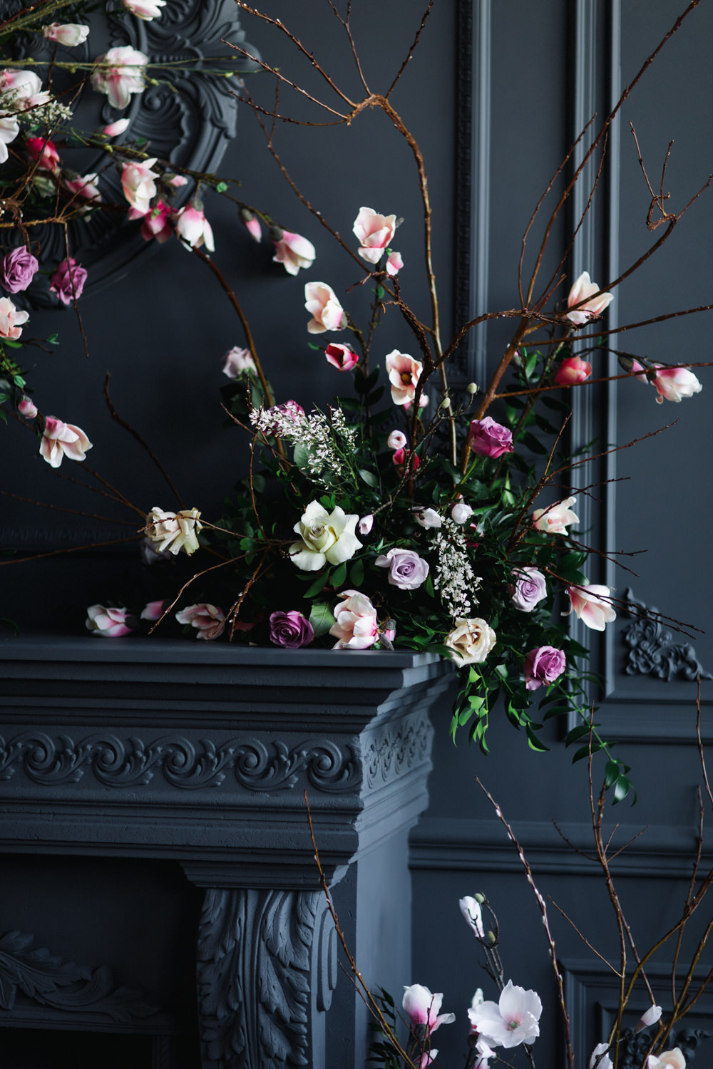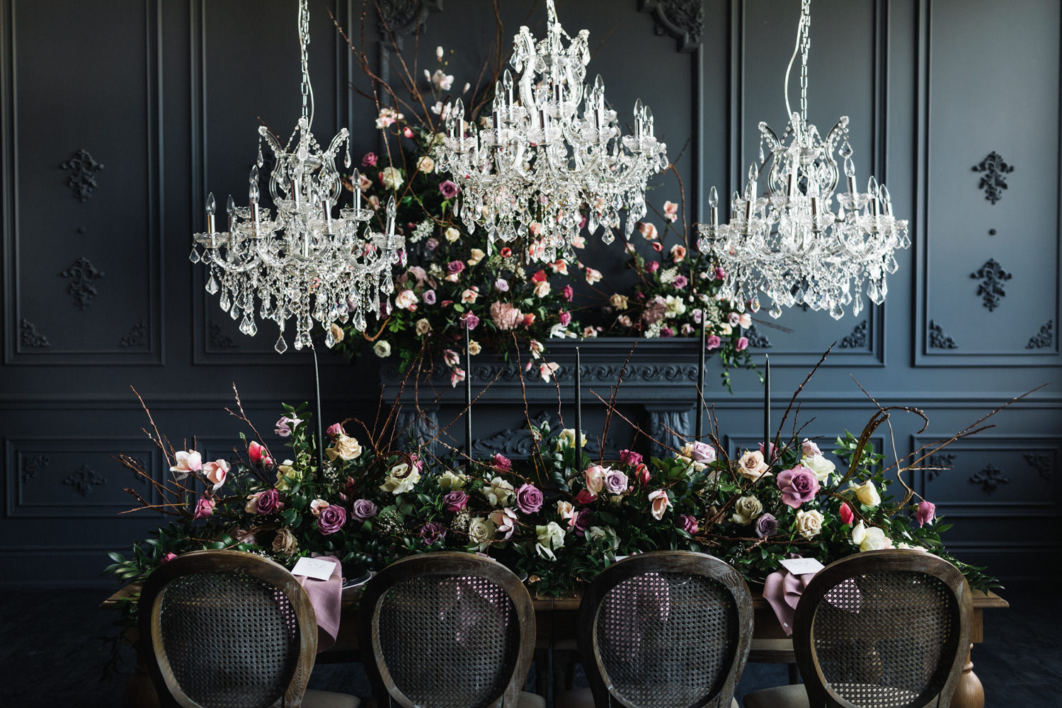 The dark grey Library Room of Mint Room Studios was an easy space to work with. Since a lot of the details and character come from the room itself, we brought it the twist to make it our own. In the set-up, cotton branches were intertwined with an abundance of blossoming flowers. Wicker chairs were put around the wooden harvest table, which was adorned by a low-lavish centerpiece of roses and magnolias, as well as majestic tall black candles. There were low-hung chandeliers too, that added a much-welcomed eye luxury on the set. Combined all together, these elements were enough to transport us to another dimension.