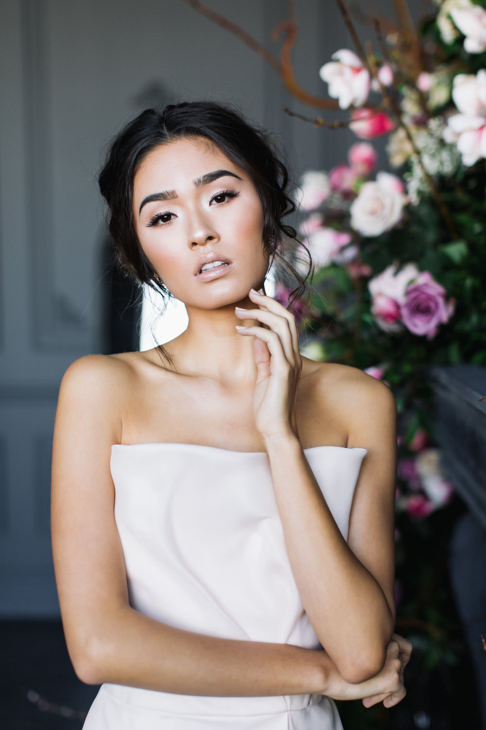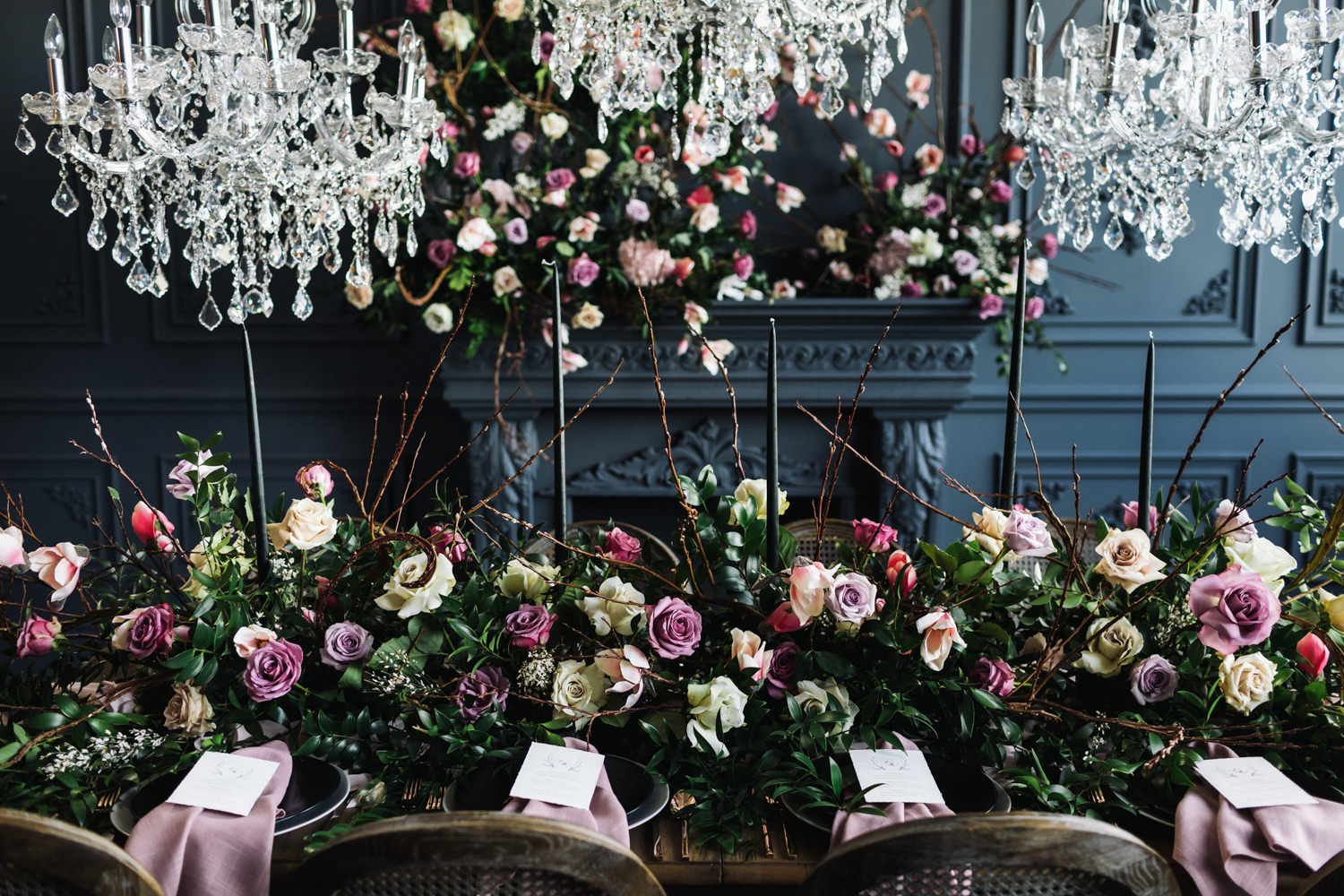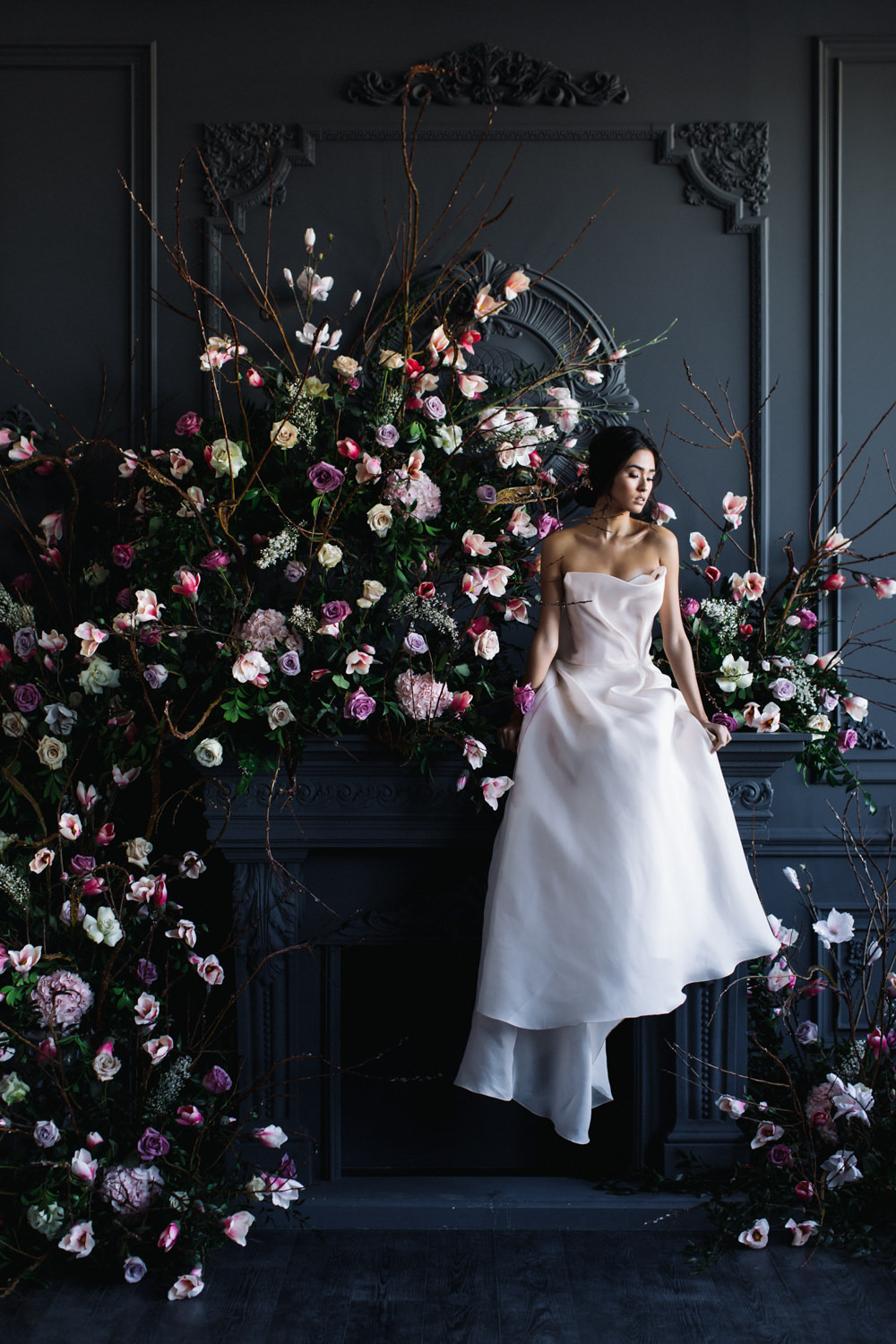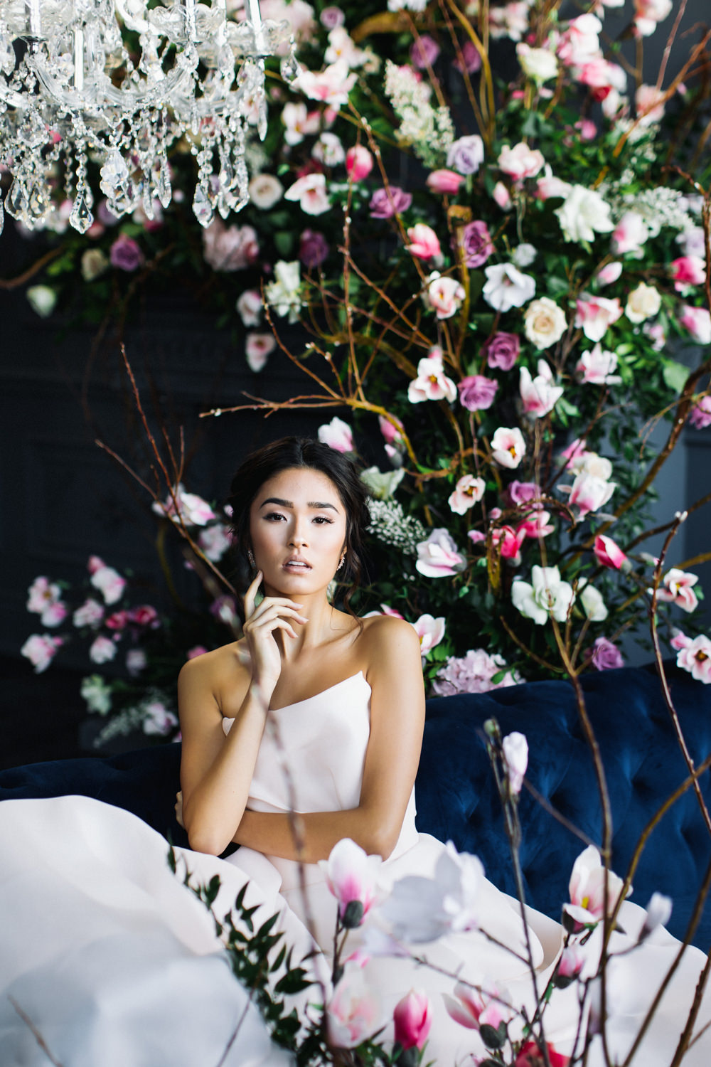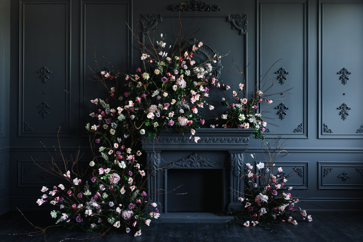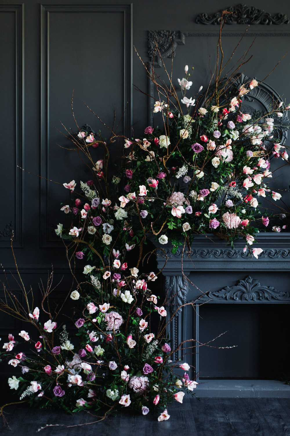 The dark grey Library Room of Mint Room Studios was an easy space to work with. Since a lot of the details and character come from the room itself, we brought it the twist to make it our own. In the set-up, cotton branches were intertwined with an abundance of blossoming flowers. Wicker chairs were put around the wooden harvest table, which was adorned by a low-lavish centerpiece of roses and magnolias, as well as majestic tall black candles. There were low-hung chandeliers too, that added a much-welcomed eye luxury on the set. Combined all together, these elements were enough to transport us to another dimension.