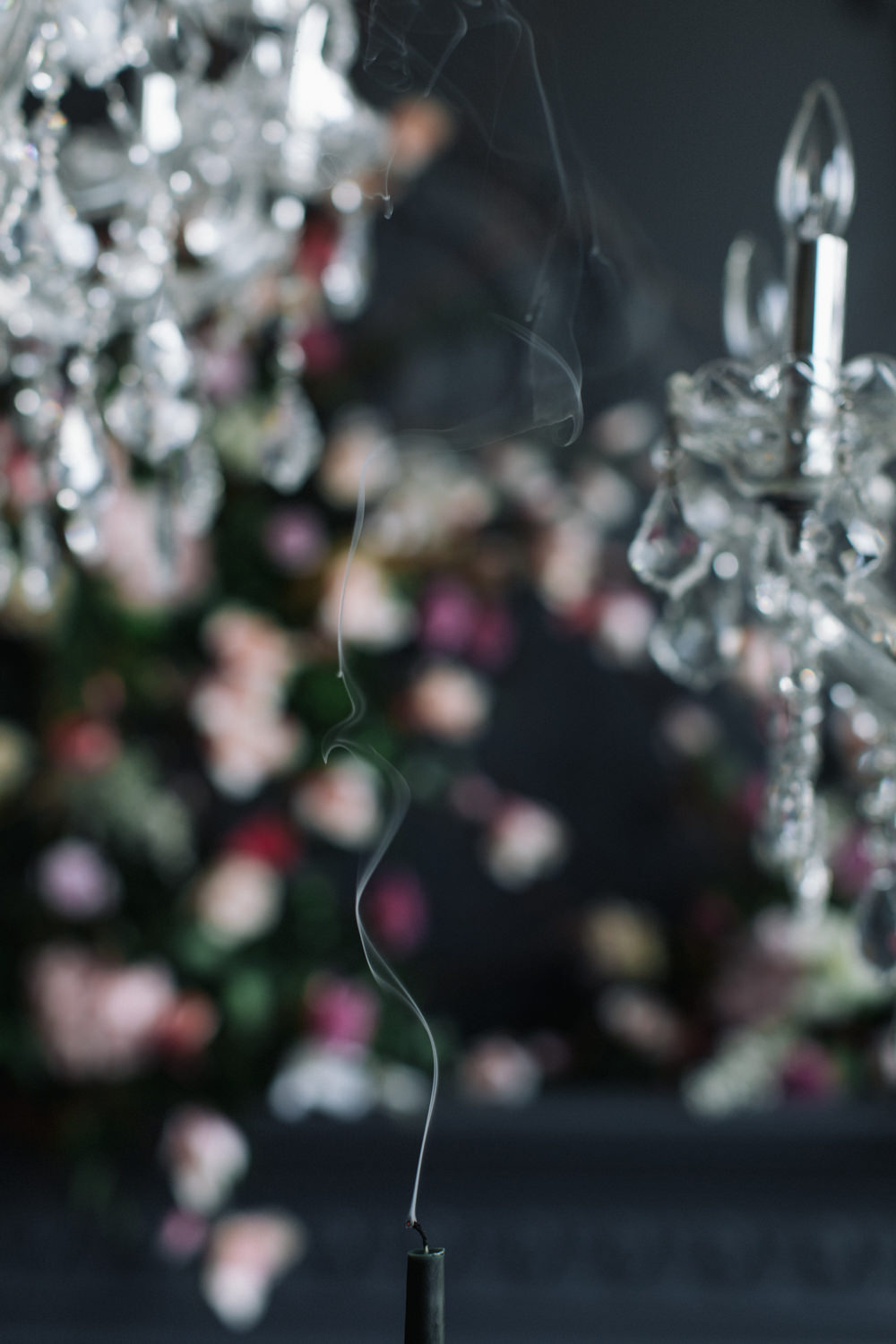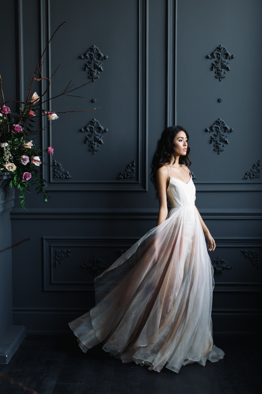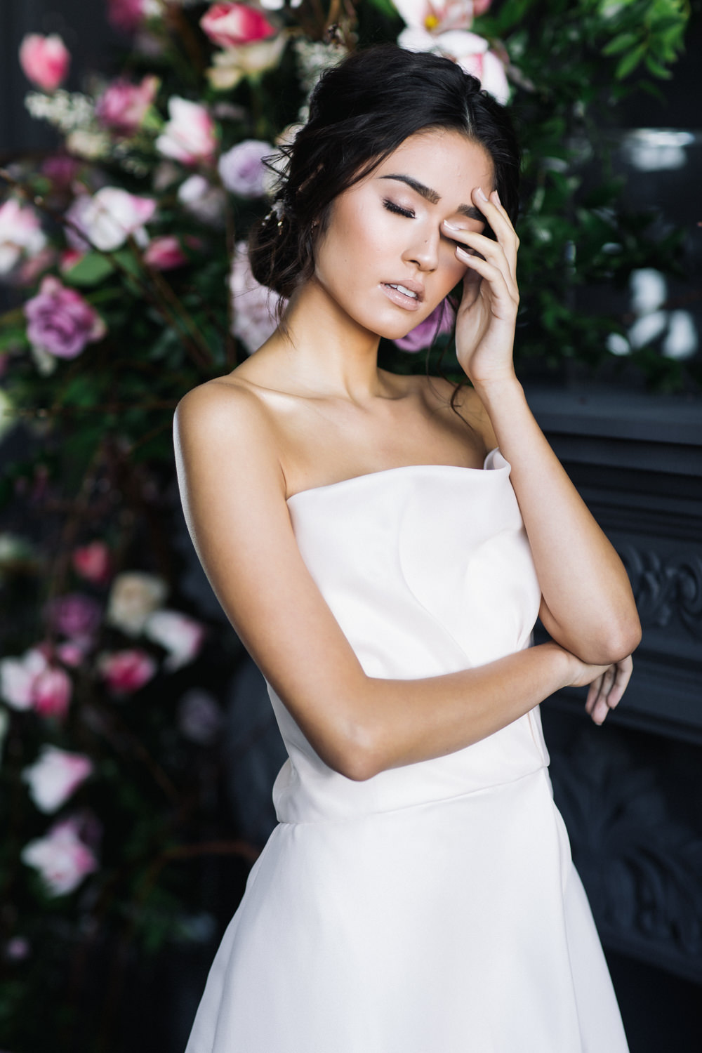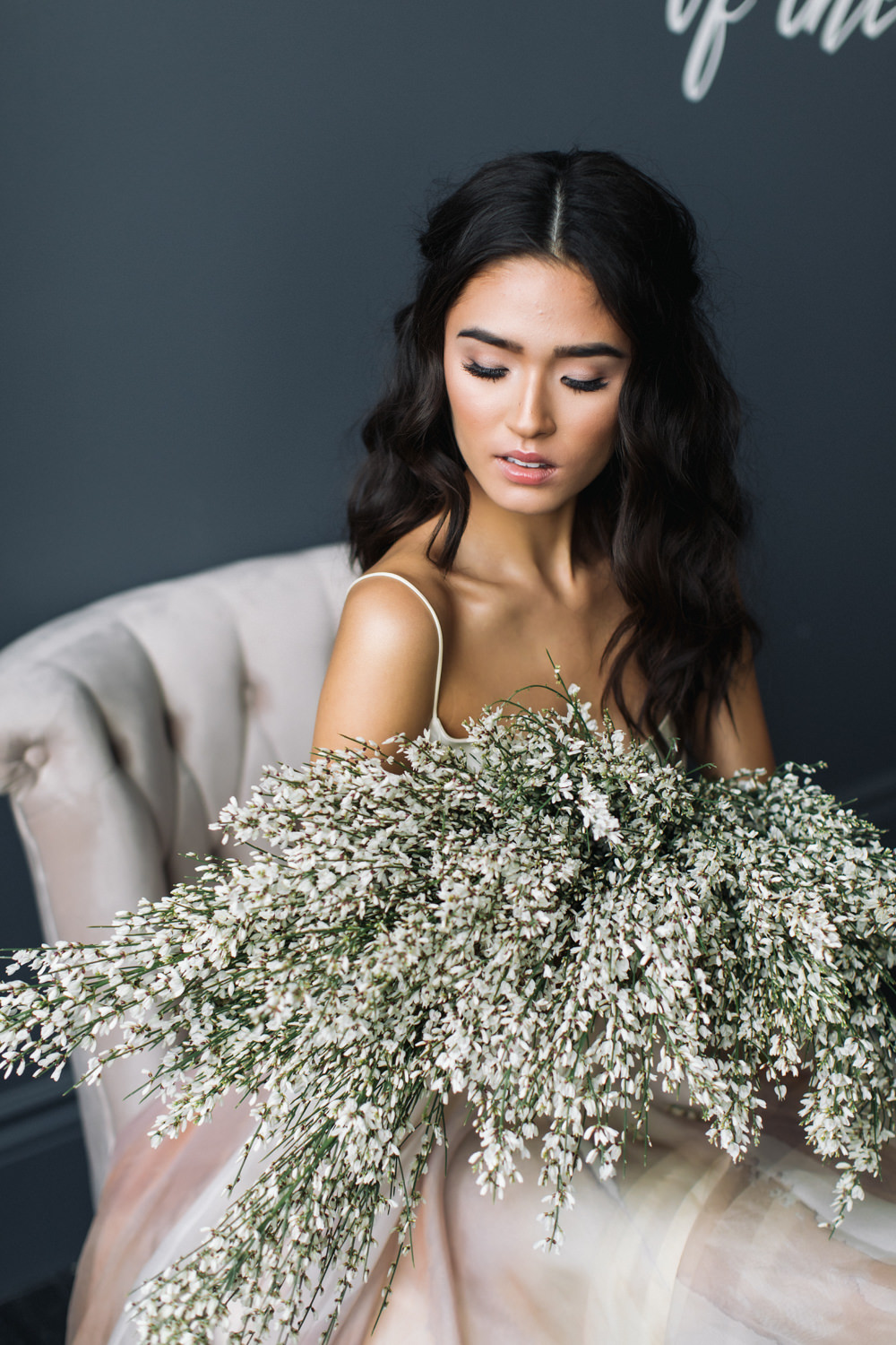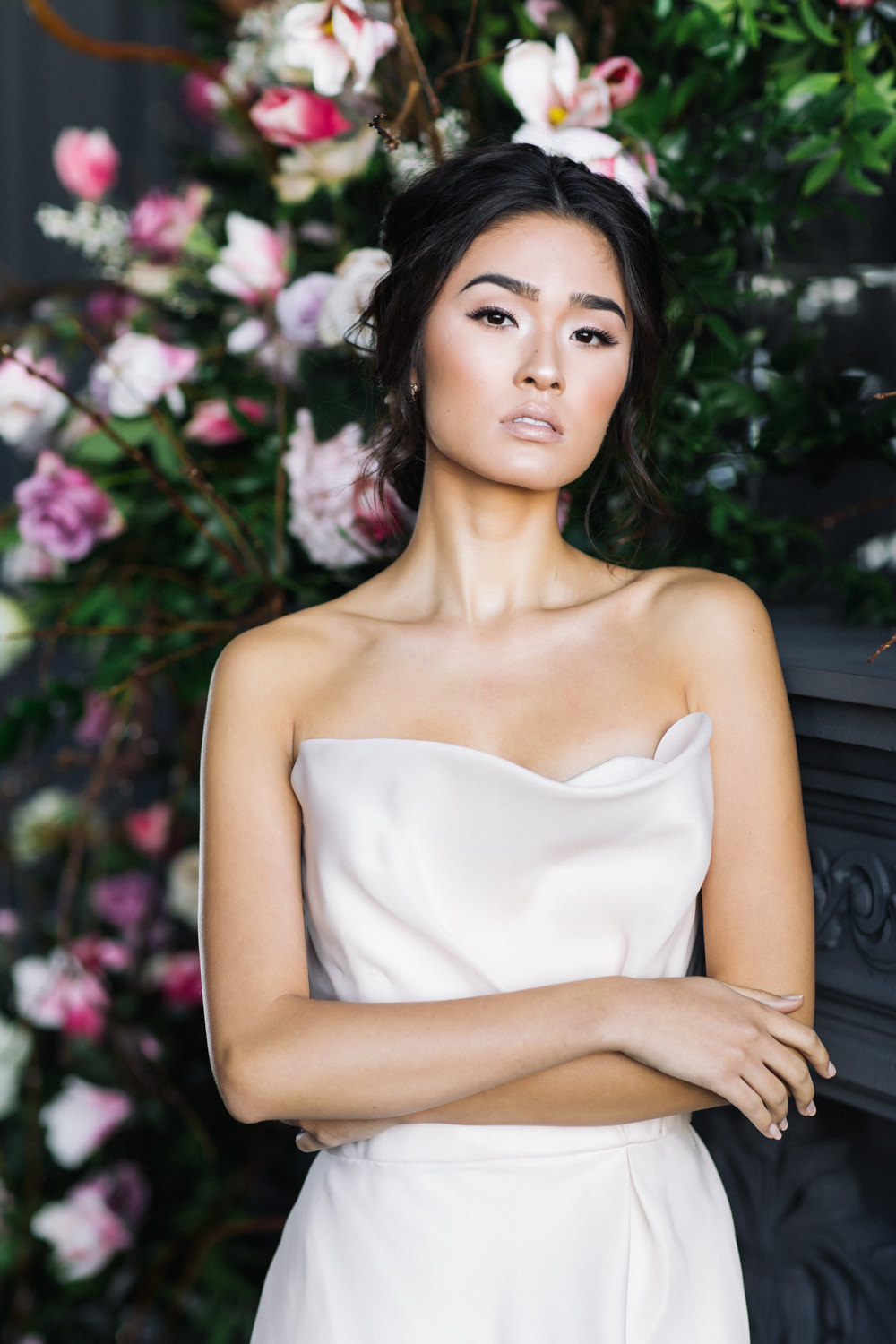 The dark grey Library Room of Mint Room Studios was an easy space to work with. Since a lot of the details and character come from the room itself, we brought it the twist to make it our own. In the set-up, cotton branches were intertwined with an abundance of blossoming flowers. Wicker chairs were put around the wooden harvest table, which was adorned by a low-lavish centerpiece of roses and magnolias, as well as majestic tall black candles. There were low-hung chandeliers too, that added a much-welcomed eye luxury on the set. Combined all together, these elements were enough to transport us to another dimension.