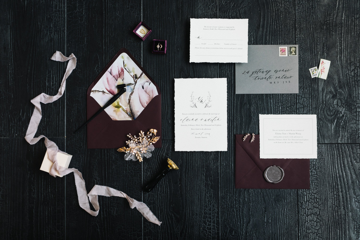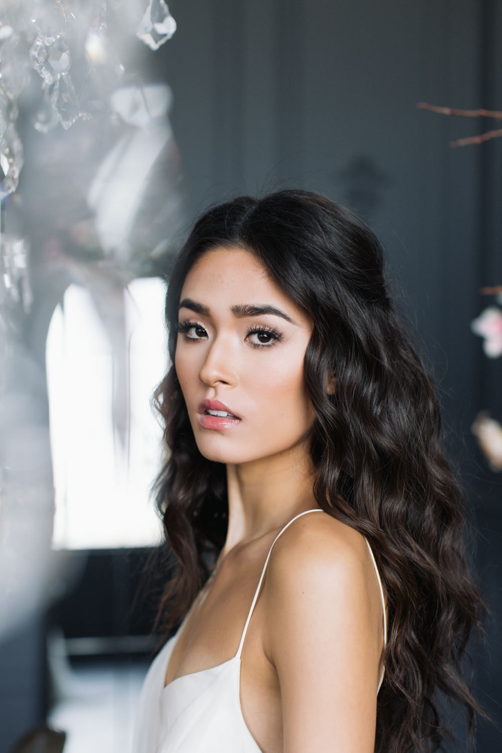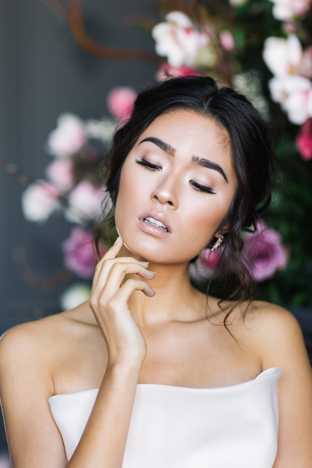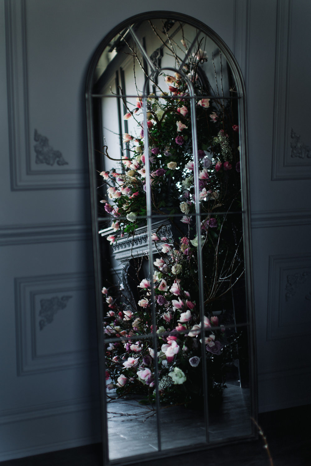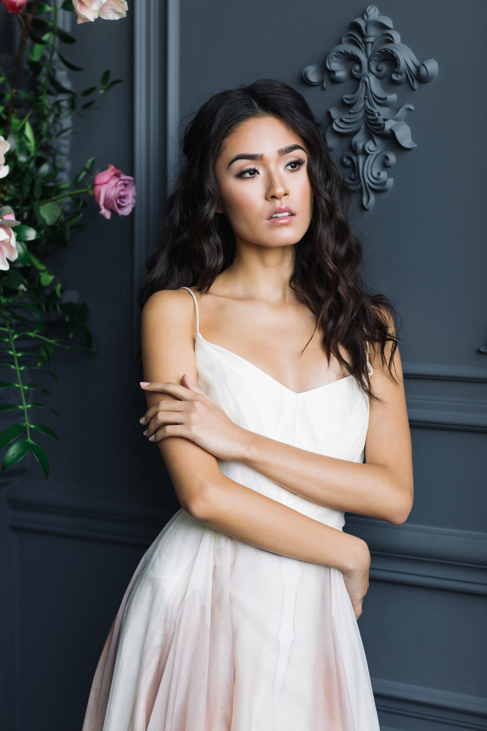 The dark grey Library Room of Mint Room Studios was an easy space to work with. Since a lot of the details and character come from the room itself, we brought it the twist to make it our own. In the set-up, cotton branches were intertwined with an abundance of blossoming flowers. Wicker chairs were put around the wooden harvest table, which was adorned by a low-lavish centerpiece of roses and magnolias, as well as majestic tall black candles. There were low-hung chandeliers too, that added a much-welcomed eye luxury on the set. Combined all together, these elements were enough to transport us to another dimension.