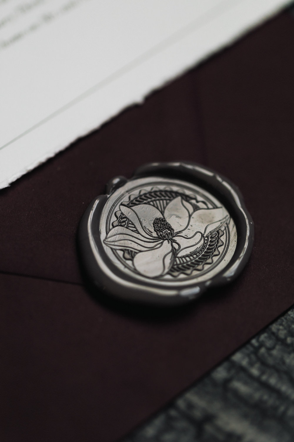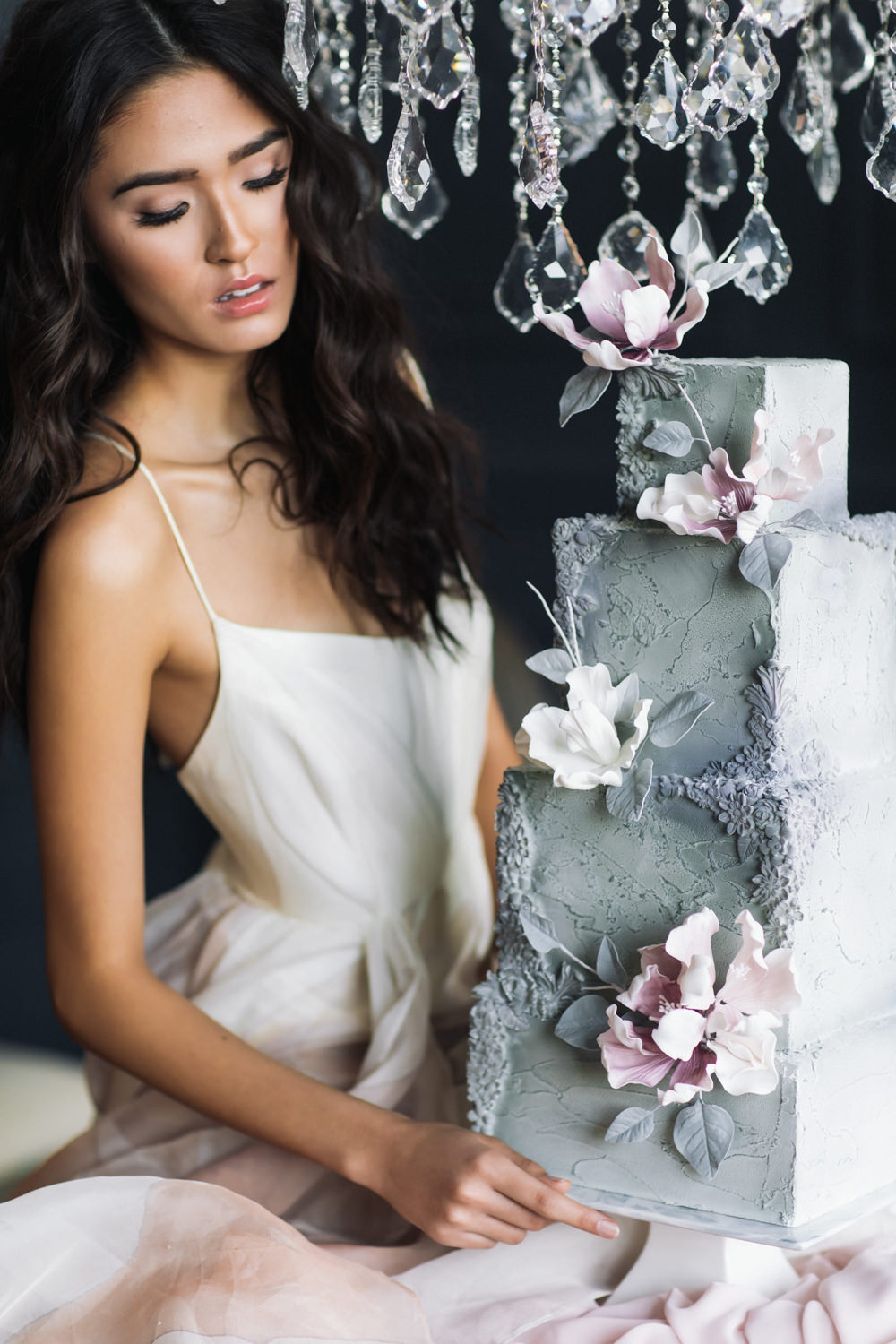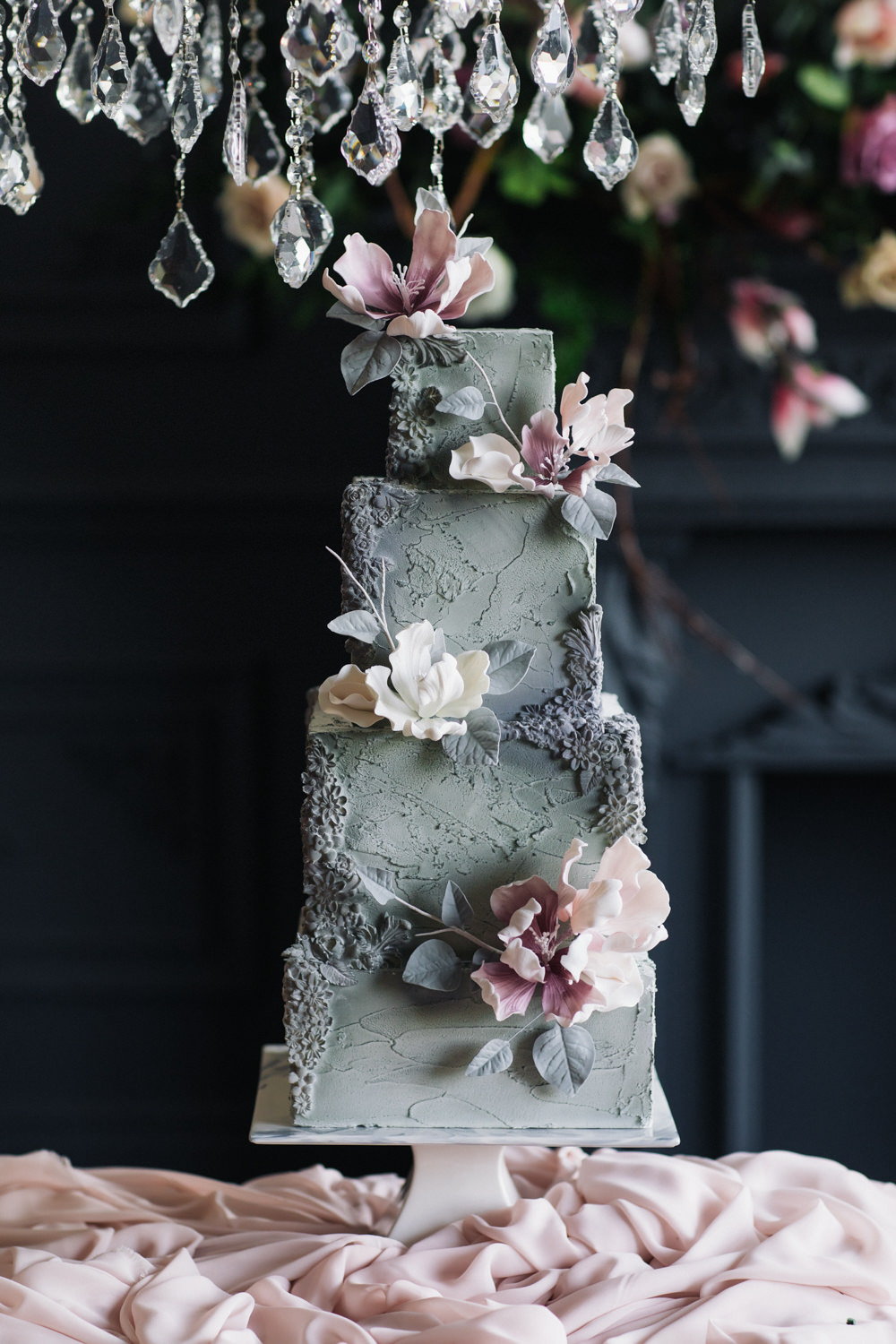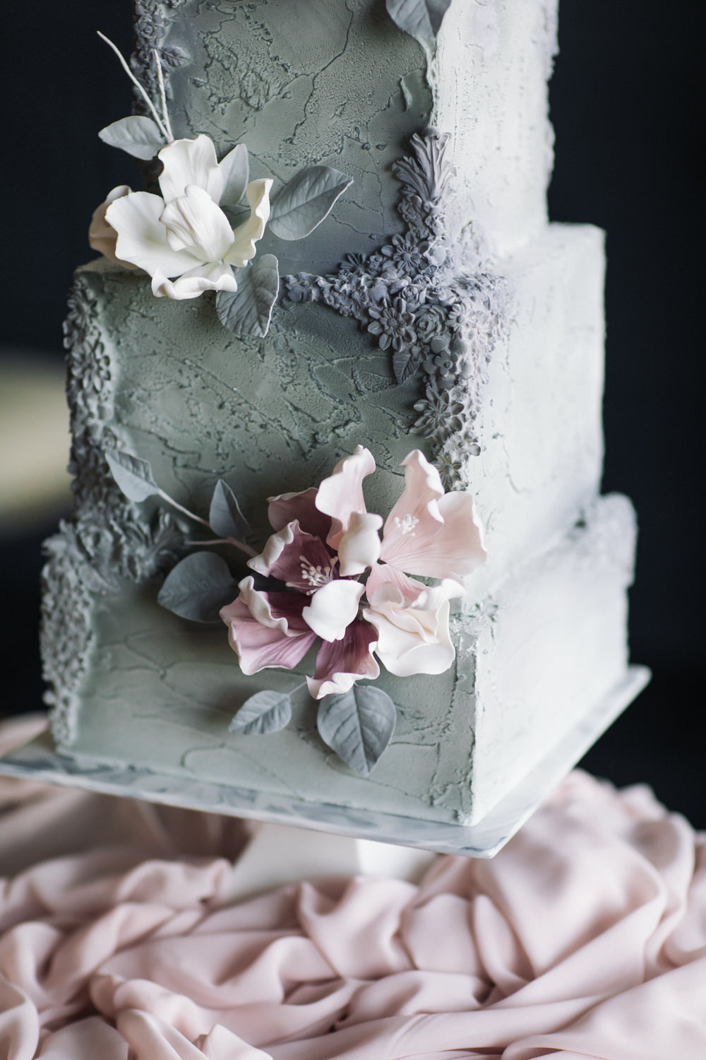 Another favourite element of ours in this shoot is the wedding cake. As unusual as it is, the cake was made of a soft grey-green hue, to complement the theme of the shoot. The cake was texturized on the surface, and garnished with touches of magnolia flowers on the outside, intricately handcrafted by the artists of Sweet Philosophy.