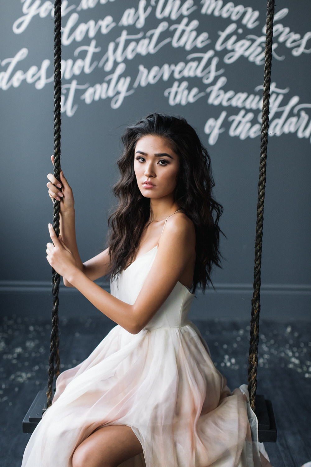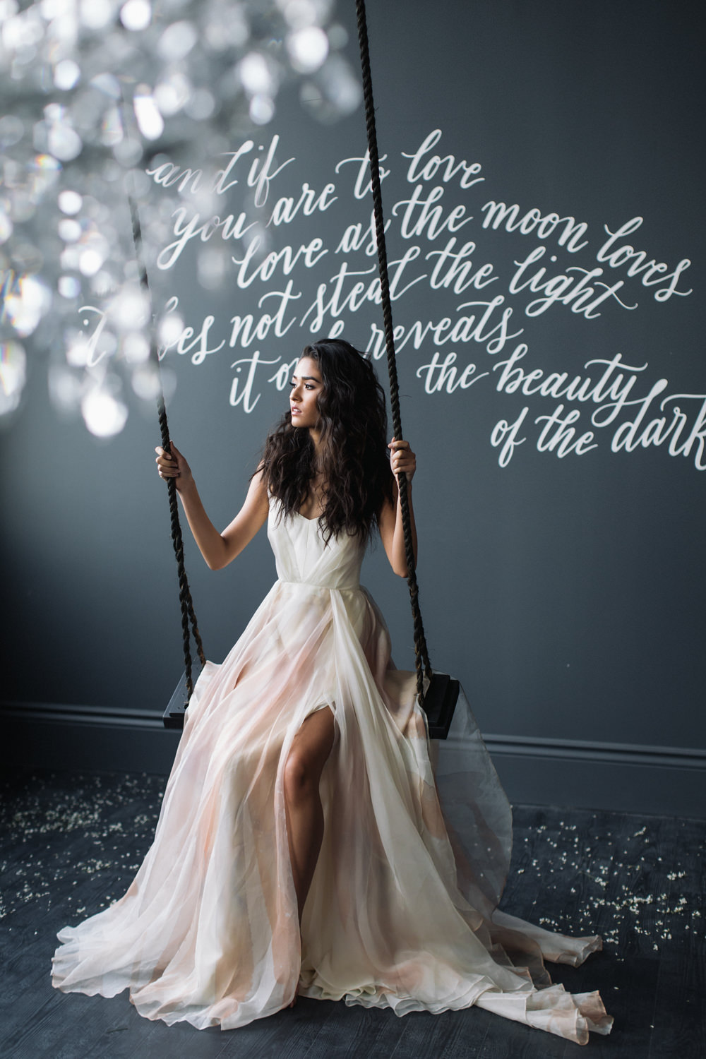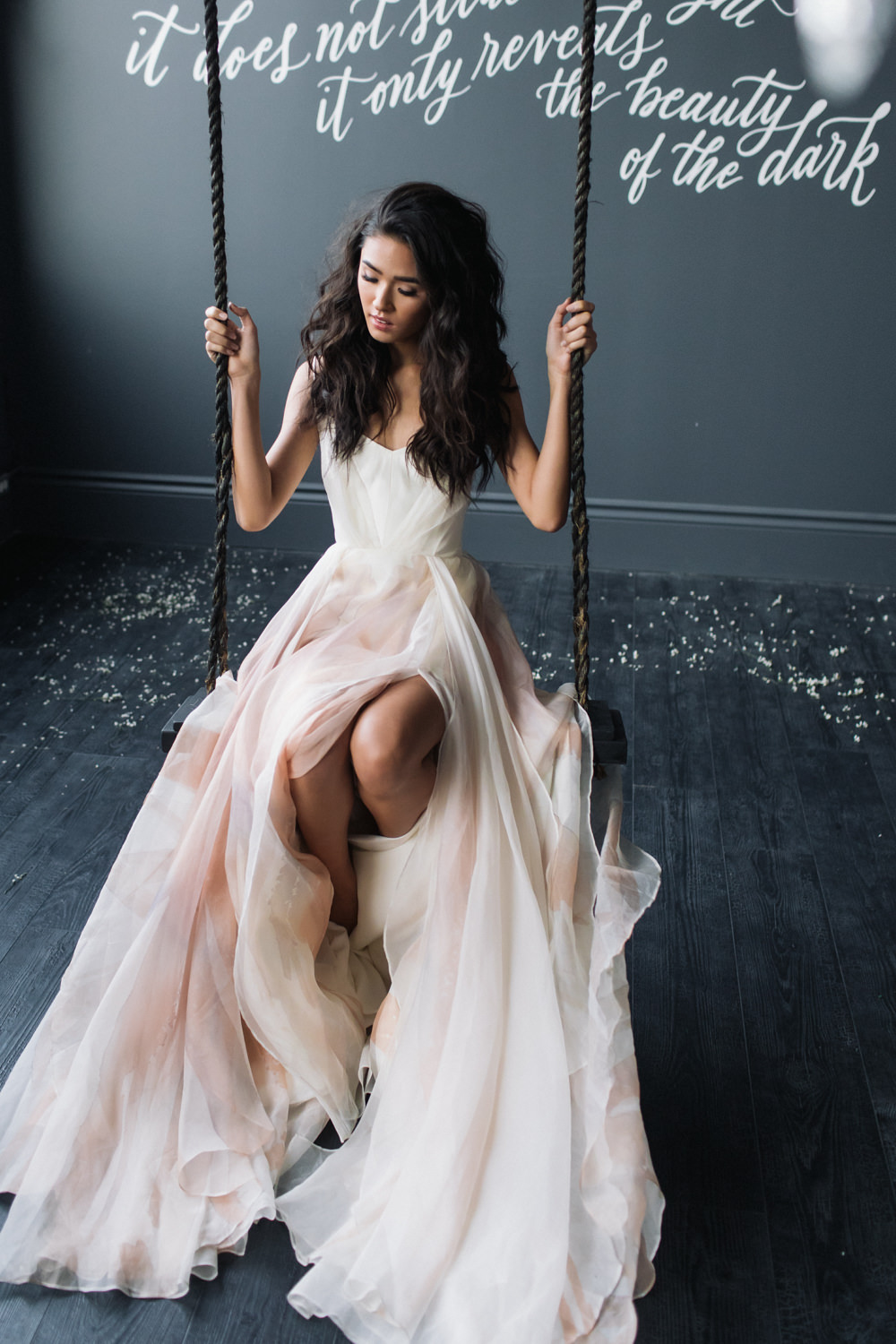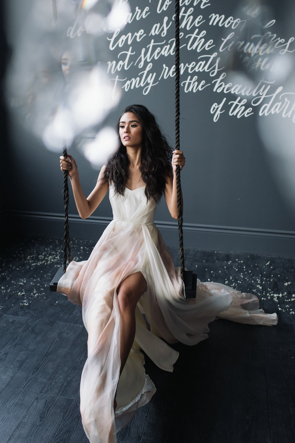 And last but not the least – like a fairy princess in waiting, the bride looked stunning as she was seated on the dark swing that hung from the ceiling of the dark grey room. This shoot was featured in the first issue of Bridal Affair Magazine!