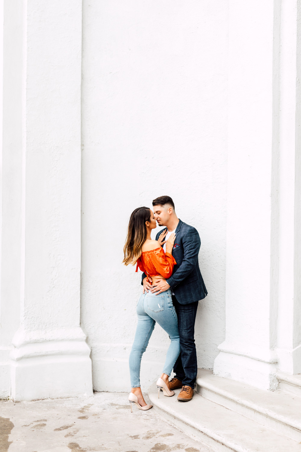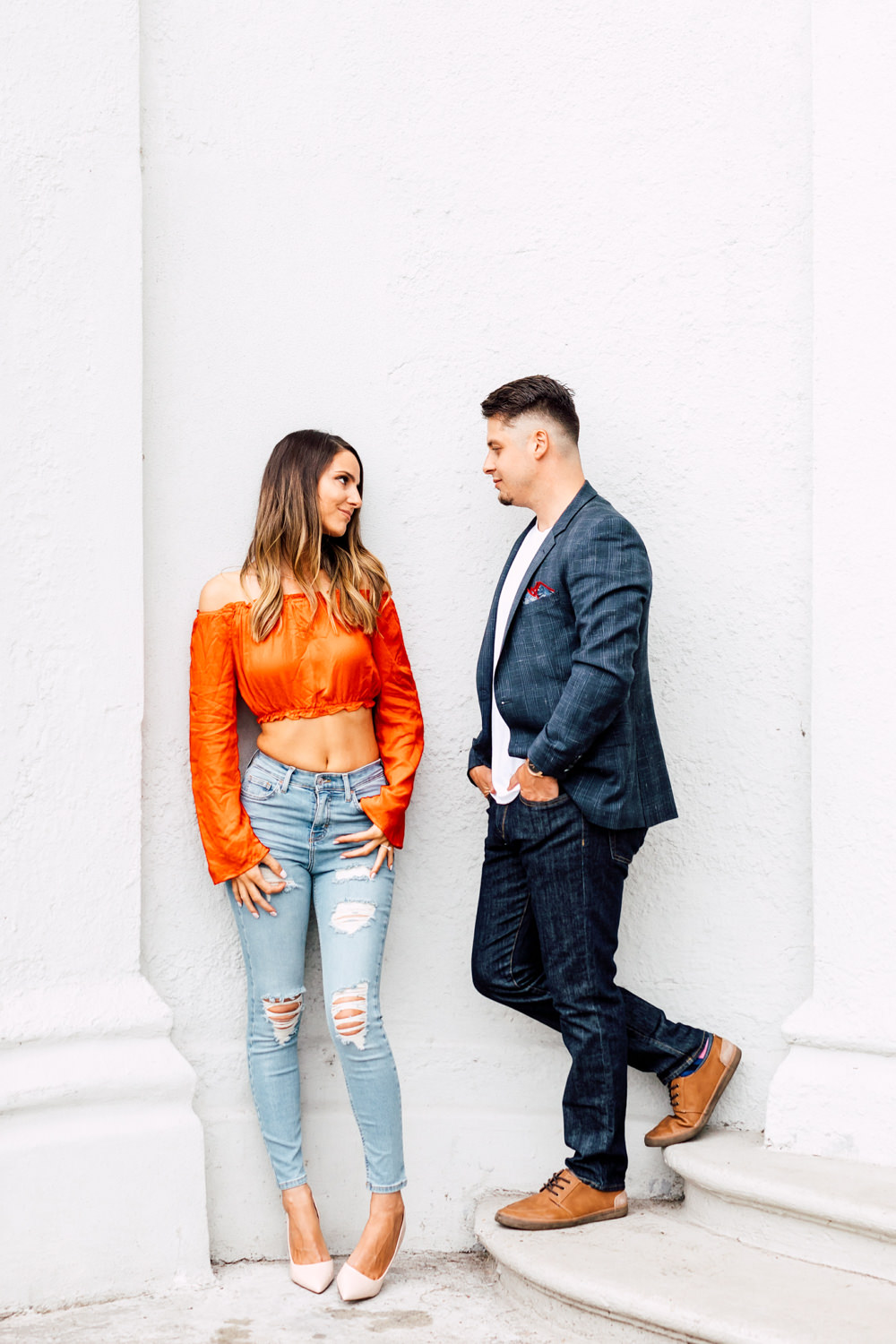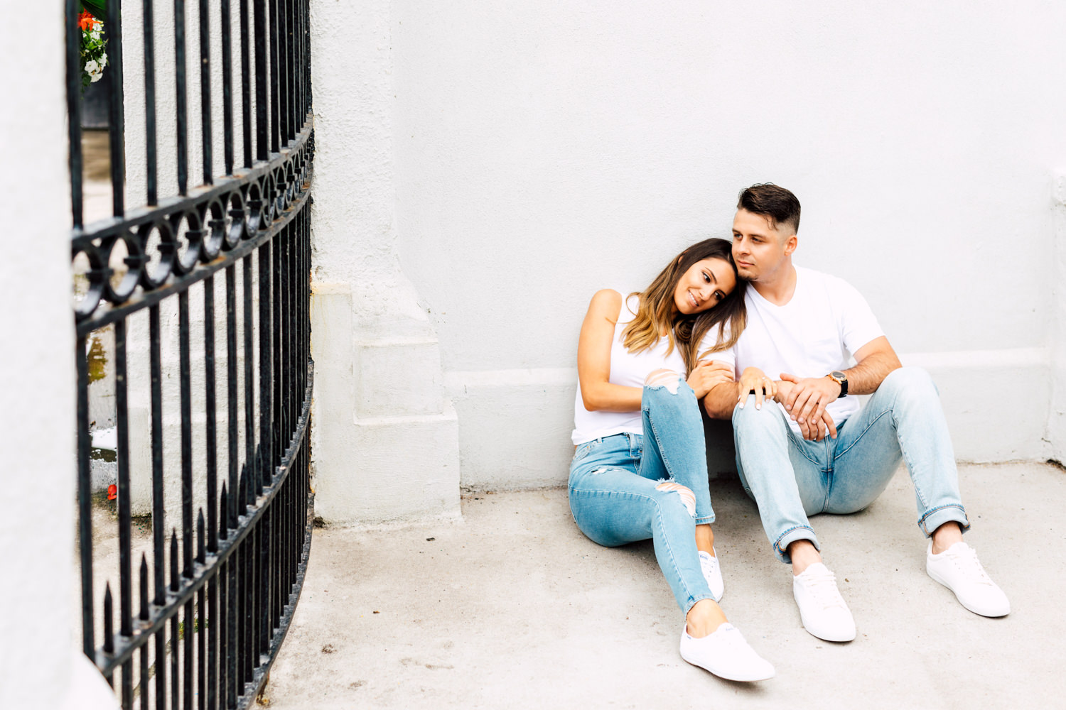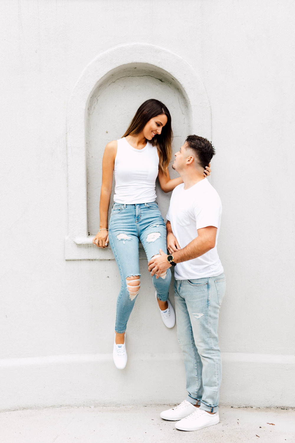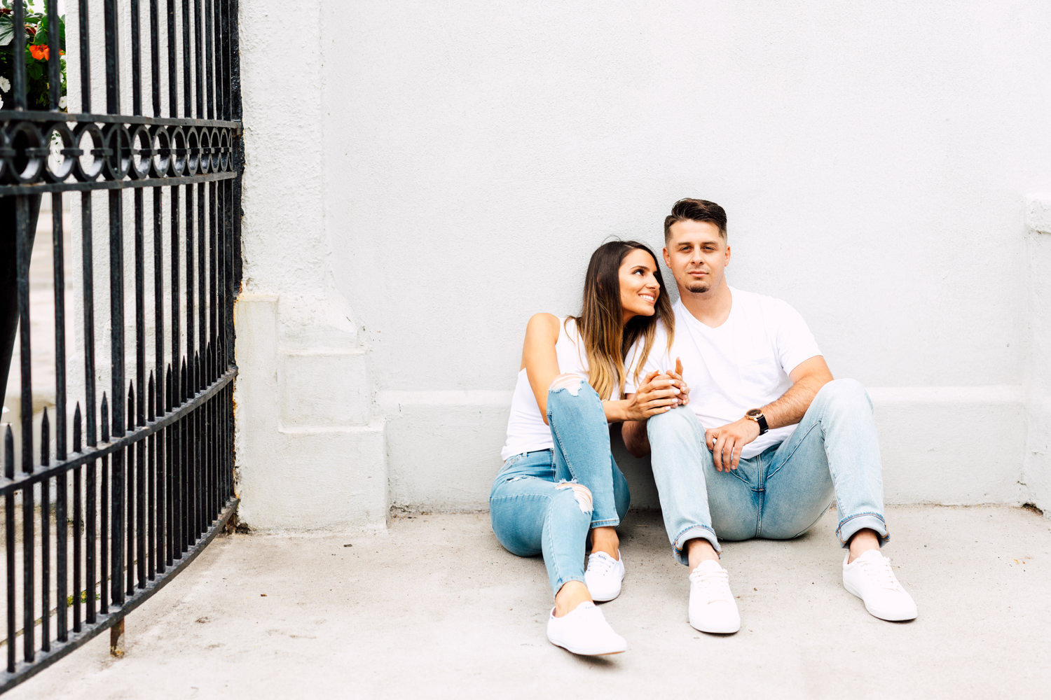 Usually, we ask our couples to prepare 2 different outfits to change up the scene. For Ally and Mike’s engagement, they definitely played with what the venue could offer by having three outfits! It’s a beautiful canvas to play with colours, like Ally’s bright red top and Mike’s blue blazer. We love how they pop out with all the white walls. Of course, you can never go wrong with the timeless elegance of neutrals! Blending in is just as good as standing out, and Ally looked like a goddess with her white dress! Of course, how can we not talk about their matching jeans and white sneakers outfits. This fashionable couple could pull off anything!