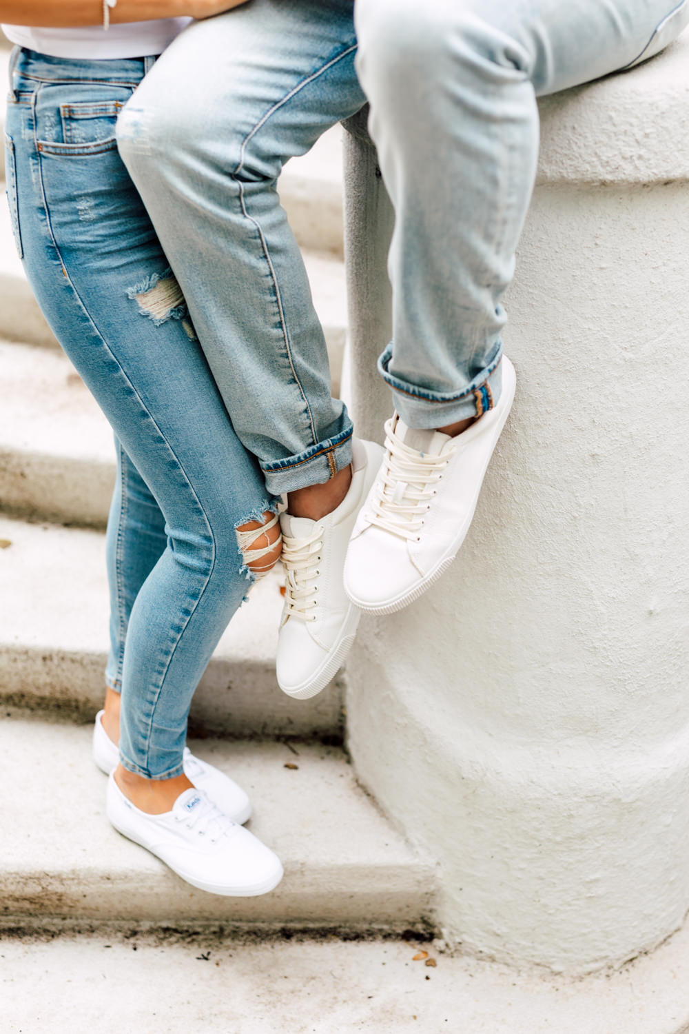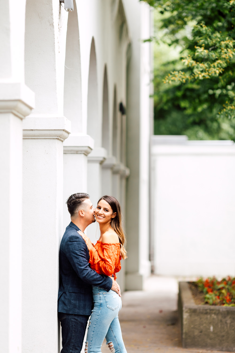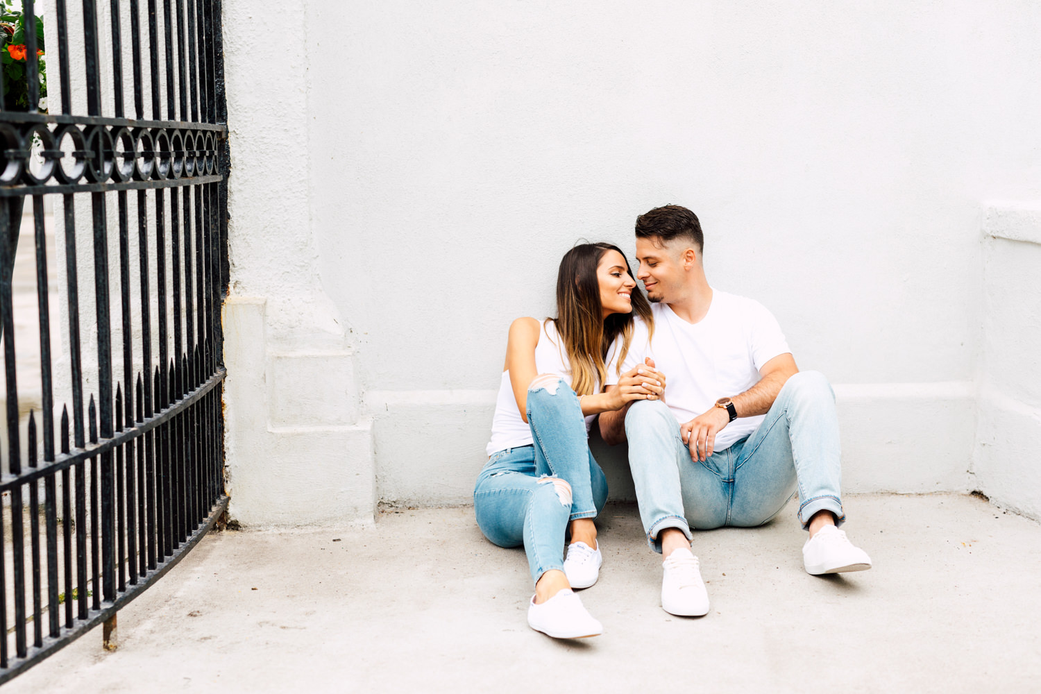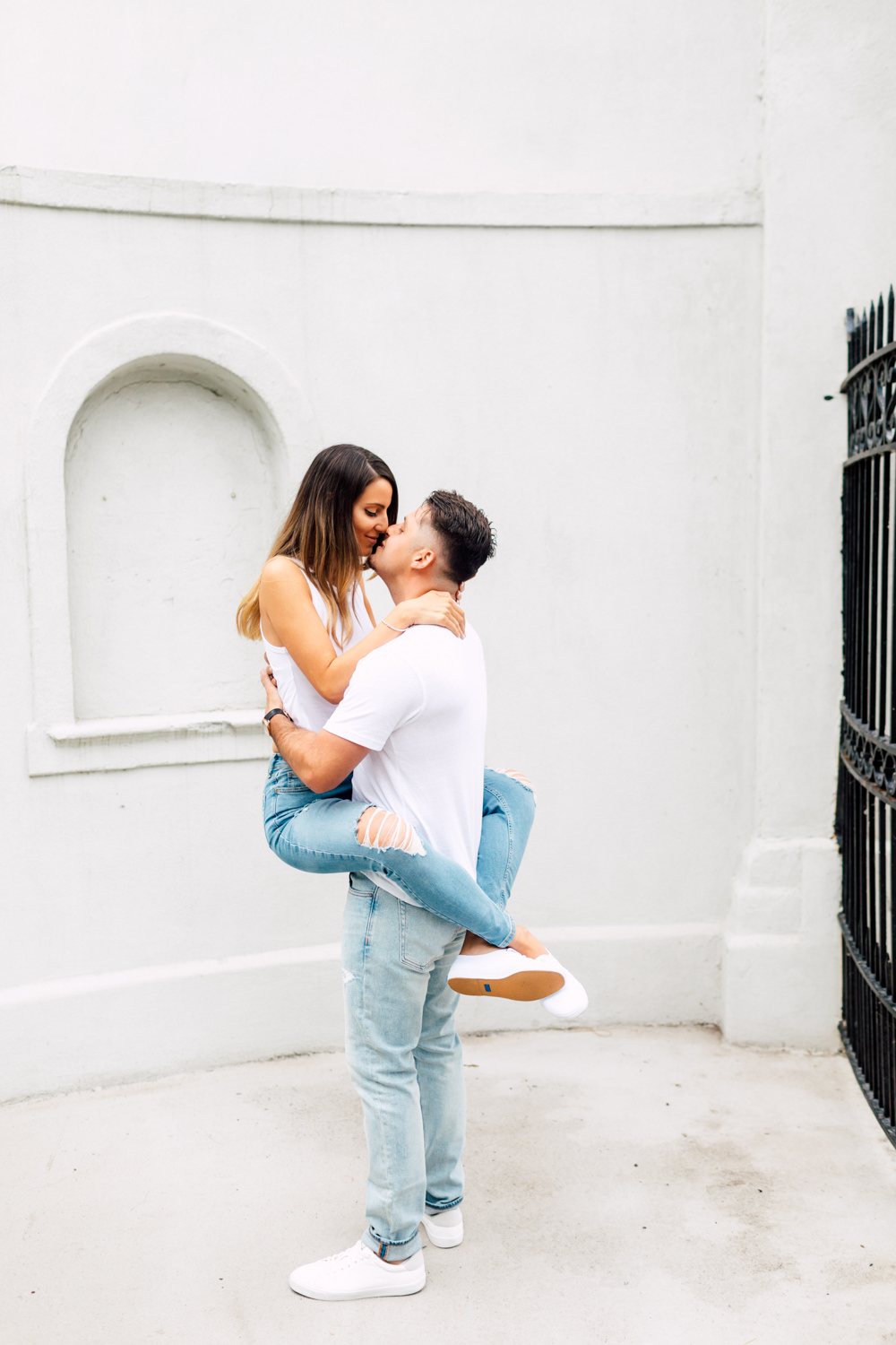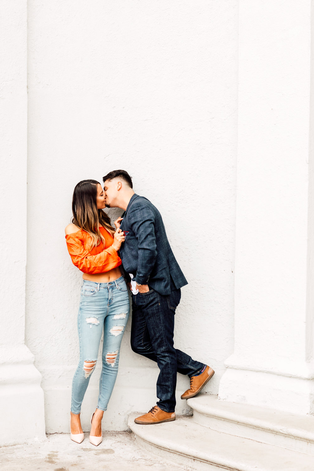 Usually, we ask our couples to prepare 2 different outfits to change up the scene. For Ally and Mike’s engagement, they definitely played with what the venue could offer by having three outfits! It’s a beautiful canvas to play with colours, like Ally’s bright red top and Mike’s blue blazer. We love how they pop out with all the white walls. Of course, you can never go wrong with the timeless elegance of neutrals! Blending in is just as good as standing out, and Ally looked like a goddess with her white dress! Of course, how can we not talk about their matching jeans and white sneakers outfits. This fashionable couple could pull off anything!