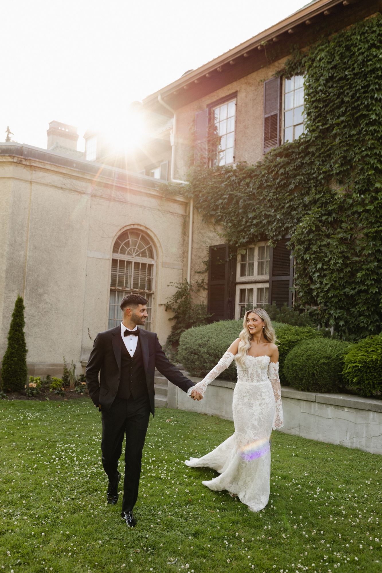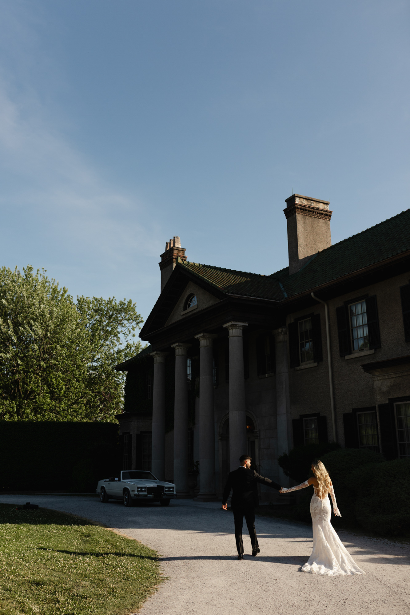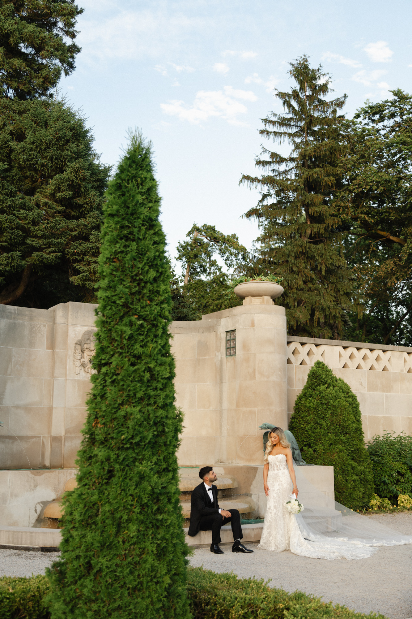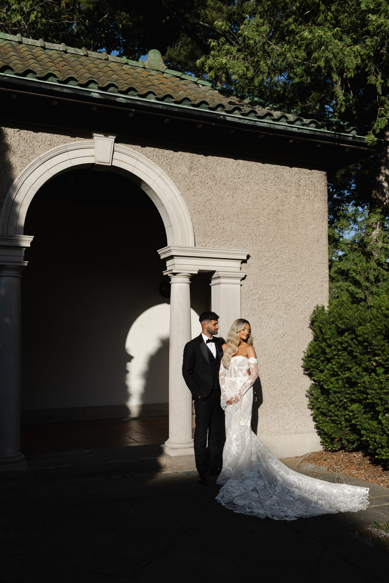 After their wedding day, they chose to step back into their bridal looks and celebrate again in a more relaxed, creatively driven setting. Set against the historic architecture and manicured grounds of Parkwood Estate in Oshawa, their session took place during the sought after golden hour light turning every frame into something cinematic. Post-wedding photoshoots are another opportunity to create polished, story-driven imagery you’ll treasure forever.