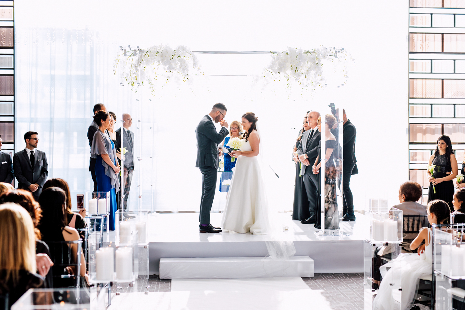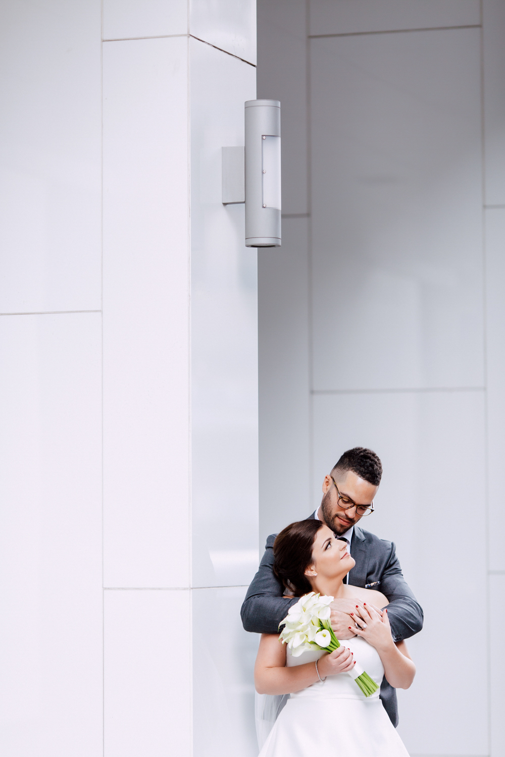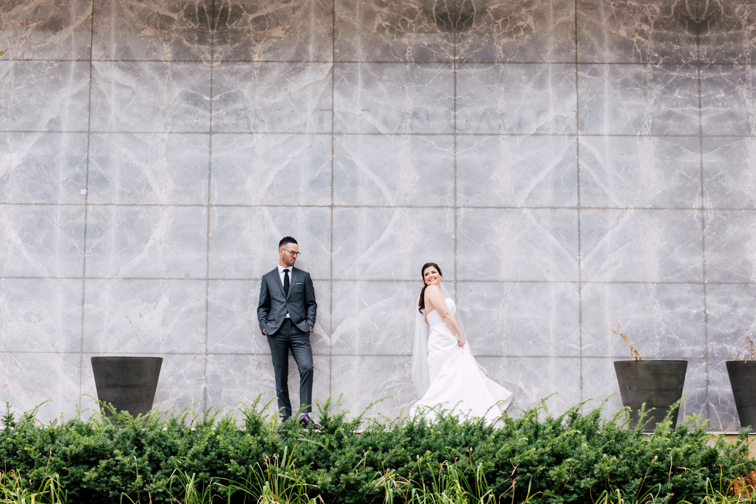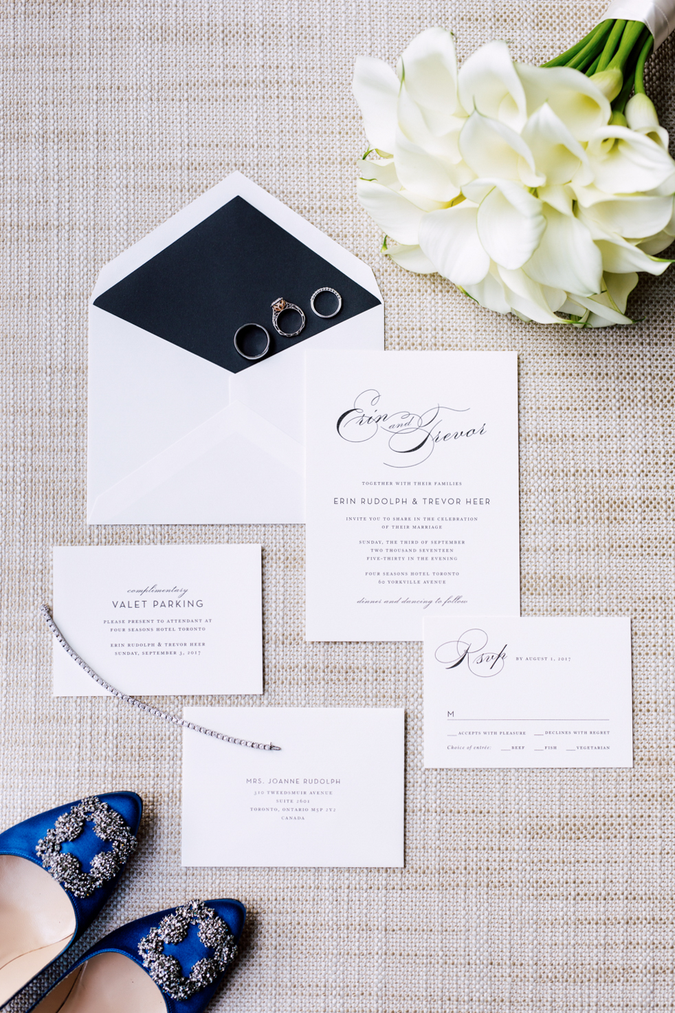 From the beginning, Erin knew she wanted a clean and simple look, preferring shades over colours. Of course, she used Pinterest and Instagram to draw inspiration from. Who doesn’t? It’s no surprise that their wedding took place at the luxurious Four Seasons Toronto Hotel – the perfect venue for a modern take on timeless elegance. They each had their own rooms to get ready in with their friends and family before the first reveal.