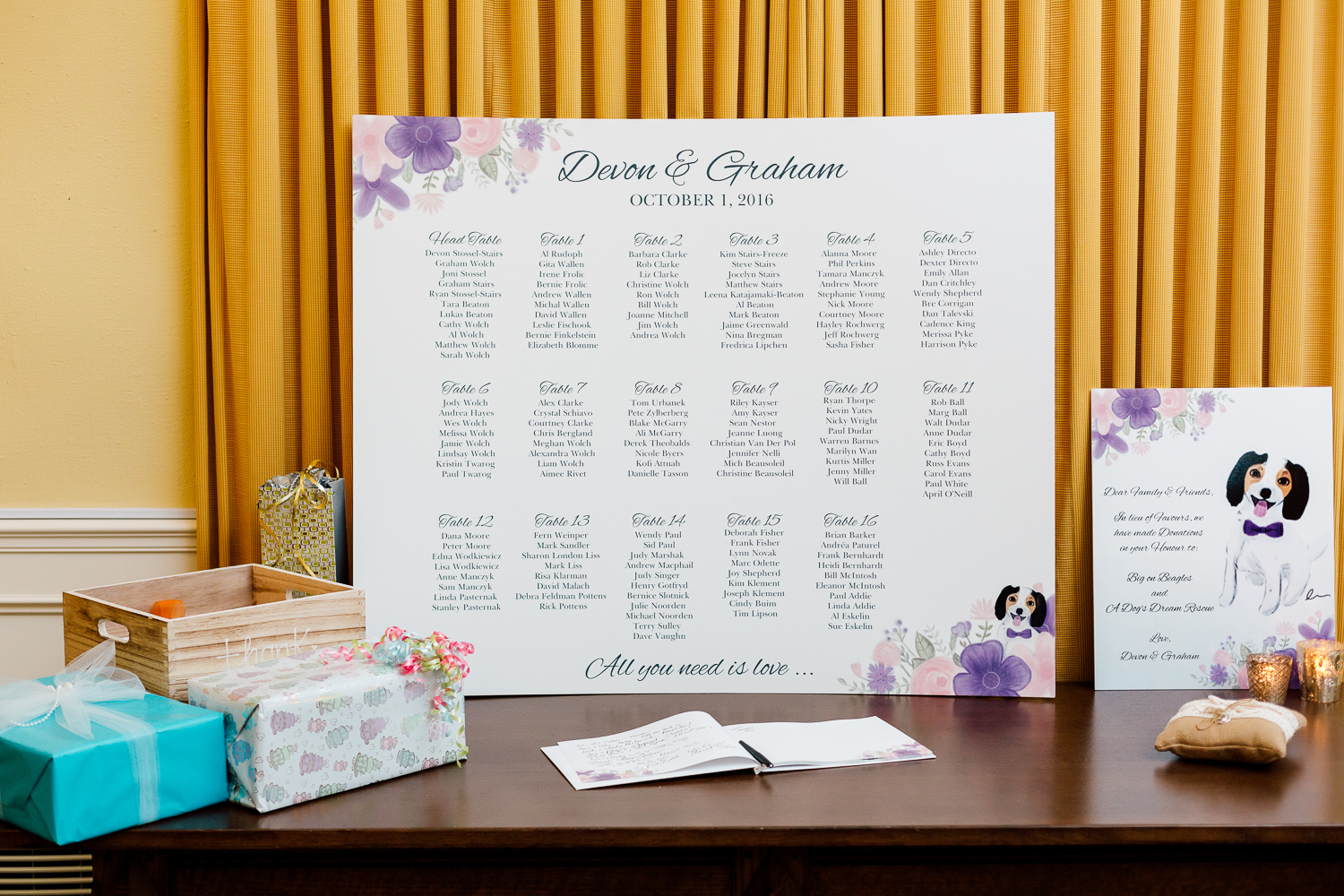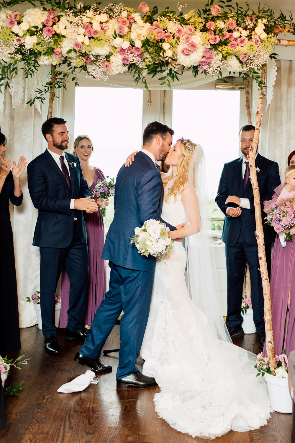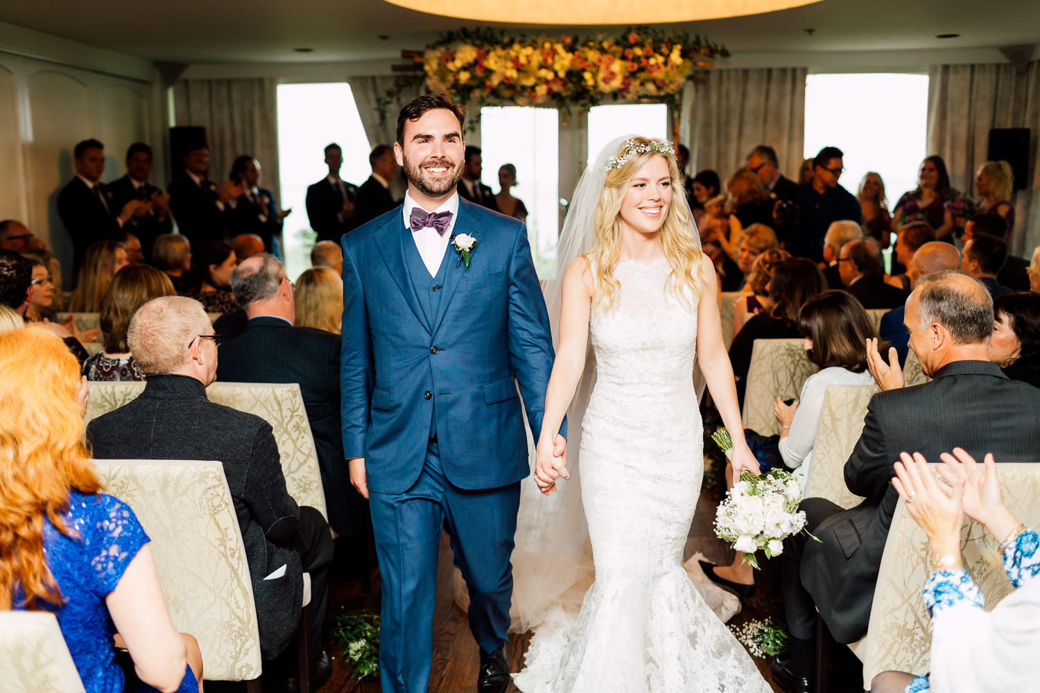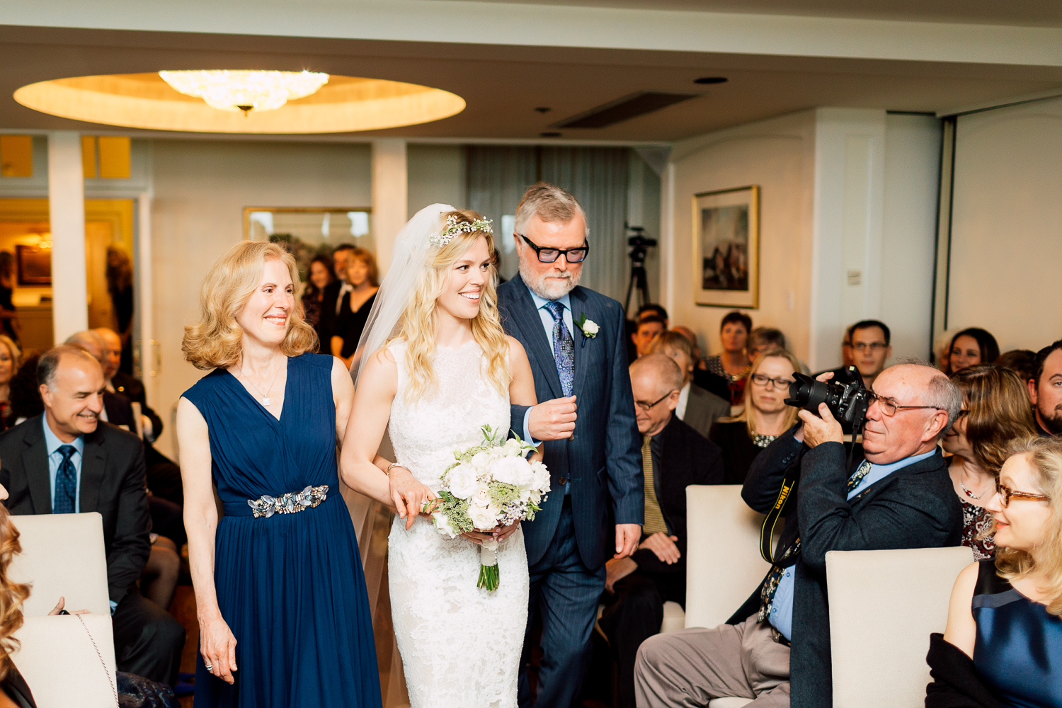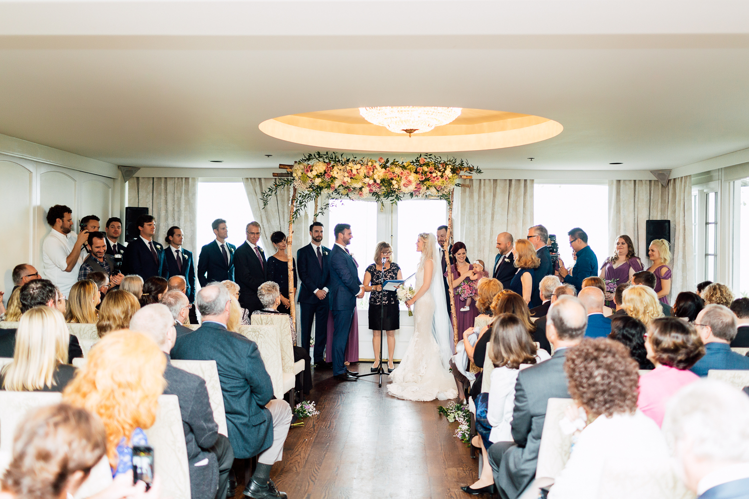 The Toronto Hunt Club is an exclusive venue in Scarborough that offers a stunning cliffside view of the lake. We were lucky to have been able to spend time in the beautiful outdoors for portraits before the rain started to fall. Rain on the wedding day never brings us down, and it shouldn’t cause you to frown either! These tend to be our memorable weddings because we get reminded of what’s most important: celebrating the couple’s love. We celebrated Devon and Graham’s union inside the Hunt Club. With how gorgeous everything fell together for their ceremony, we forgot that there was even an outside. As planned, their too cute for words canine practically rushed down the aisle as the ring barrier, just as excited as everyone in the room.